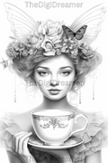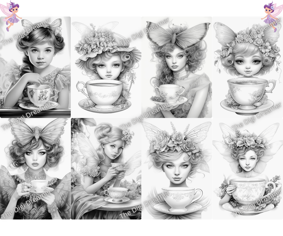 40 Teetassen-Feen-Set 2-Graustufen druckbare Malseiten für Erwachsene, digitaler Download