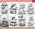 Bugs and Mushrooms-Grayscale Printable Coloring Pages, Digital Download