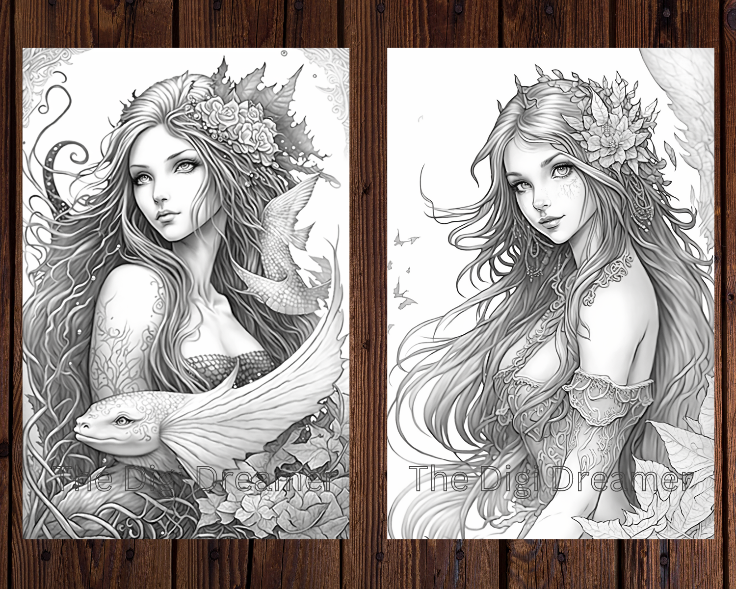 Fantasy Mermaids Grayscale Printable Coloring Pages for Adults
