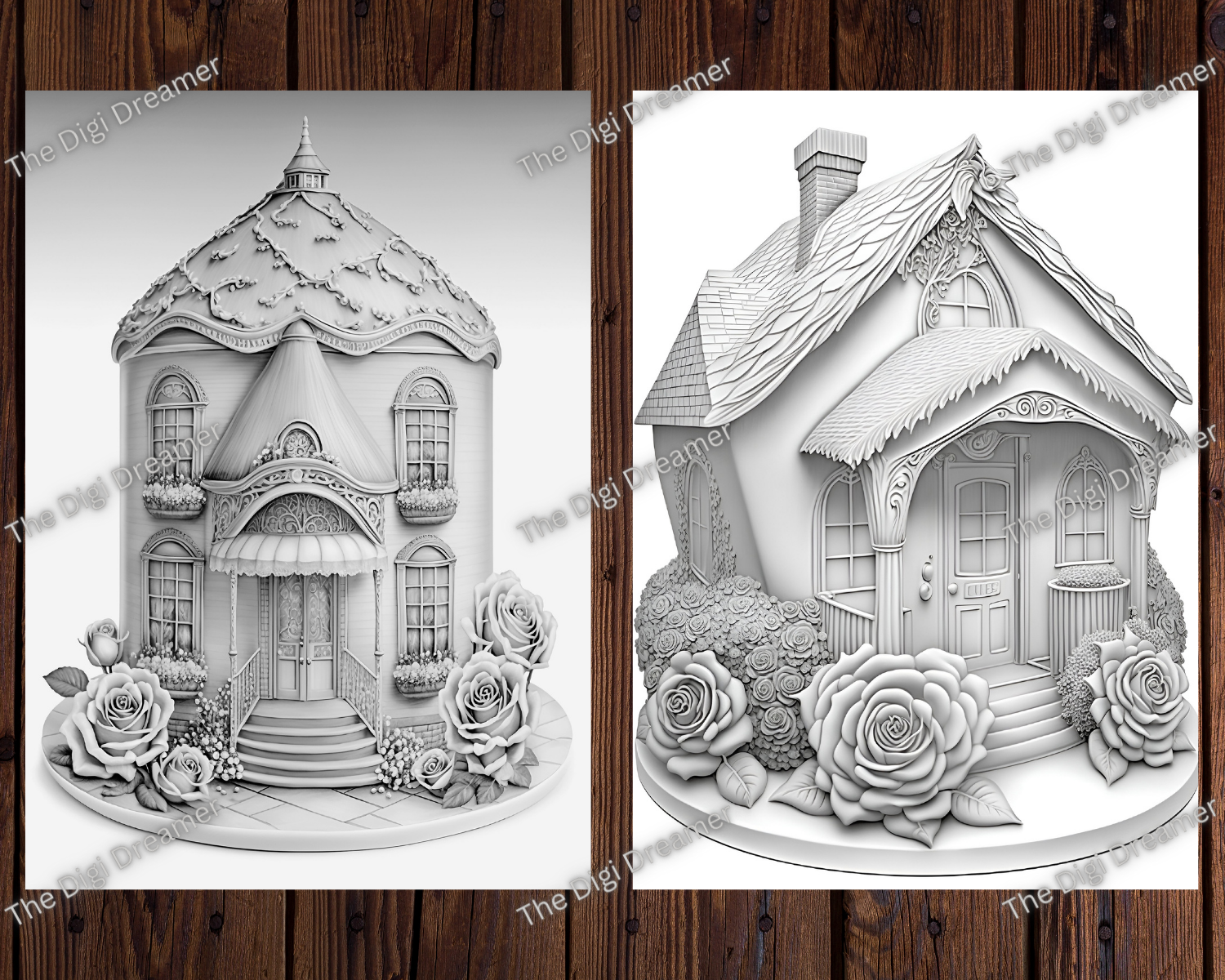 Magical Rose Garden Houses Grayscale Printable Coloring Pages For Adults