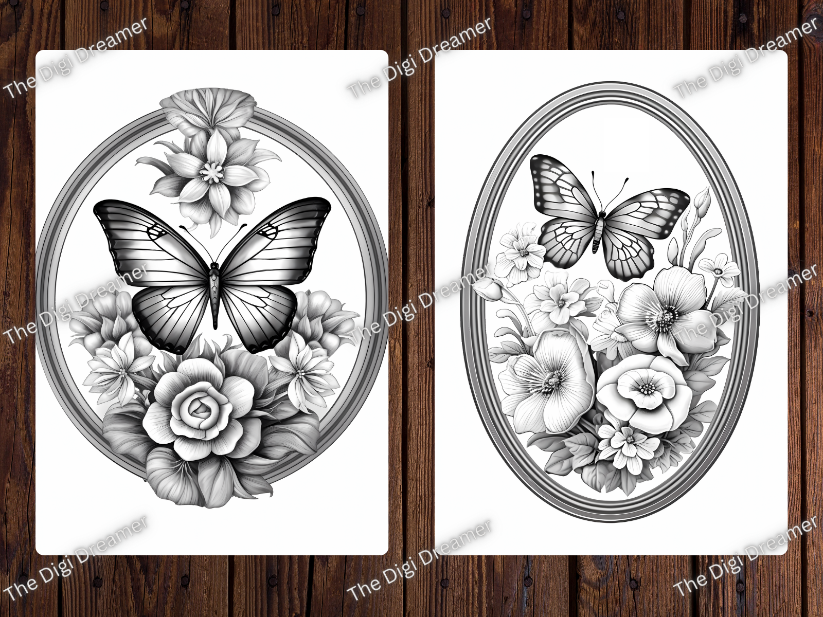 Mandala Flowers and Butterflies Grayscale Printable Coloring Pages