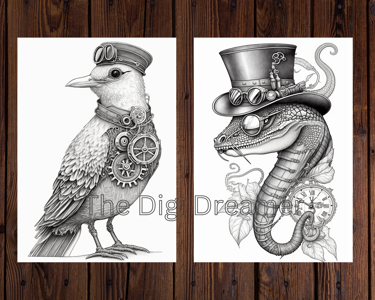 Enter the fascinating world of steampunk with these grayscale coloring pages featuring intricate steampunk animal designs. Each page features an illustration of a steampunk animal, with intricate gears, cogs, and mechanical details that make for a unique coloring experience. Add a touch of vintage charm and mechanical magic to your coloring routine with these grayscale steampunk animal coloring pages.