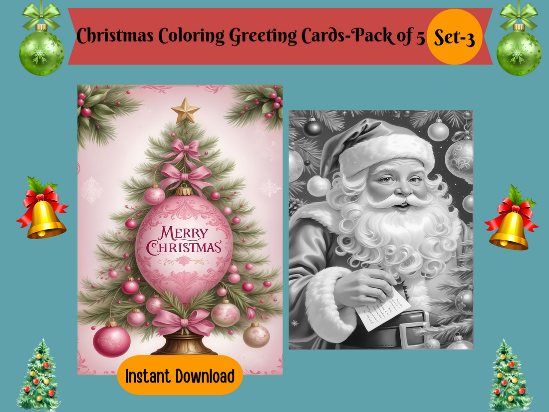 Christmas Coloring Greeting Cards Set 3-Pack of 5, Printable Greeting Cards, Digital Download