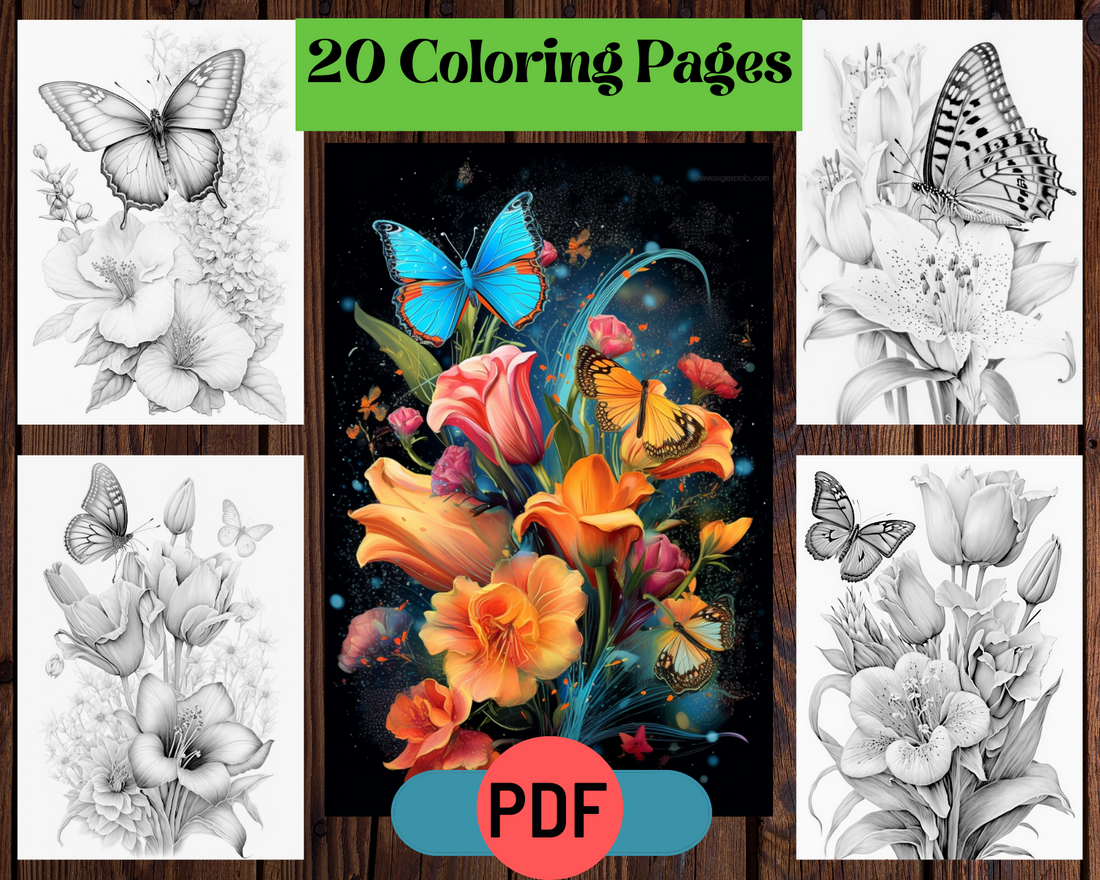 Flowers and Butterflies - Grayscale Printable Coloring Pages For Adults & Kids