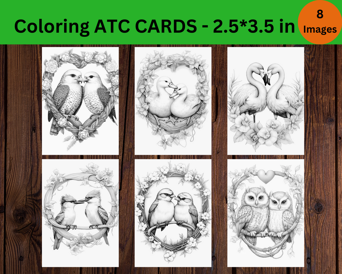 Lovey Dovey Birds Grayscale Coloring Digital ATC Cards, Instant Download