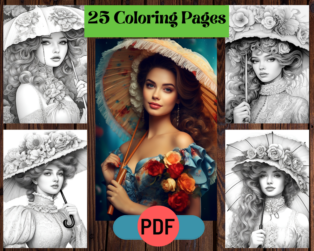 Beautiful Vintage Umbrella Girls Grayscale Coloring Pages