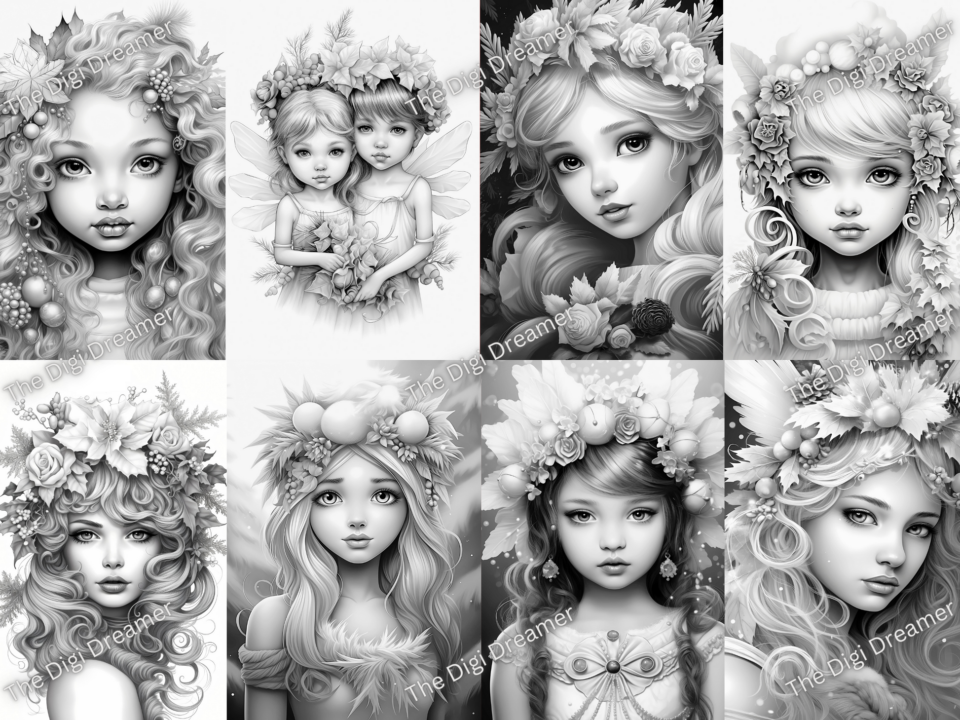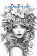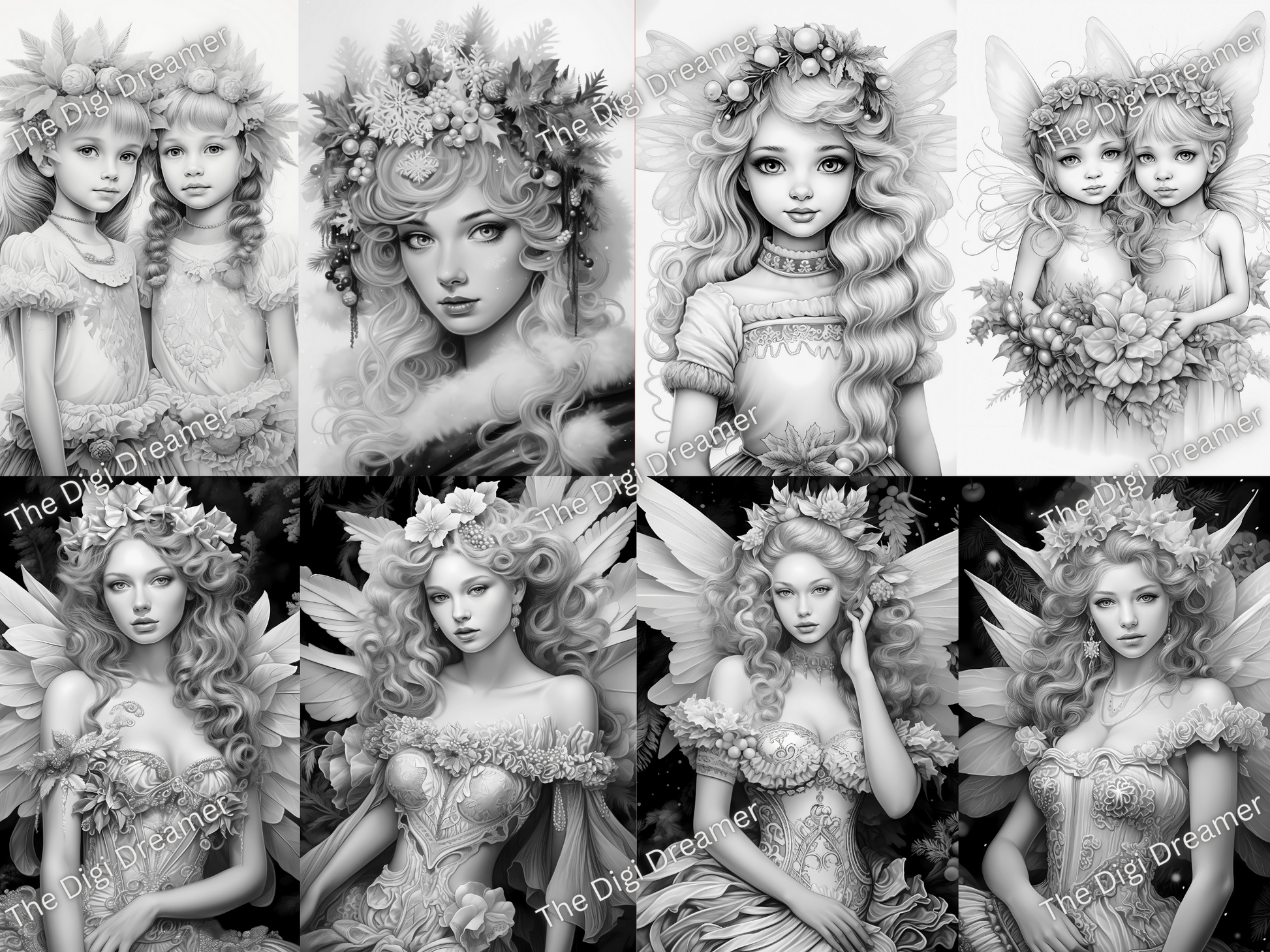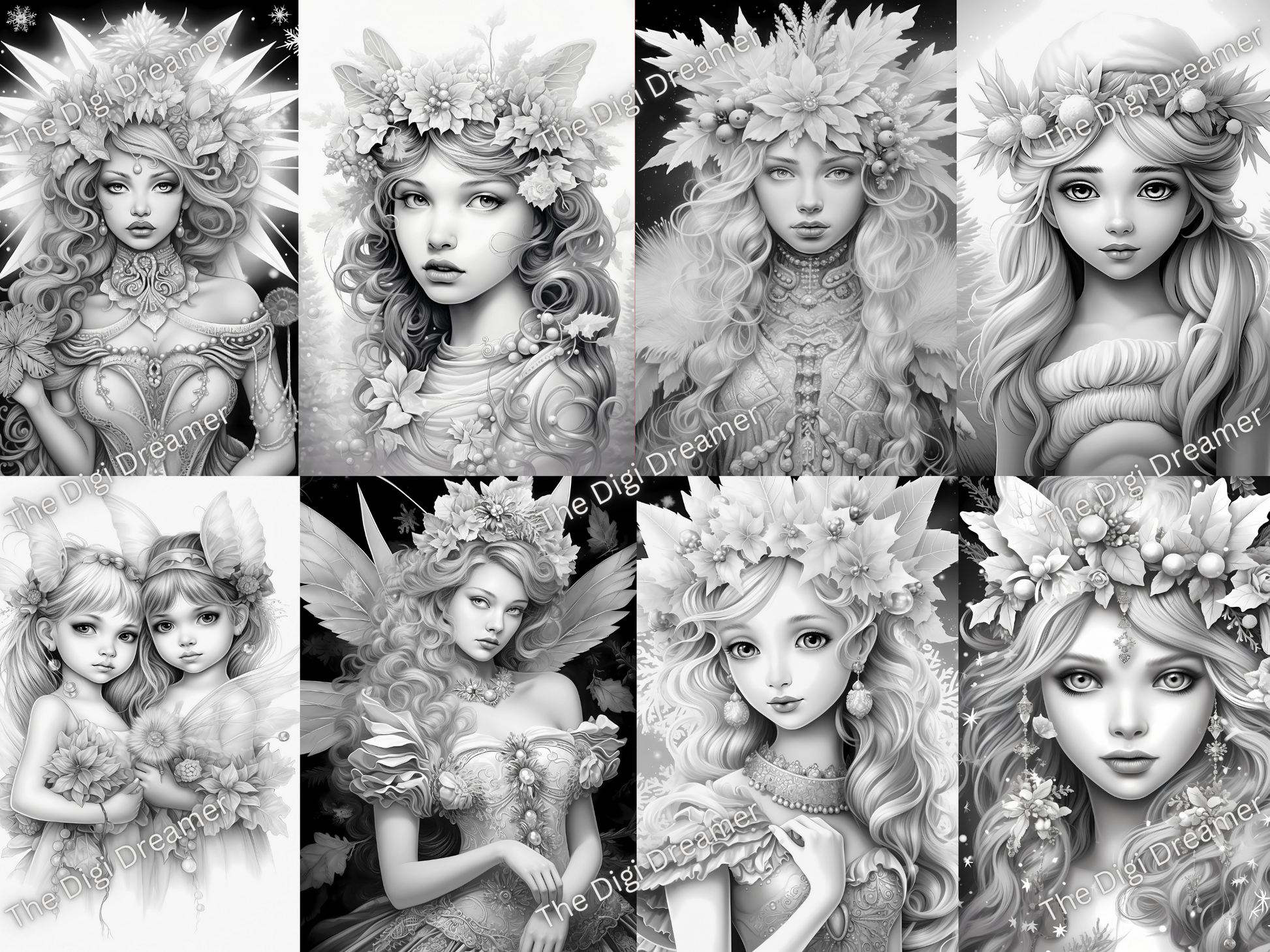 25 Snowflake fairies-Printable Grayscale Coloring Pages, Digital download