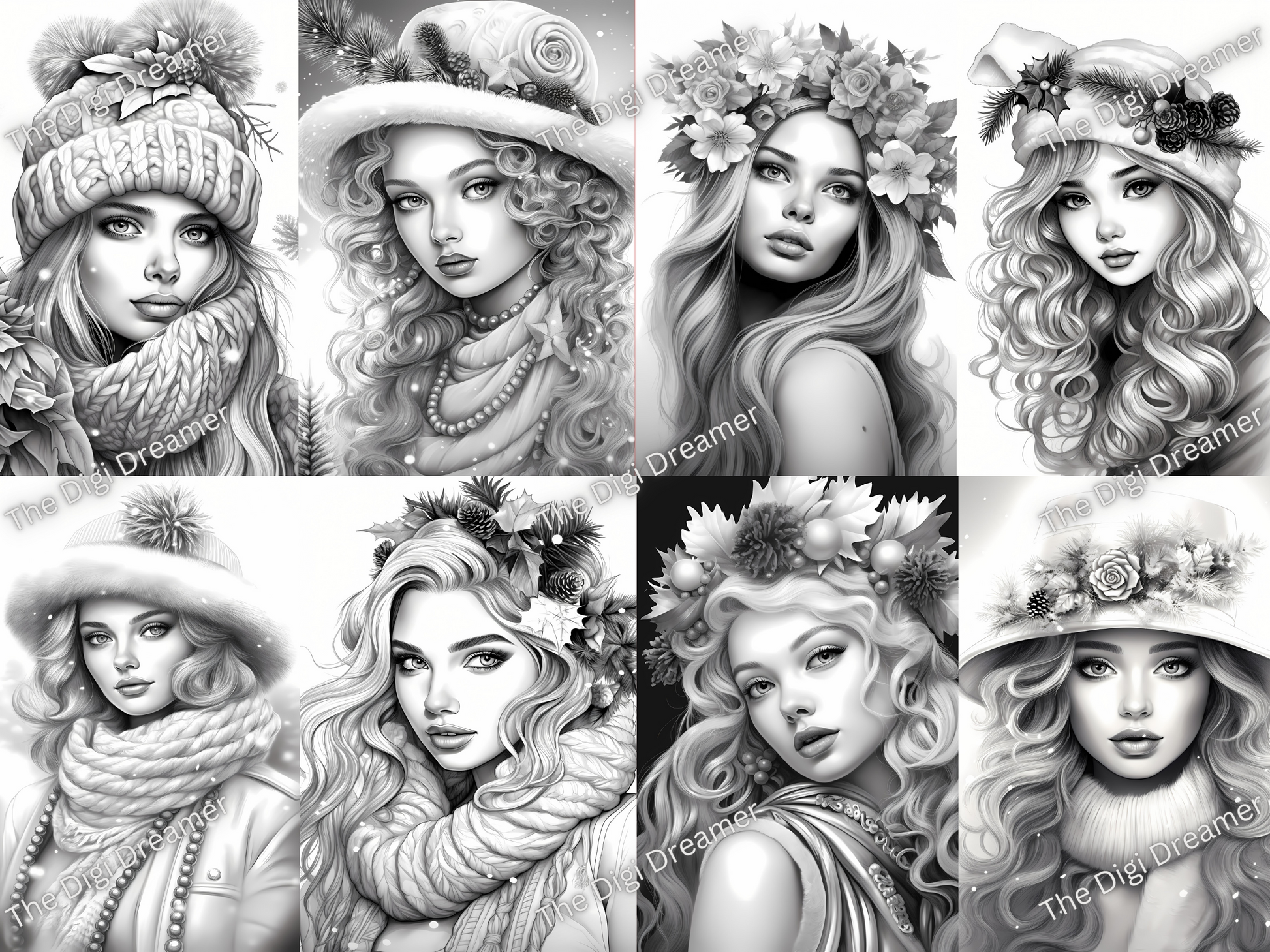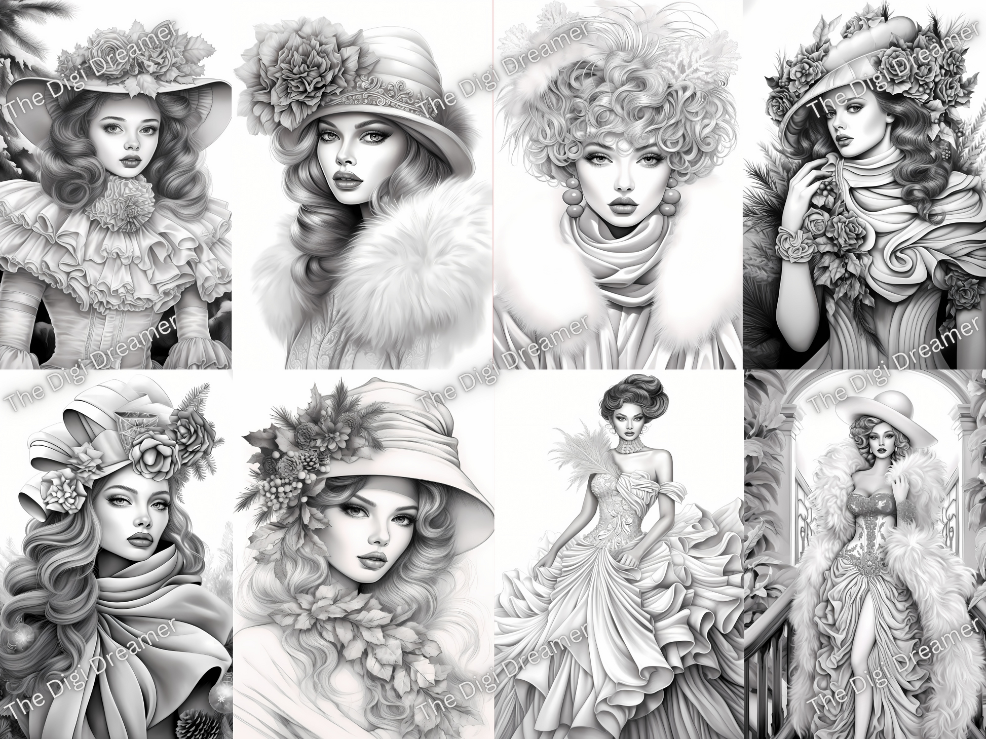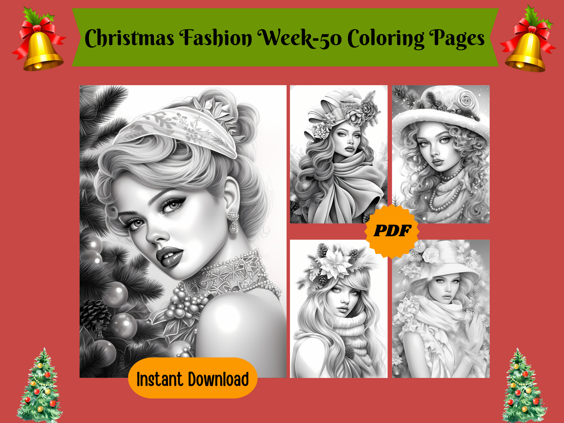 50 Christmas Fashion Week-Printable Grayscale Coloring Pages, Digital download