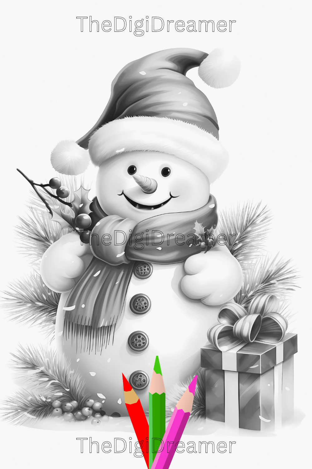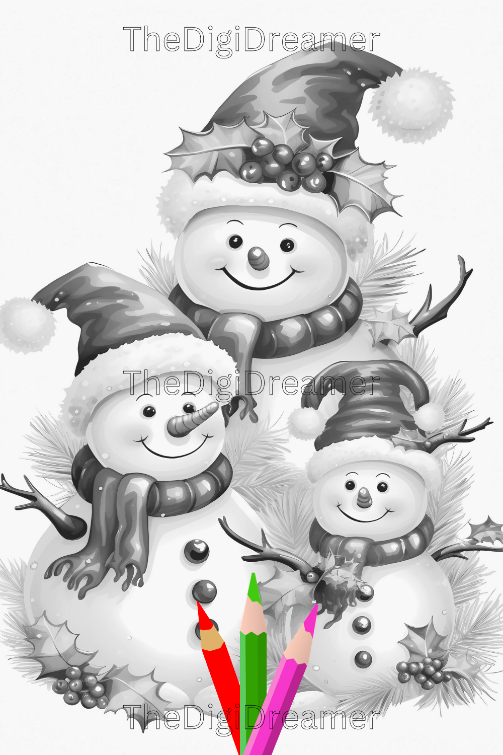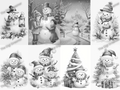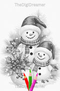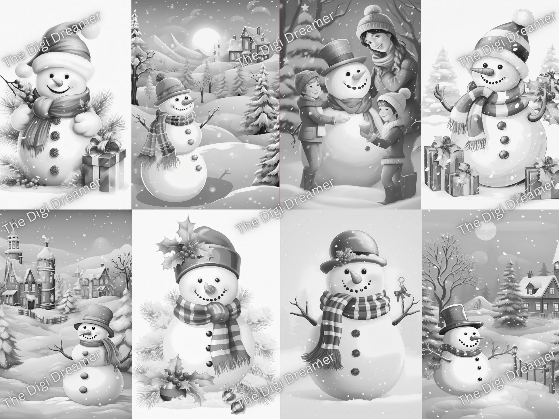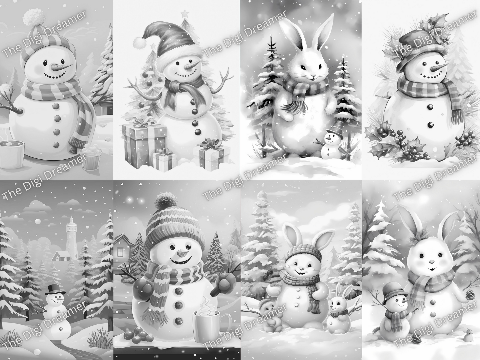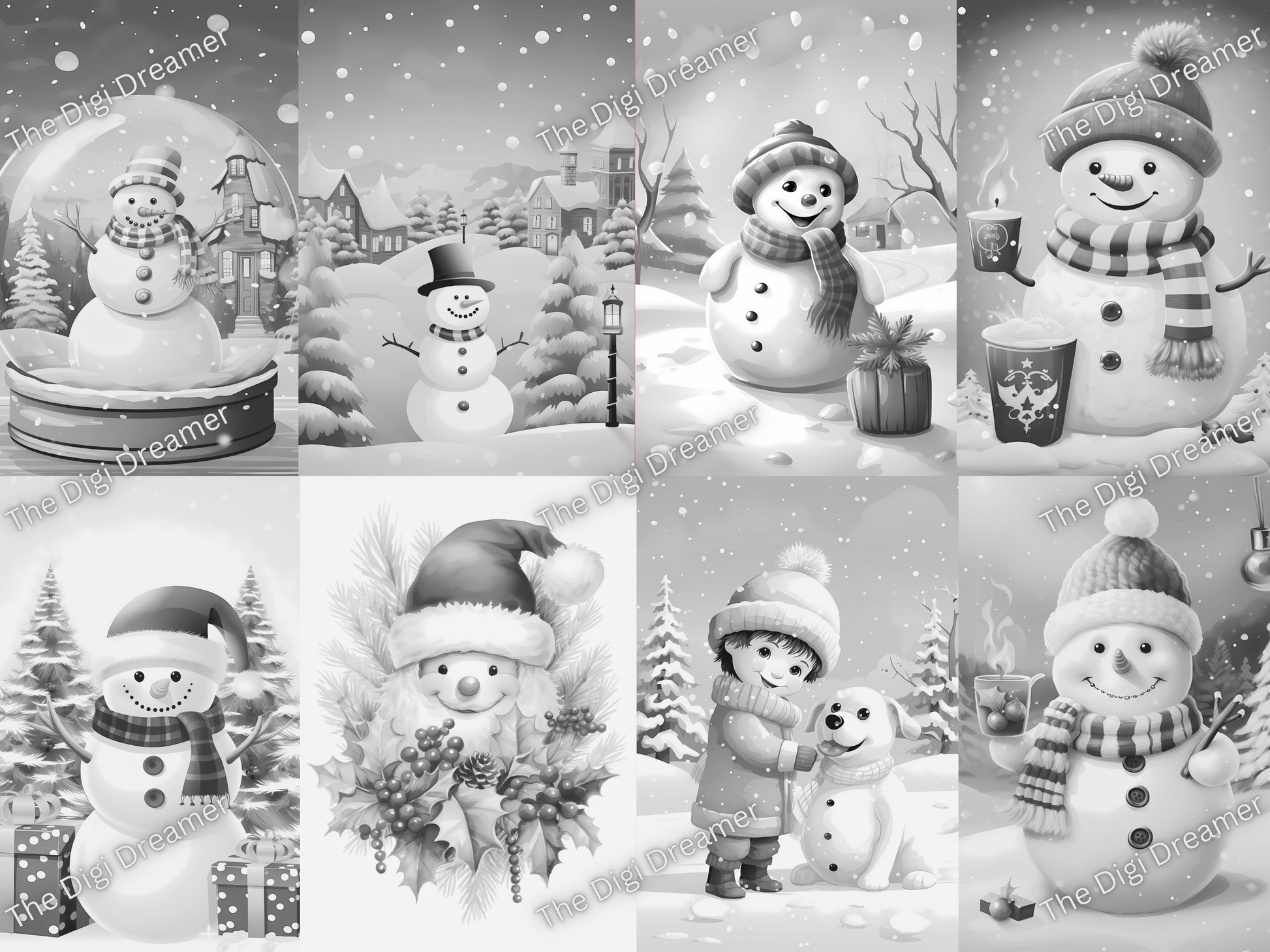 60 Christmas Snowmen Set 2-Printable Grayscale Coloring Pages, Digital download