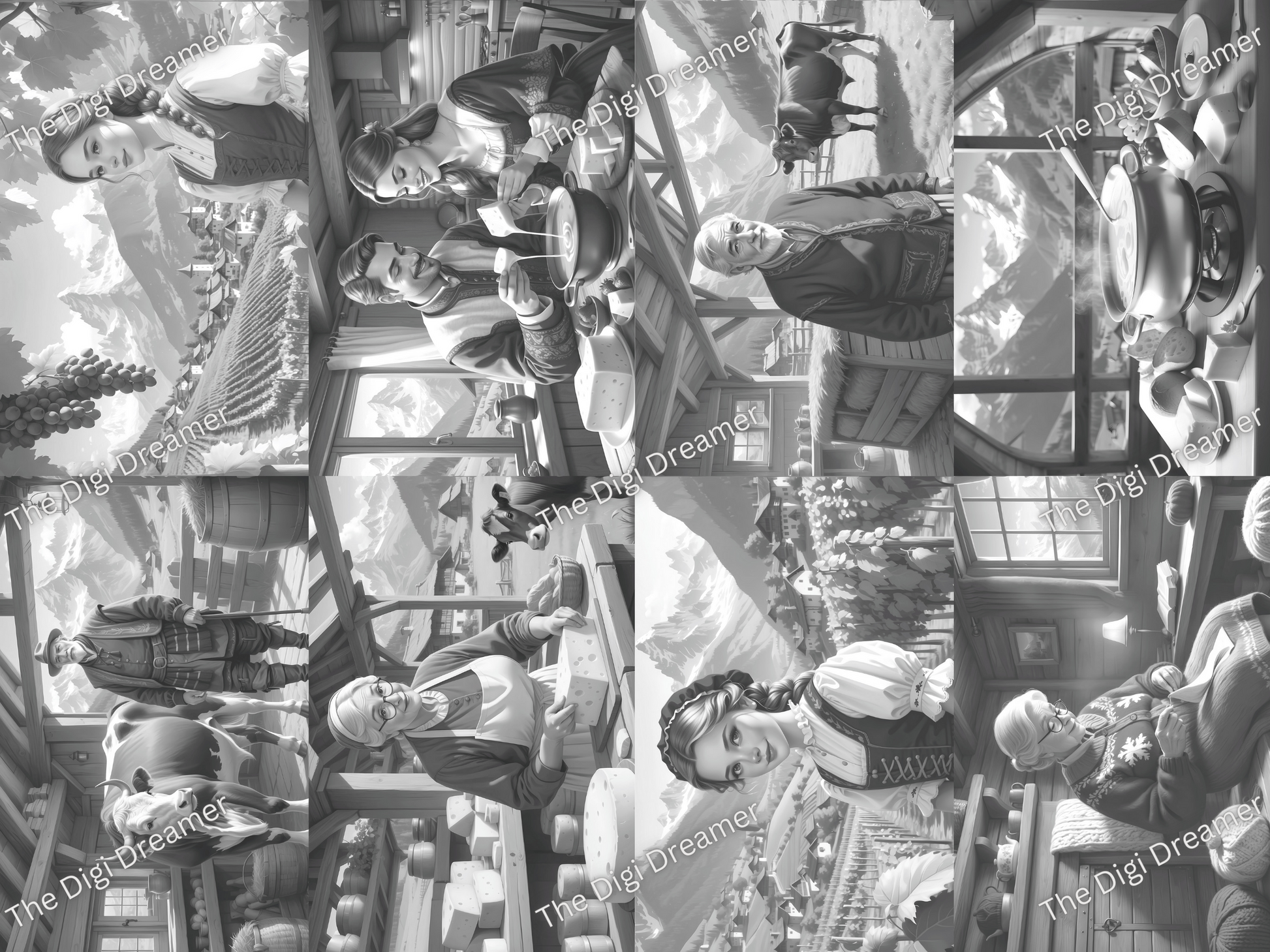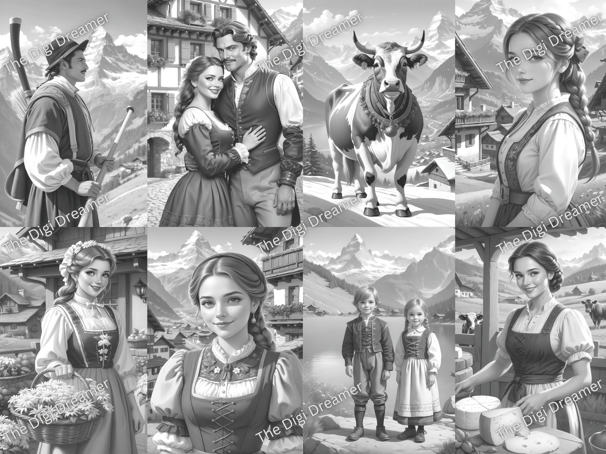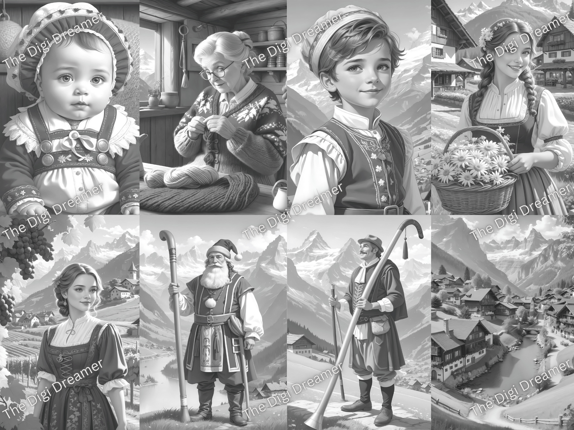 A Journey to Switzerland-60 Printable Grayscale Coloring Pages, Digital download