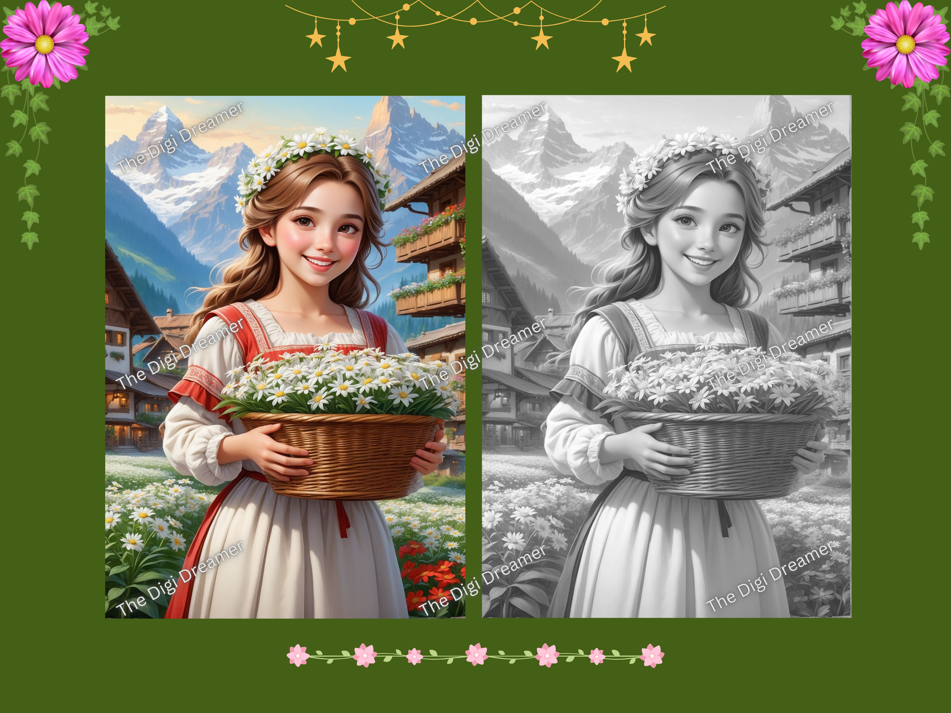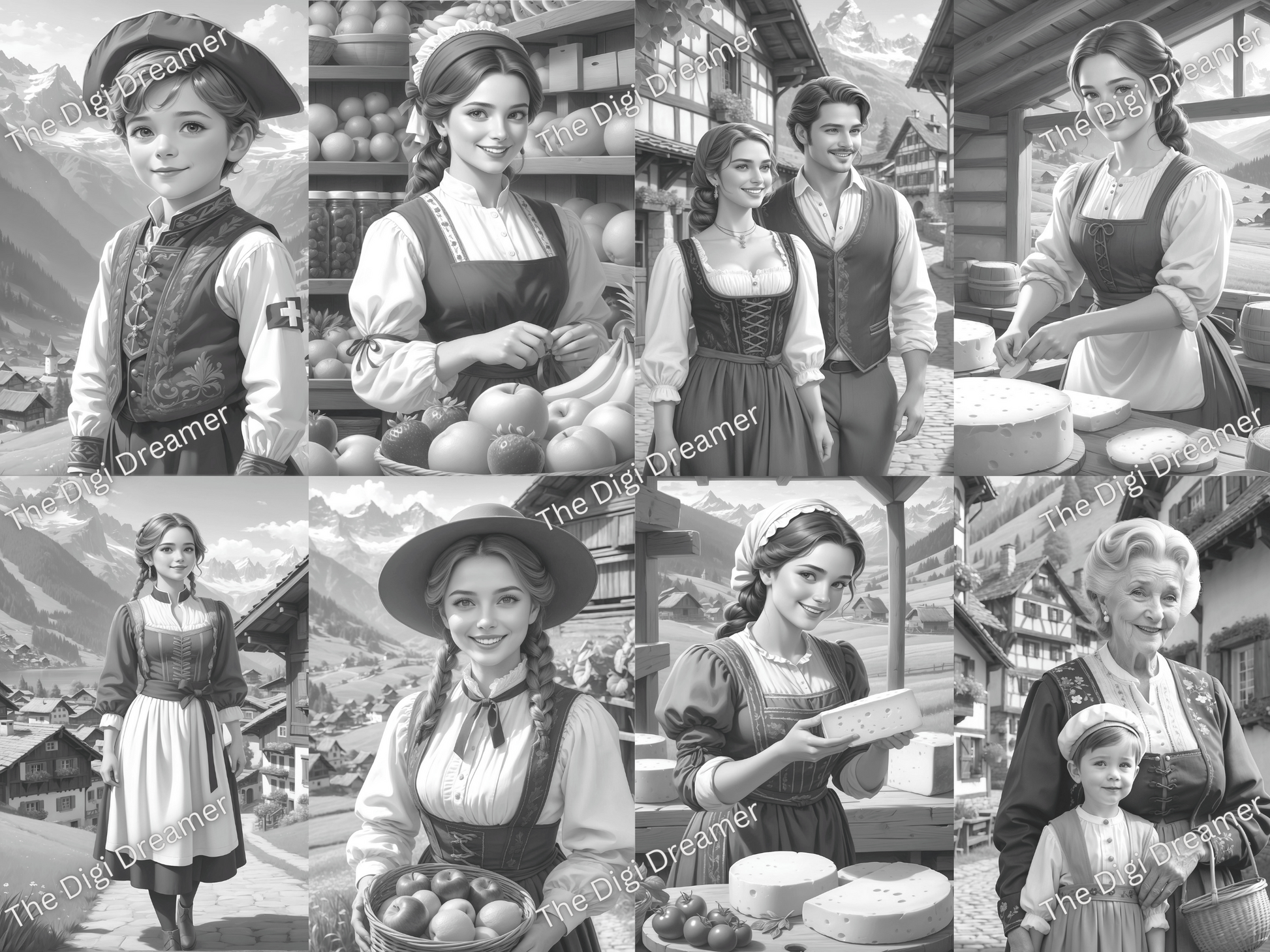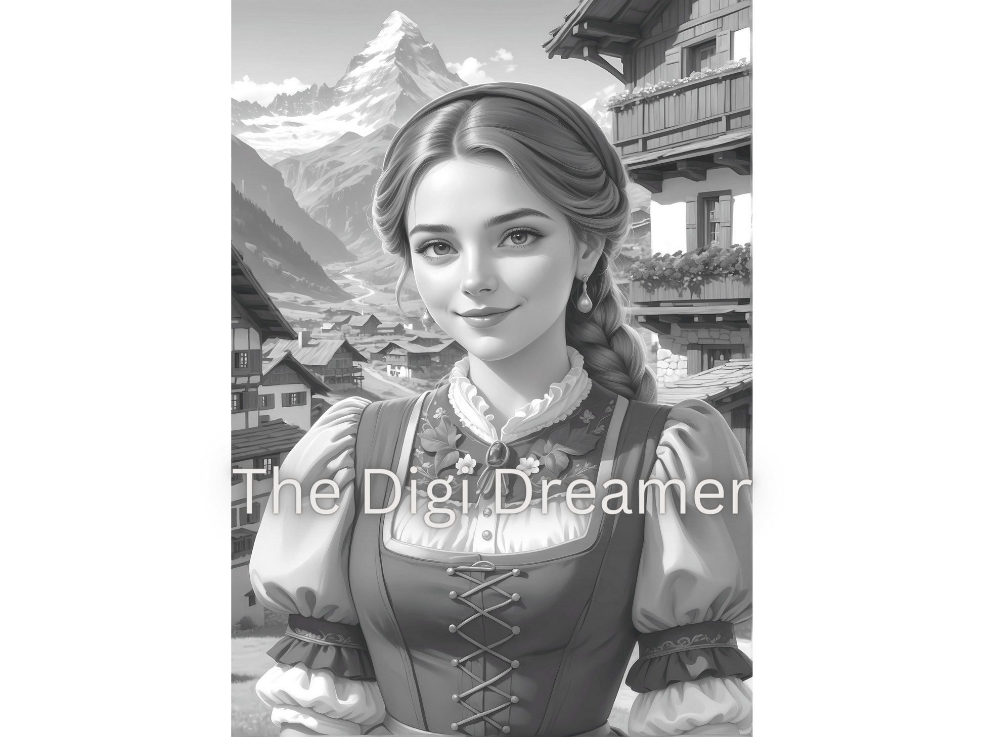 A Journey to Switzerland-60 Printable Grayscale Coloring Pages, Digital download