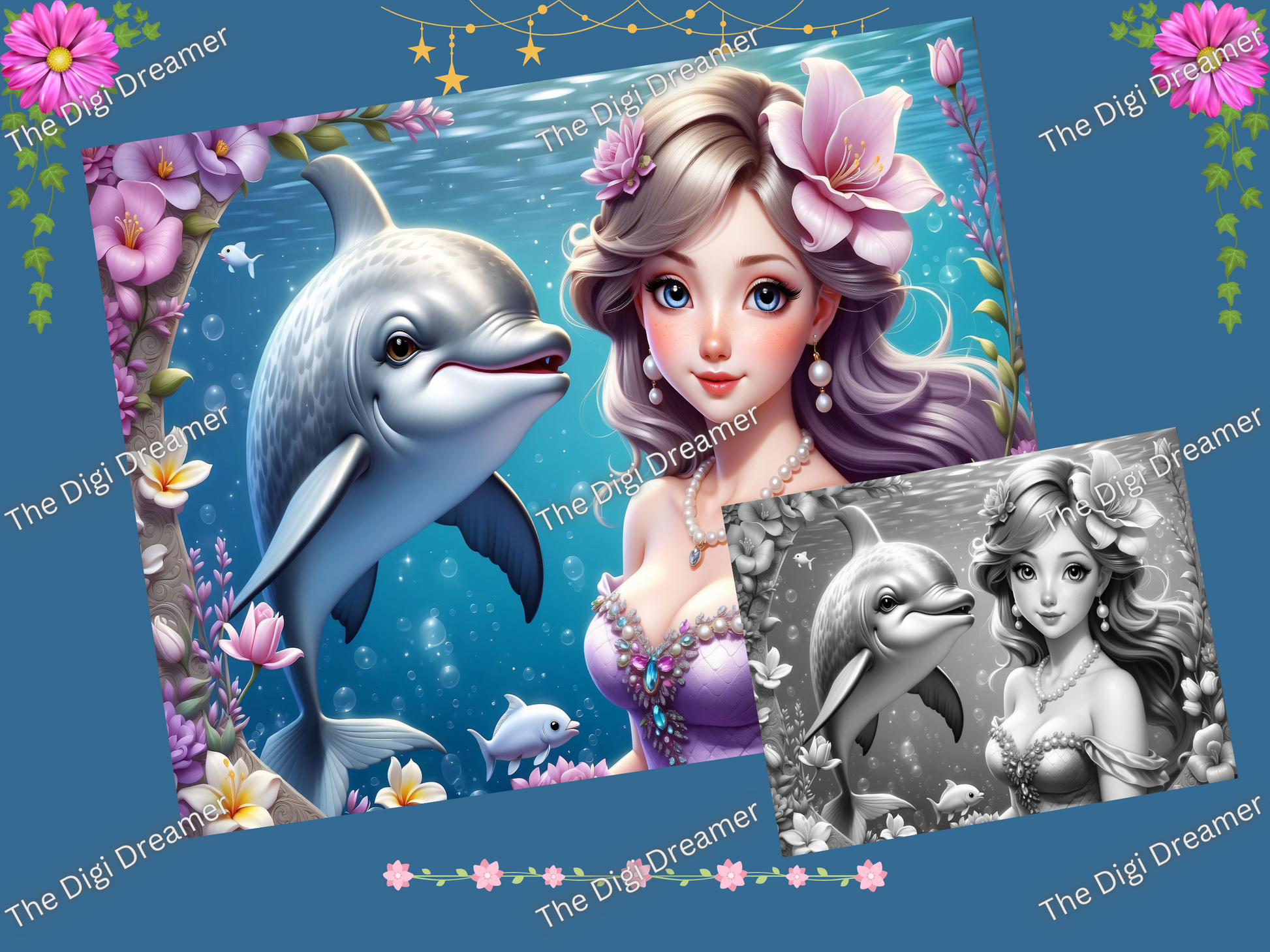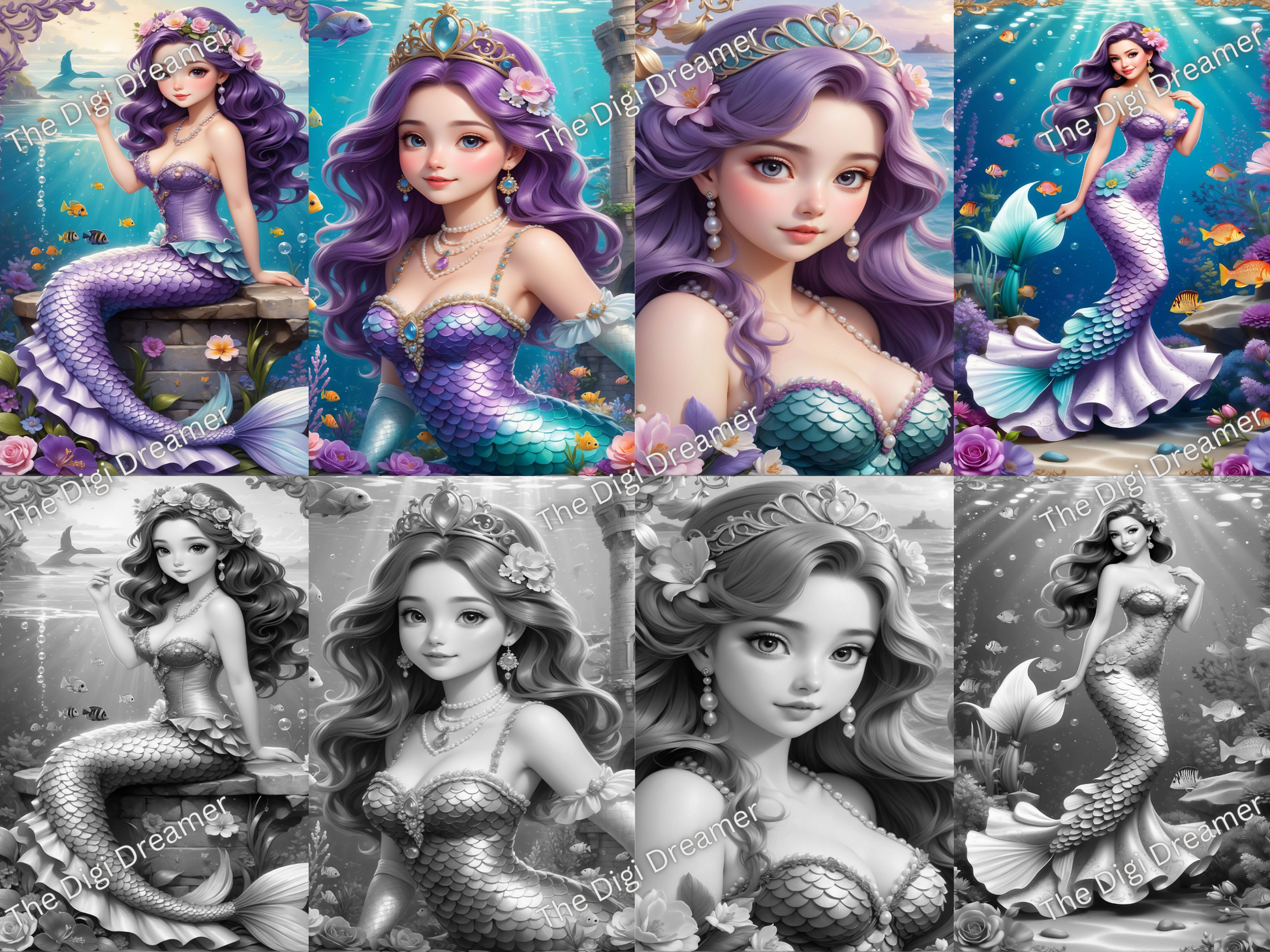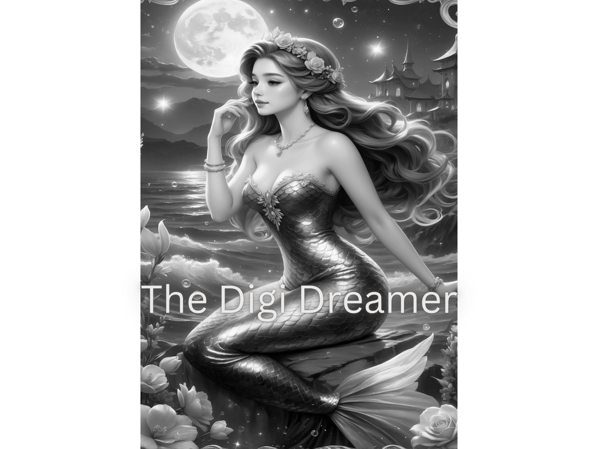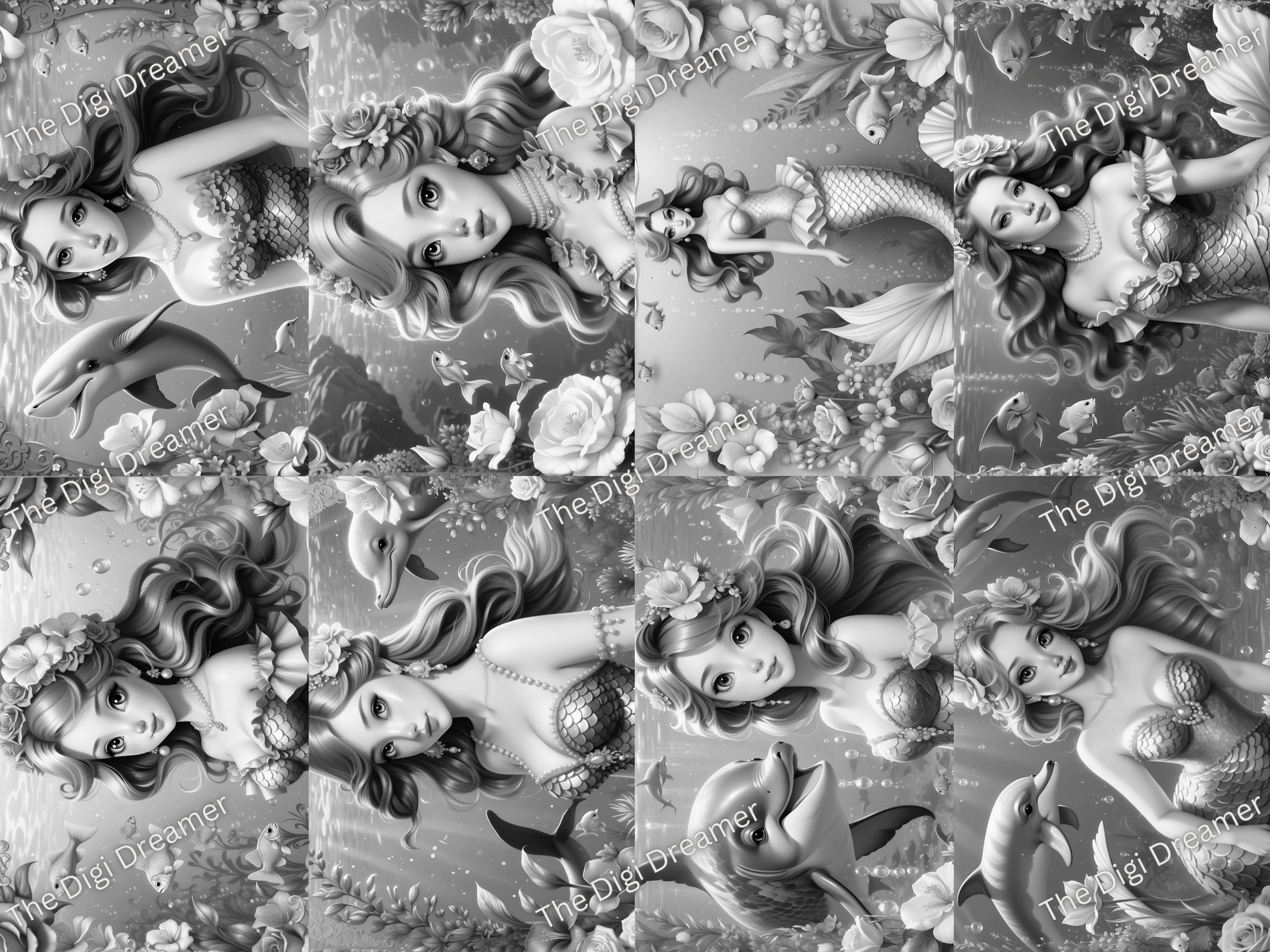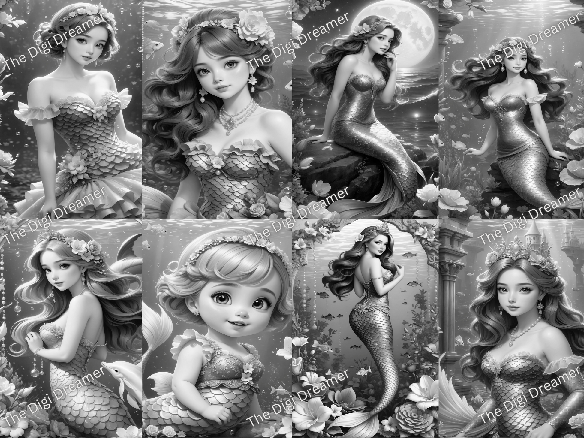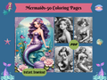 Beautiful Mermaids-50 Printable Grayscale Coloring Pages, Digital download