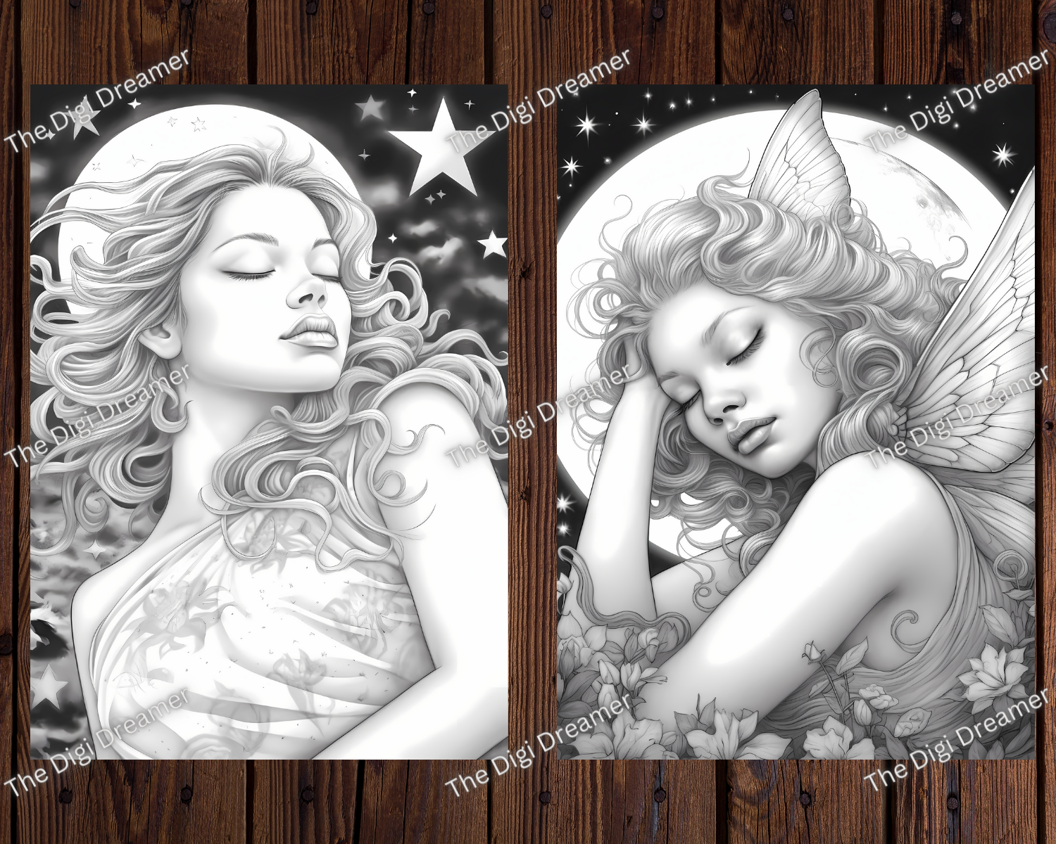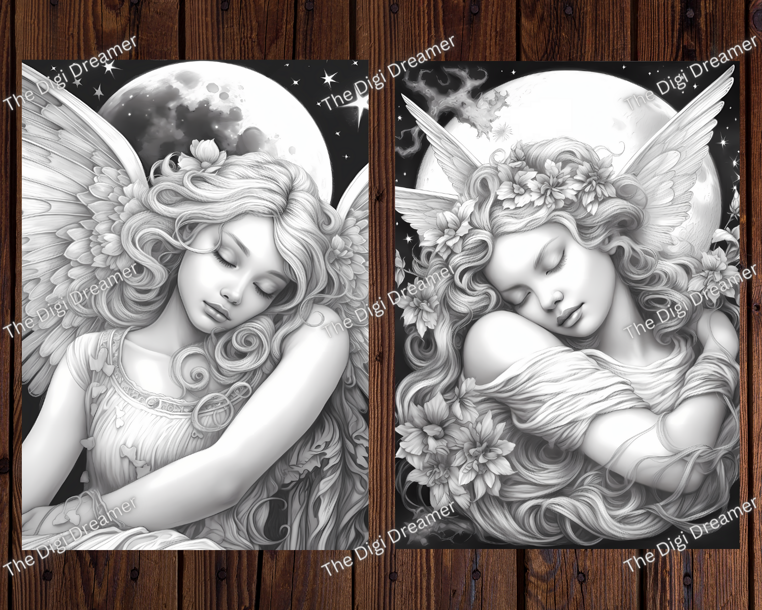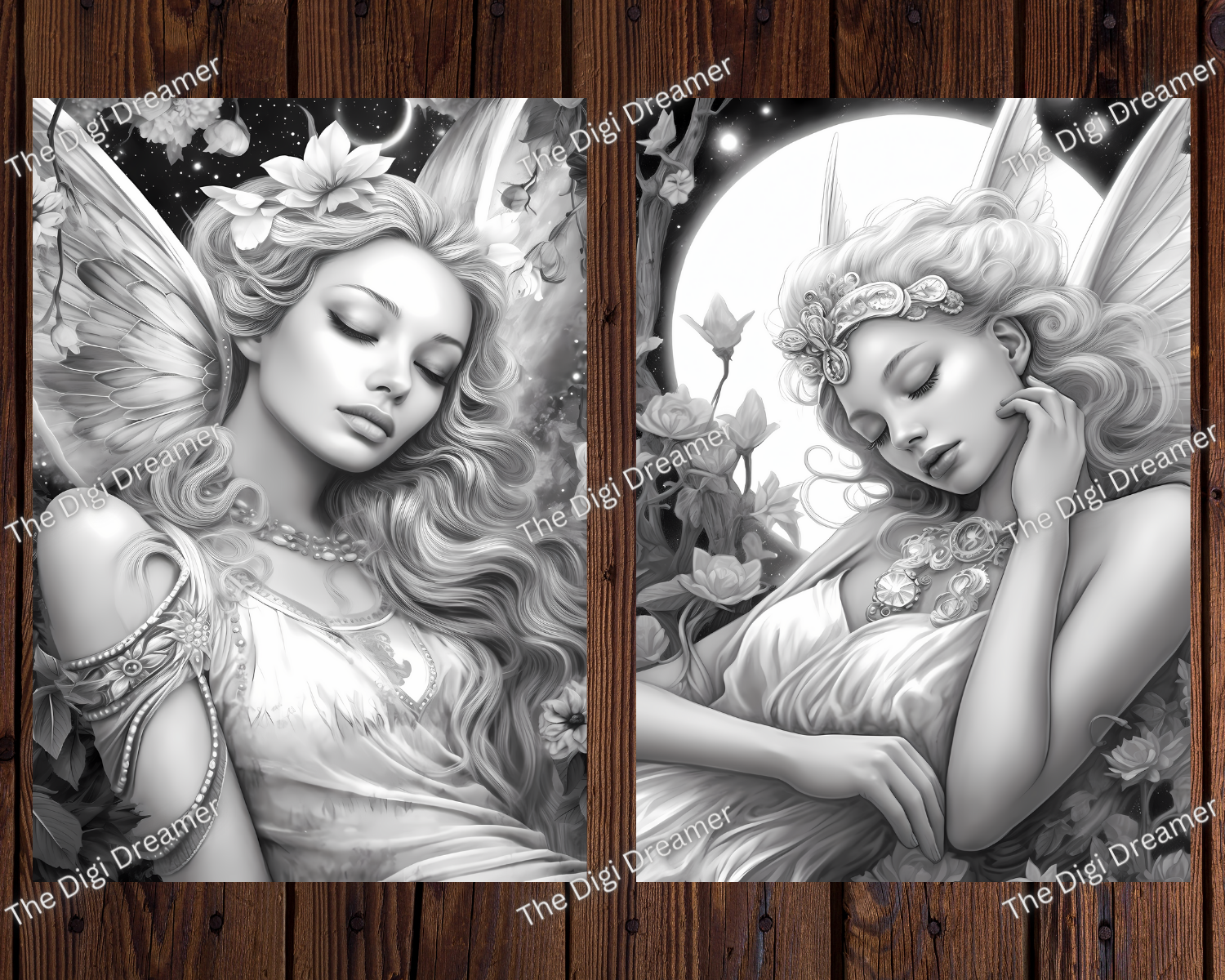Indulge in the enchanting world of sleeping fairies with our collection of grayscale coloring pages. This digital download offers a captivating selection of printable coloring pages featuring delicate and ethereal fairies peacefully slumbering in their magical realm. Whether you are a coloring enthusiast or seeking a unique gift, these coloring pages are sure to captivate both children and adults, offering a delightful escape into a world of magic and wonder.