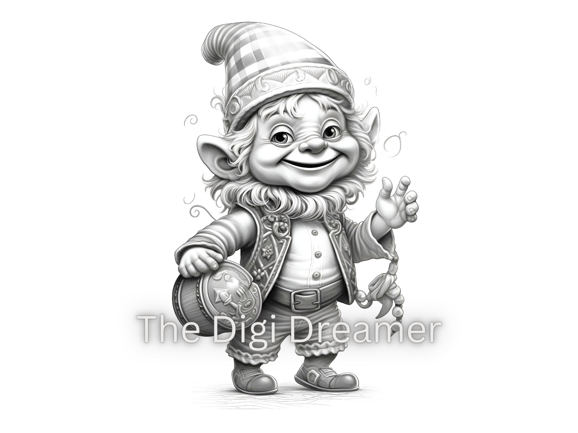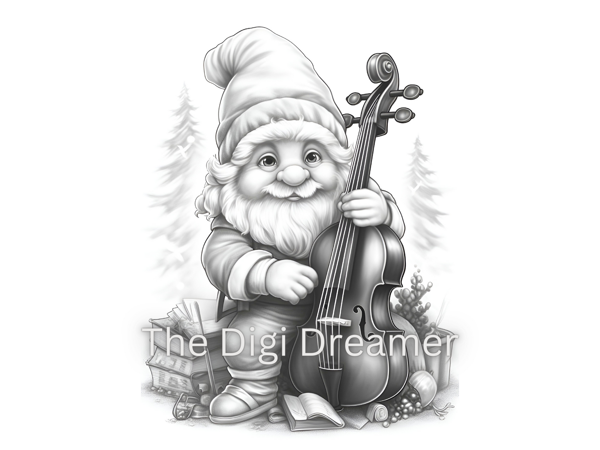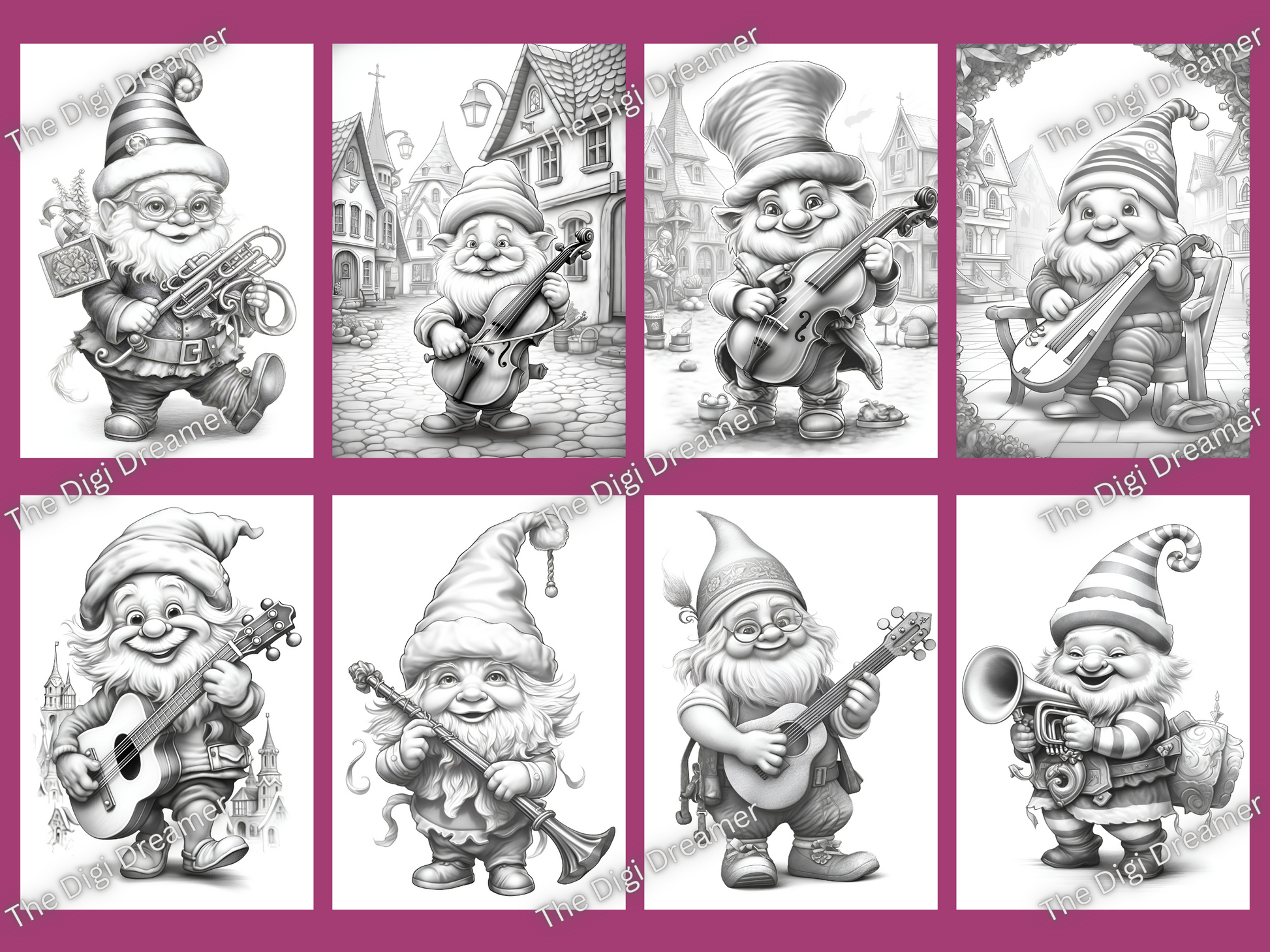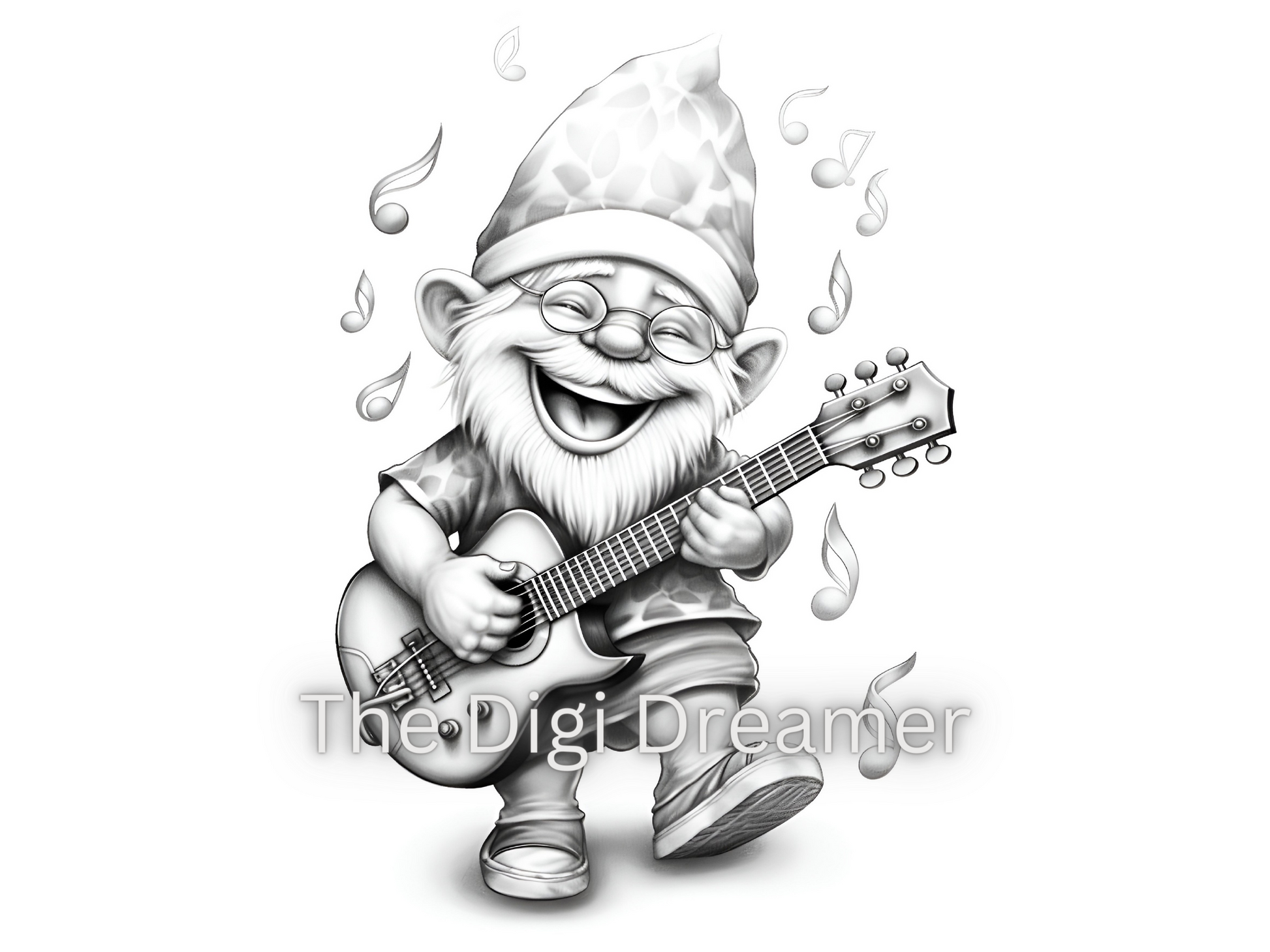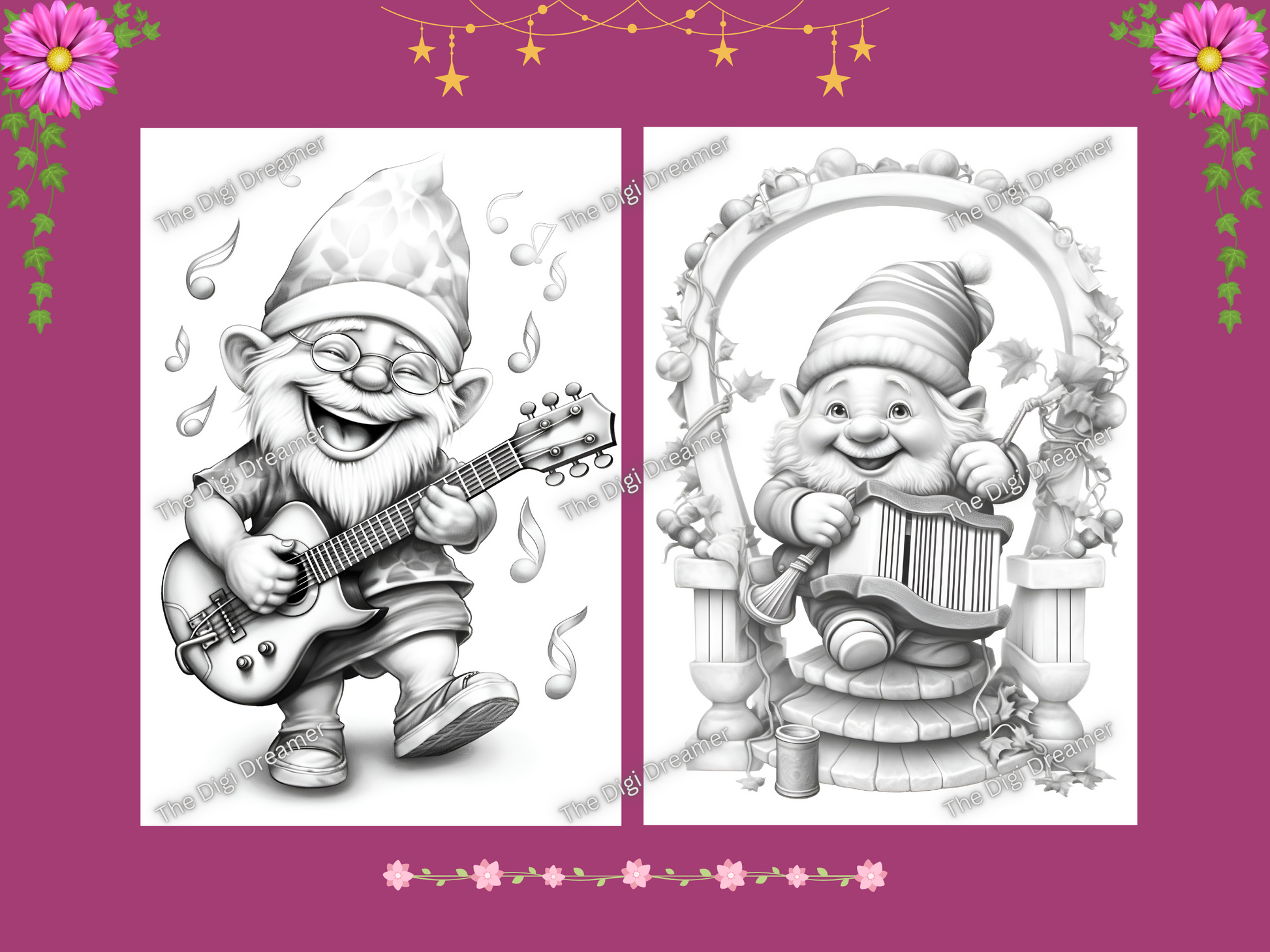 Charming Musical Gnomes Grayscale Coloring Pages For Adults & Kids