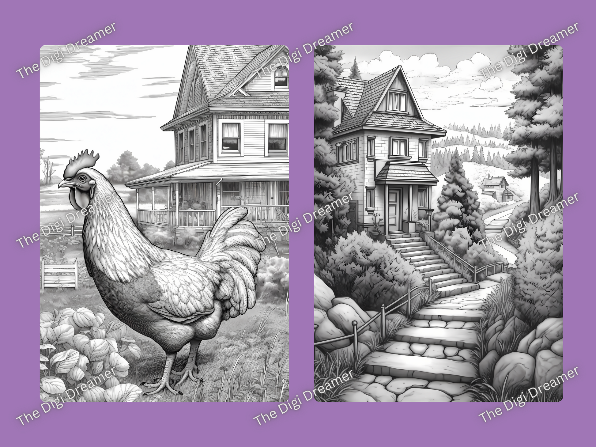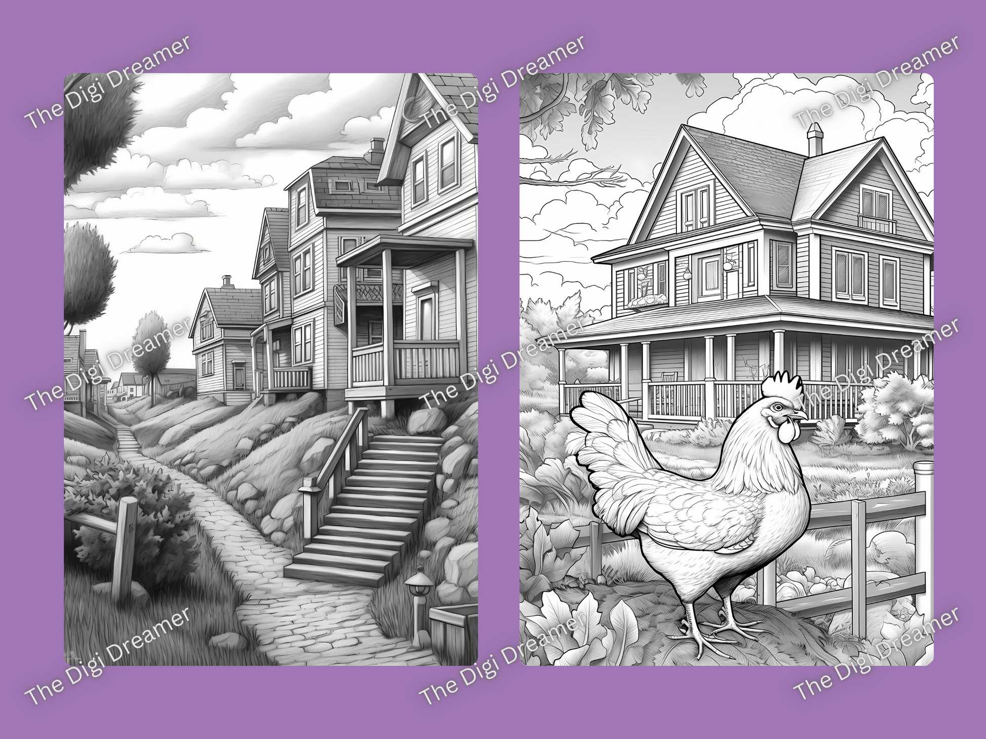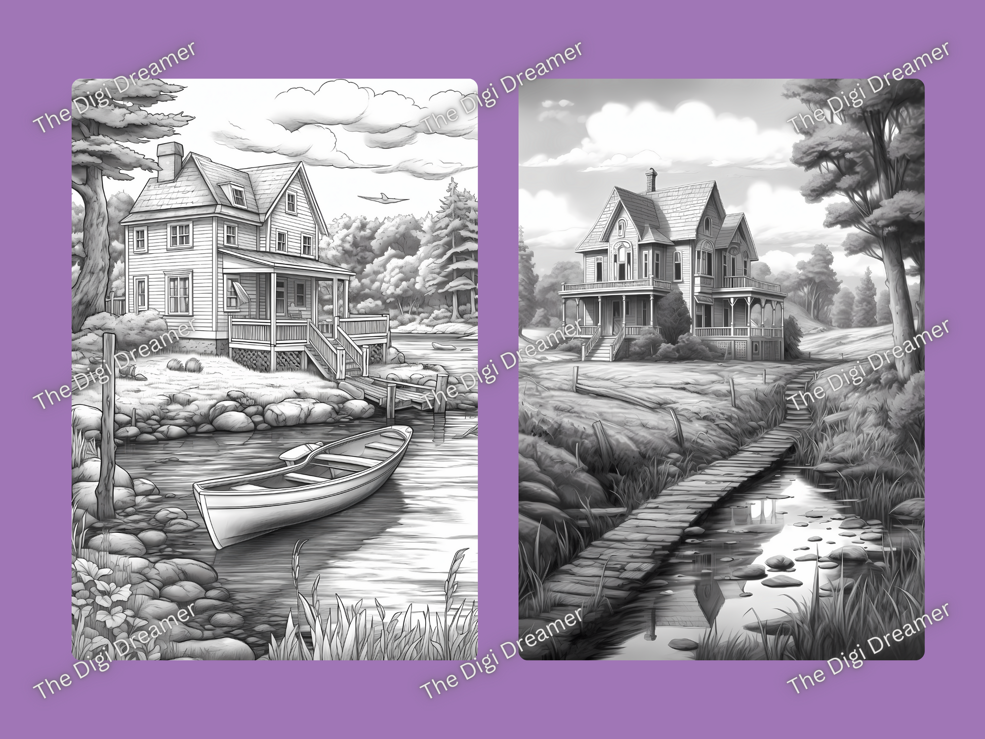 Escape to the tranquil charm of the countryside with our captivating collection of "Countryside Houses" grayscale coloring pages. These digital coloring pages are not only a joy to color but also make wonderful decorative pieces or thoughtful gifts for nature lovers, fans of rustic aesthetics, or anyone seeking a moment of tranquility.