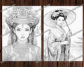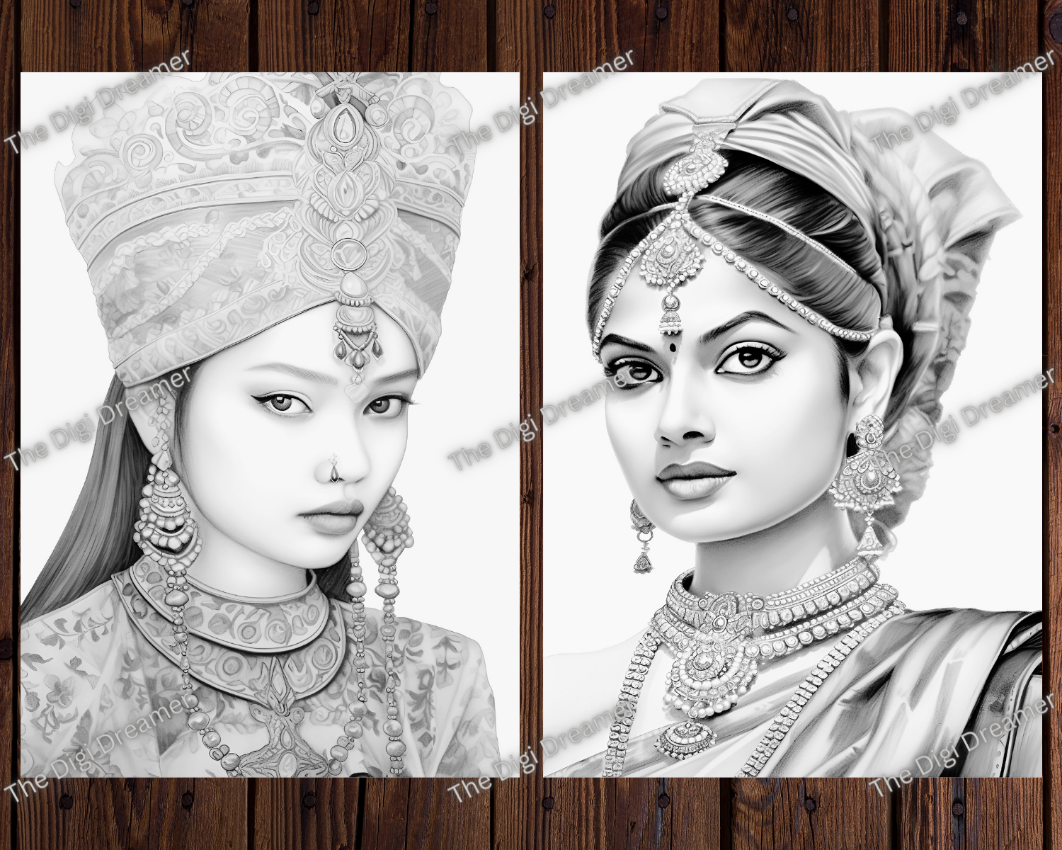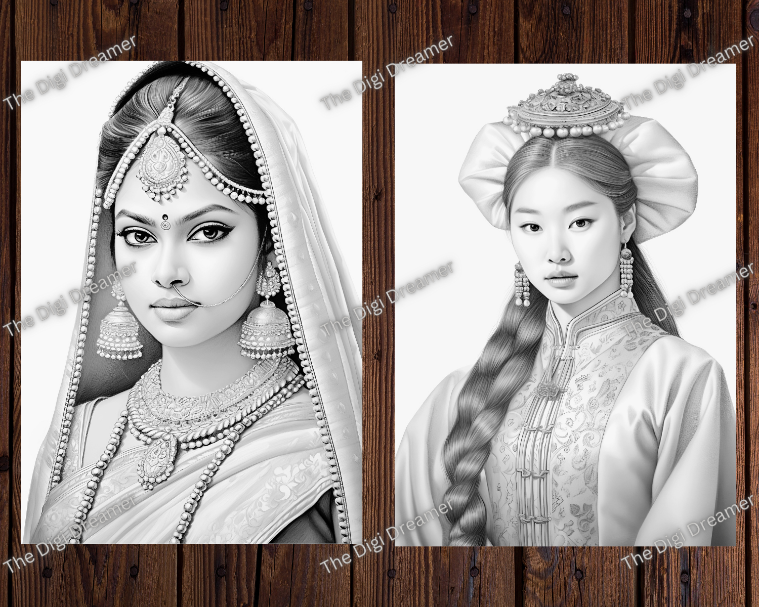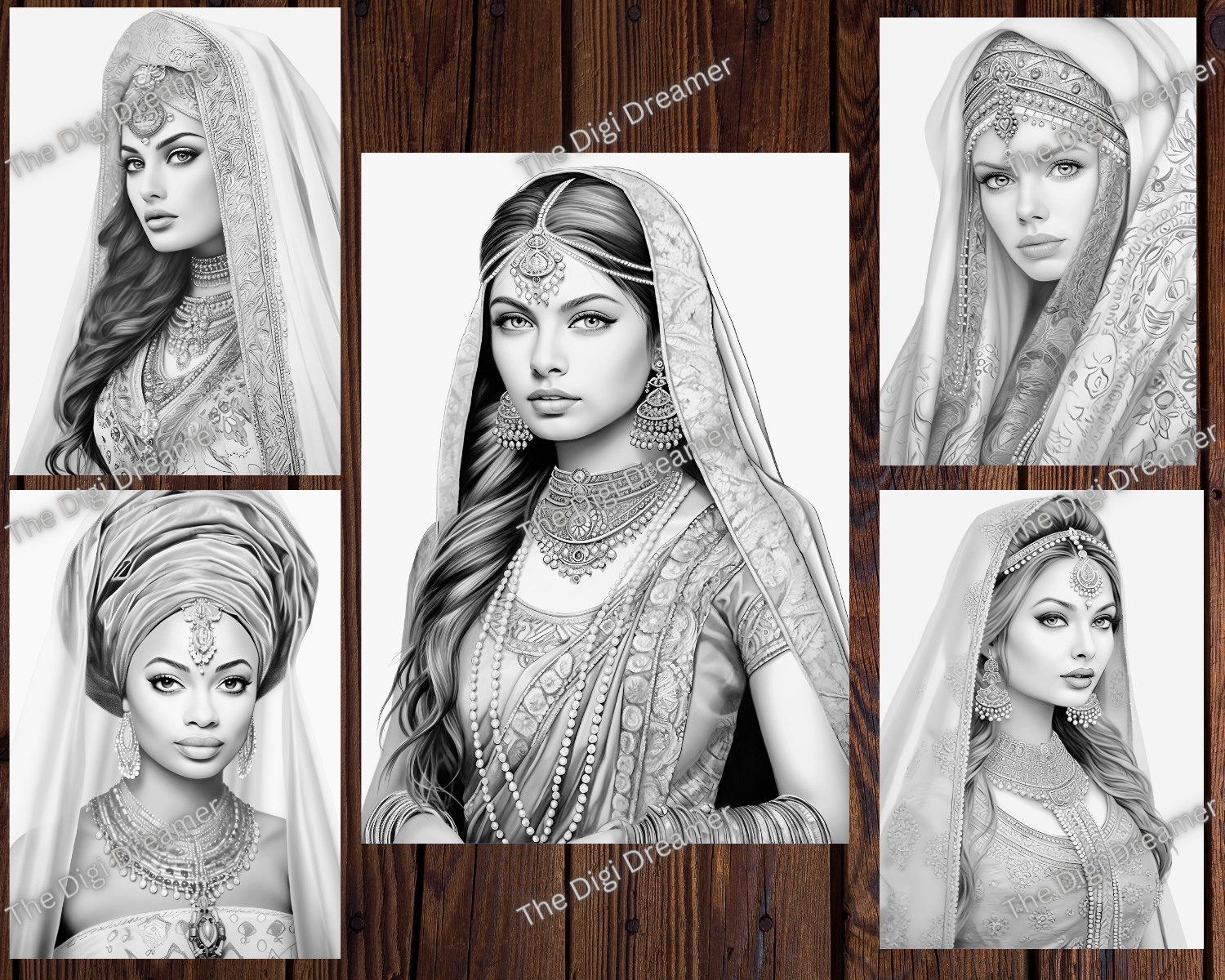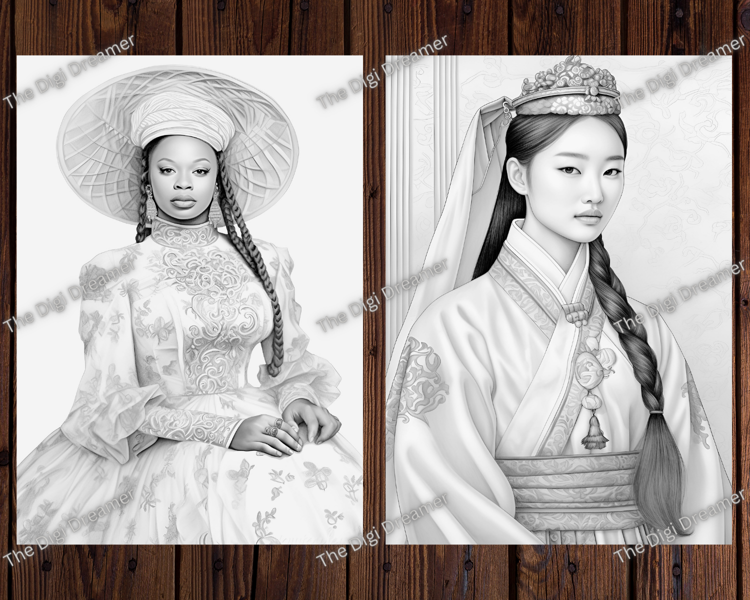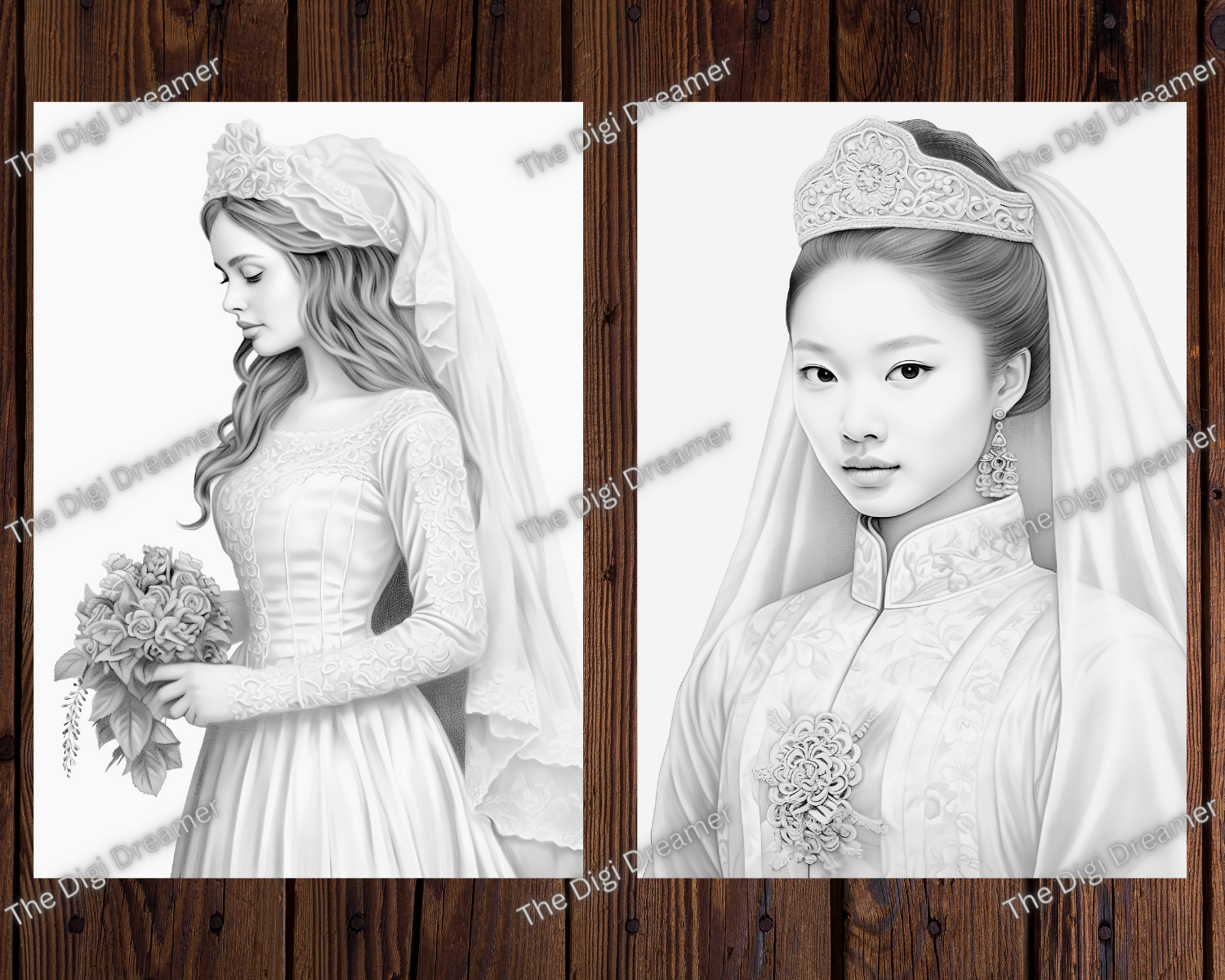 Each grayscale coloring page captures the essence of bridal attire and customs, from ornate wedding dresses and traditional headpieces to symbolic jewelry and cultural elements. Let your creativity flourish as you bring these captivating designs to life with shades of gray, adding depth and dimension to each bride's unique ensemble.