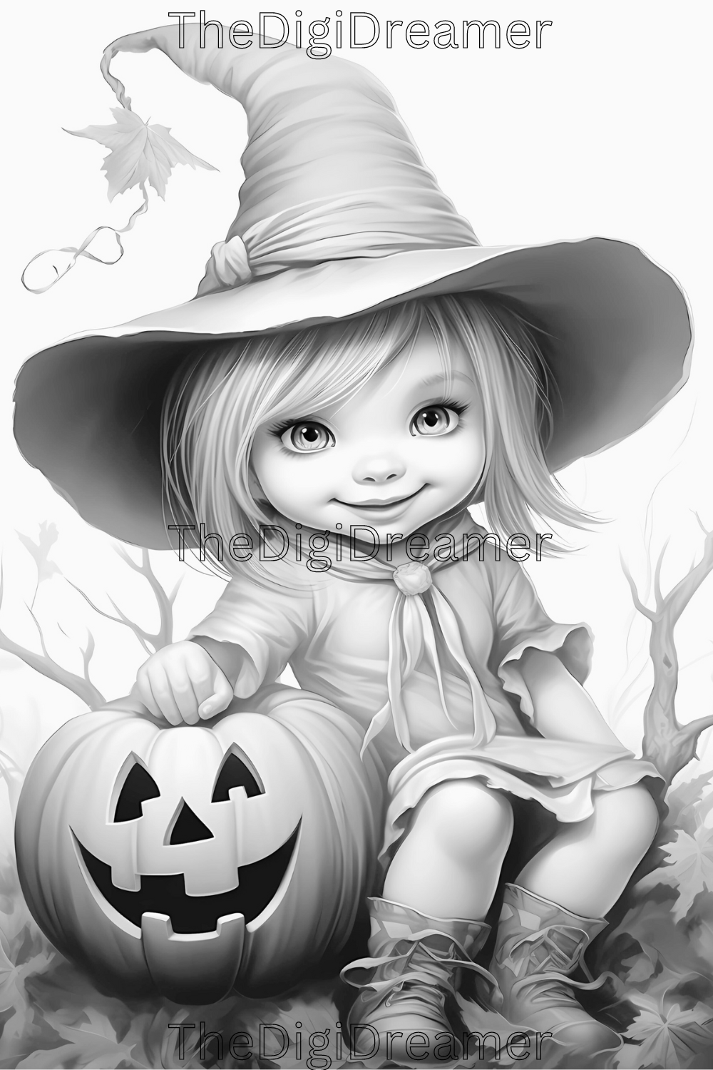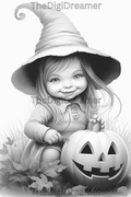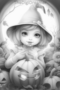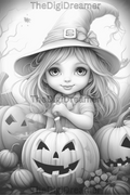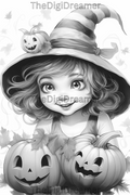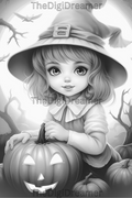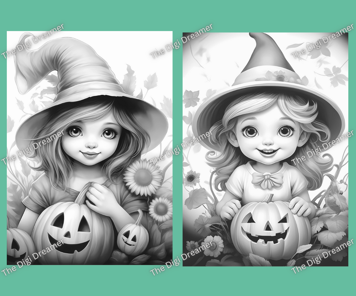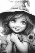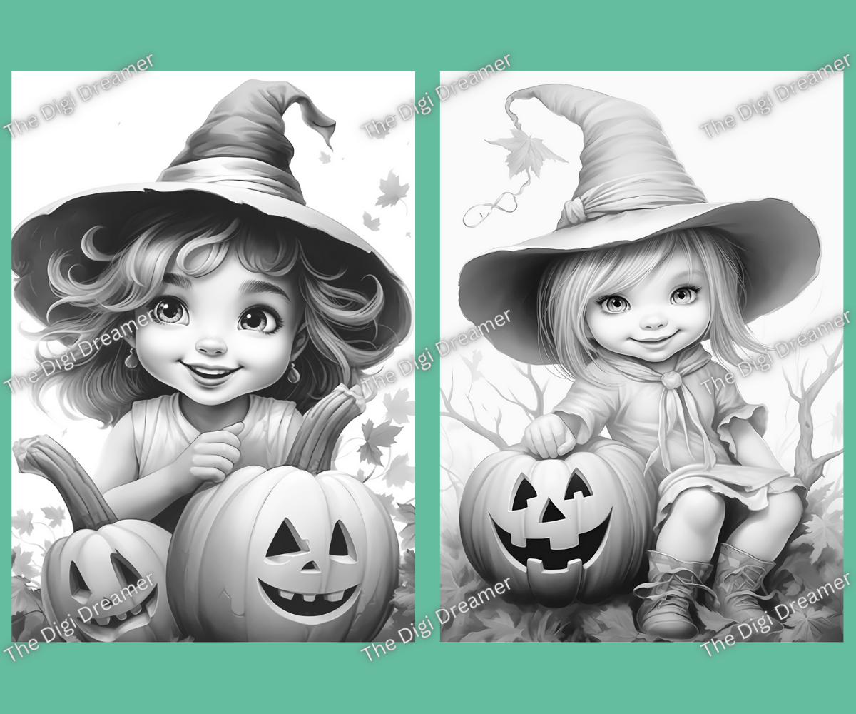 Cute Witches & Halloween-Printable Grayscale Coloring Pages, Digital download