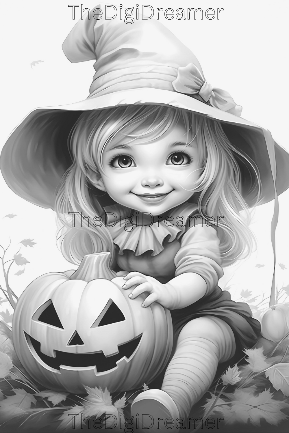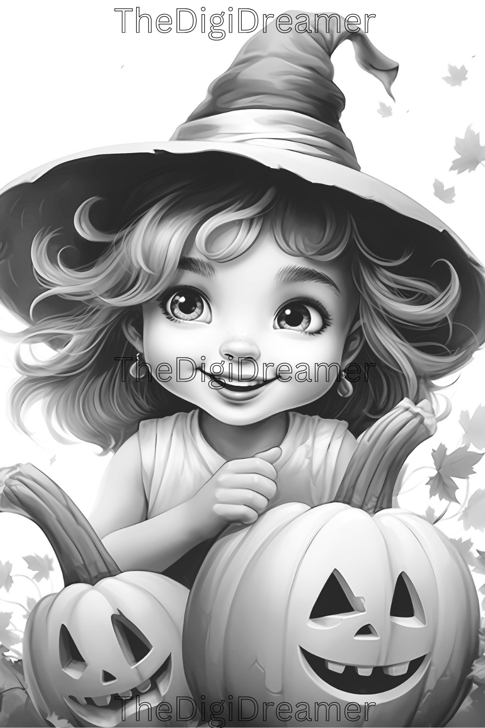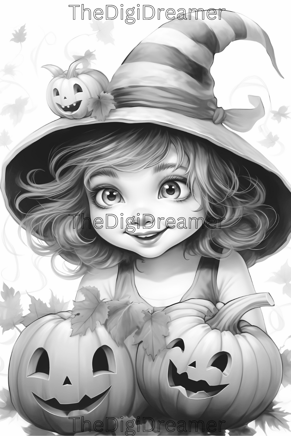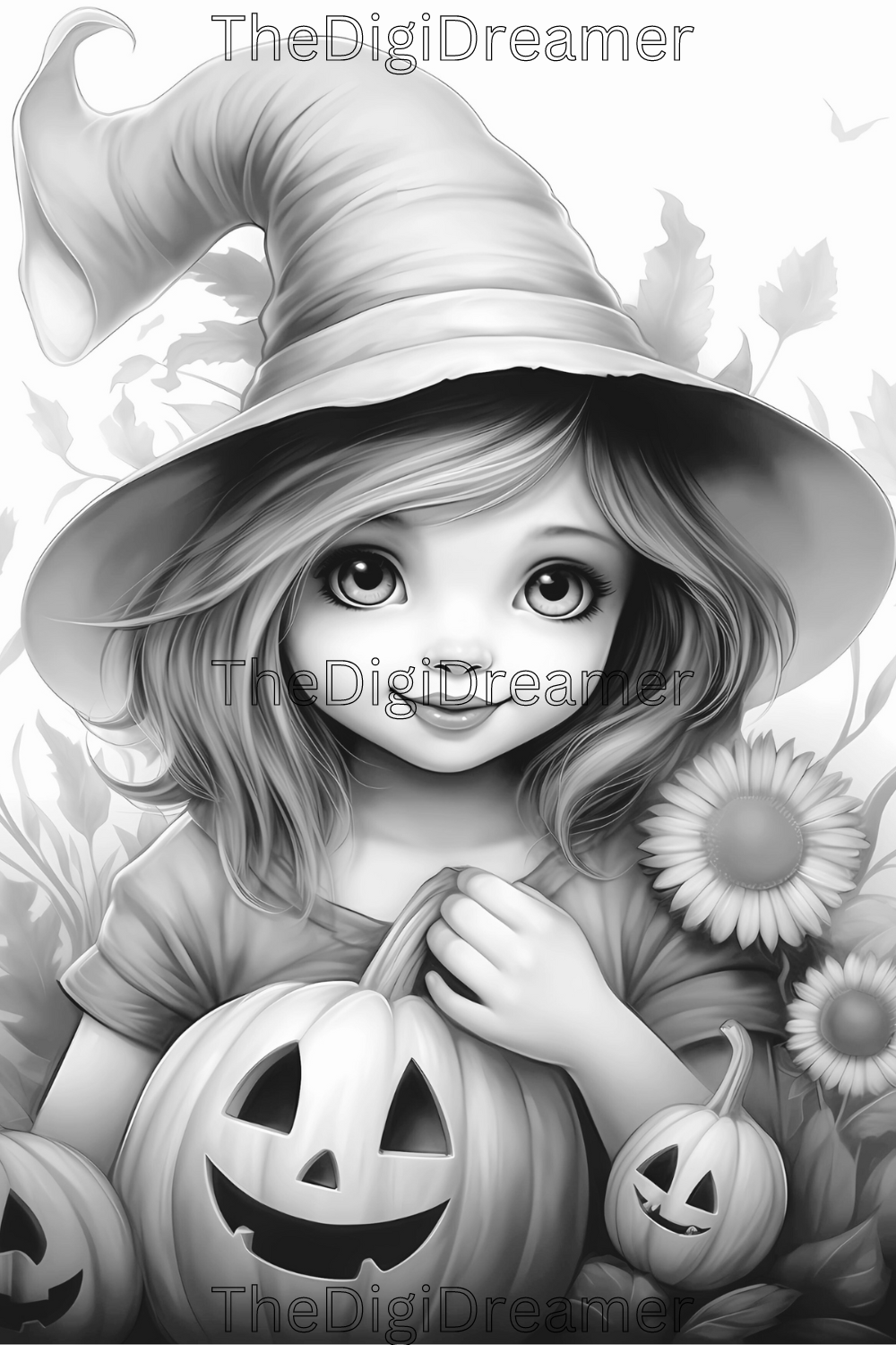 Cute Witches & Halloween-Printable Grayscale Coloring Pages, Digital download
