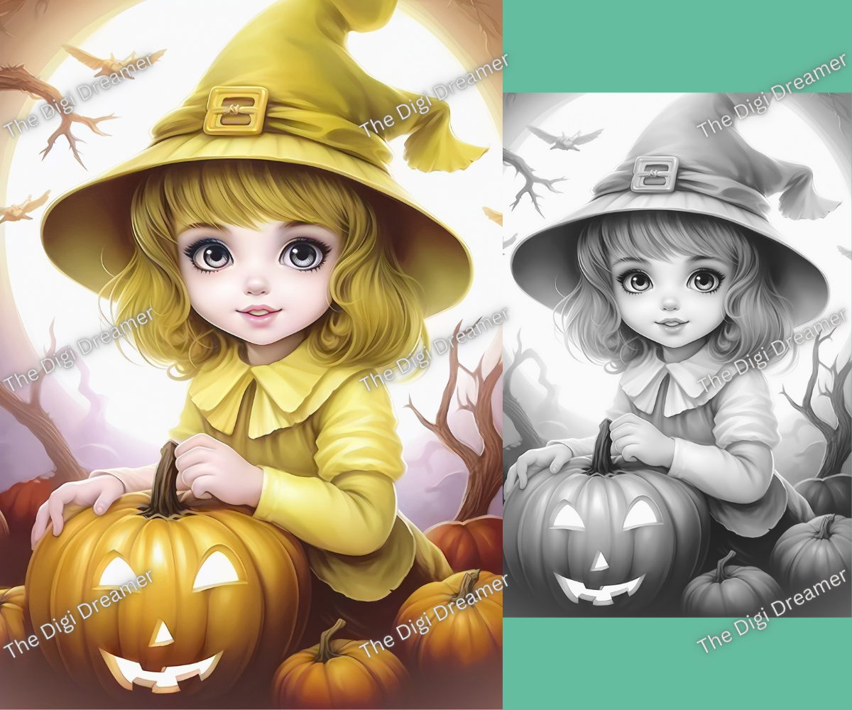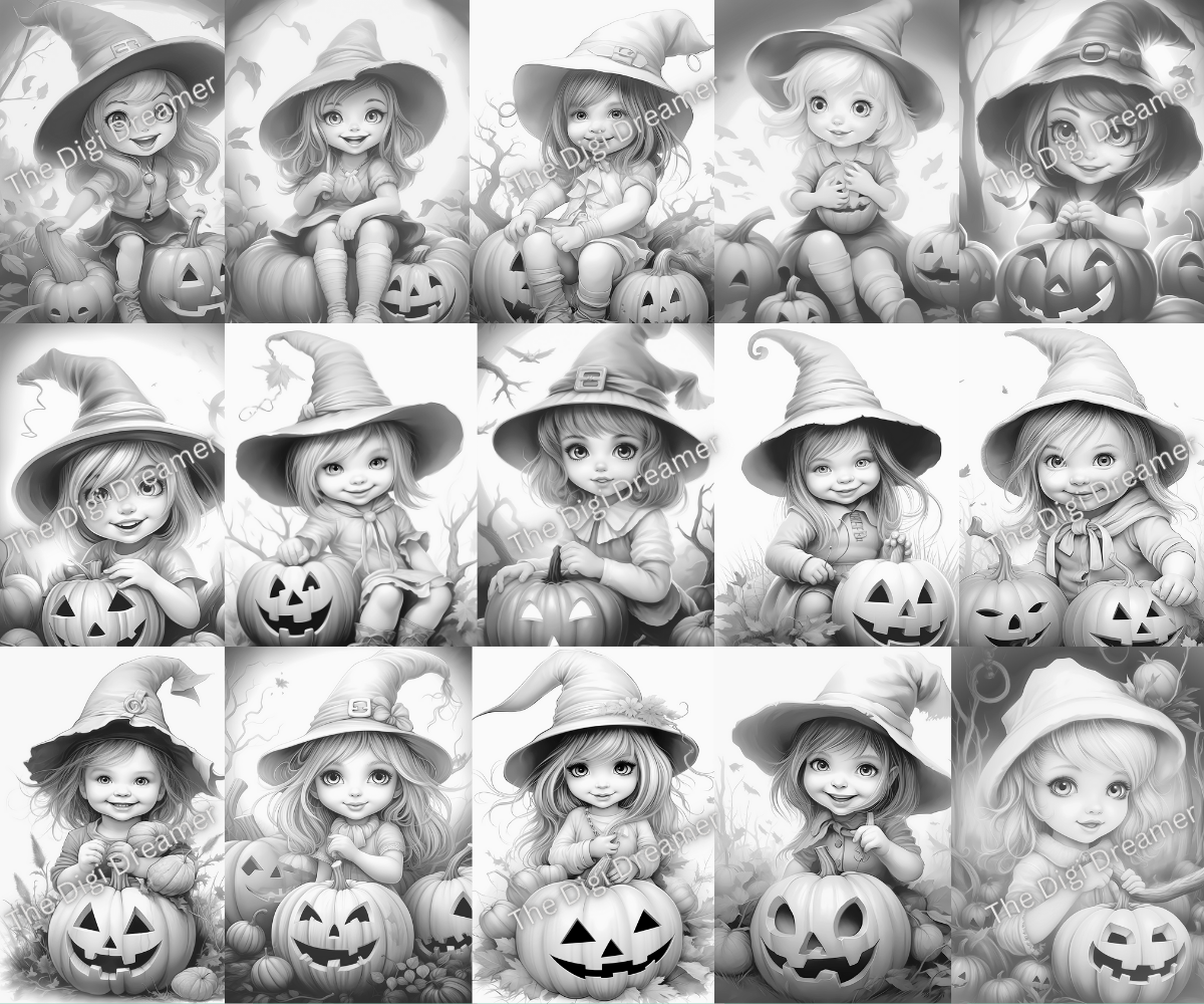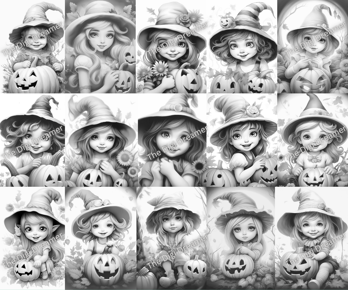 Enter a world of enchantment with our collection of cute witches and Halloween grayscale coloring pages. This coloring book includes 30 coloring pages.