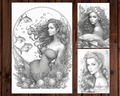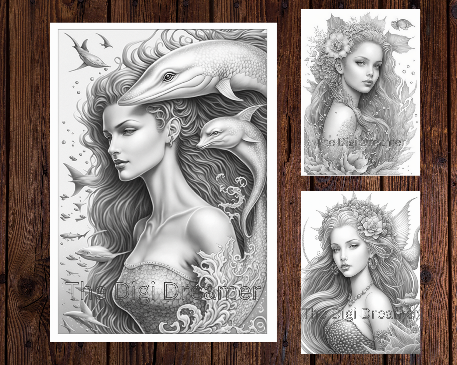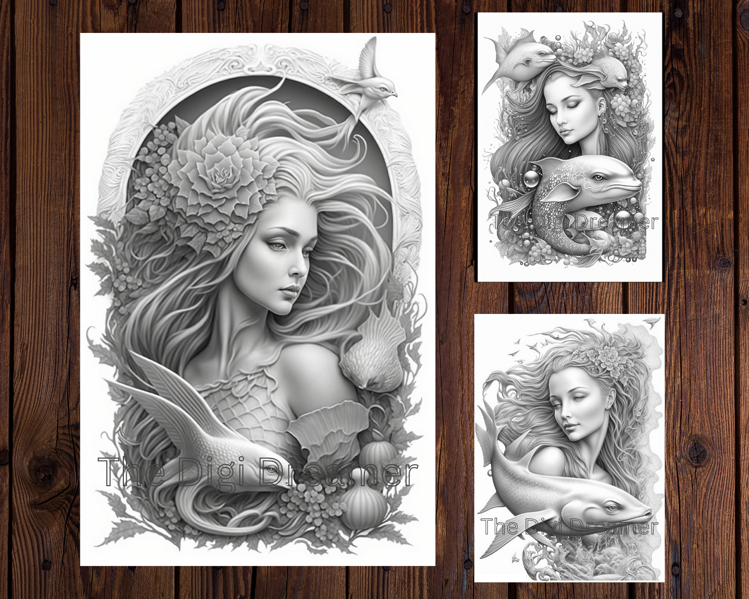 Enchanting Fantasy Mermaids Grayscale Printable Coloring Pages for Adults