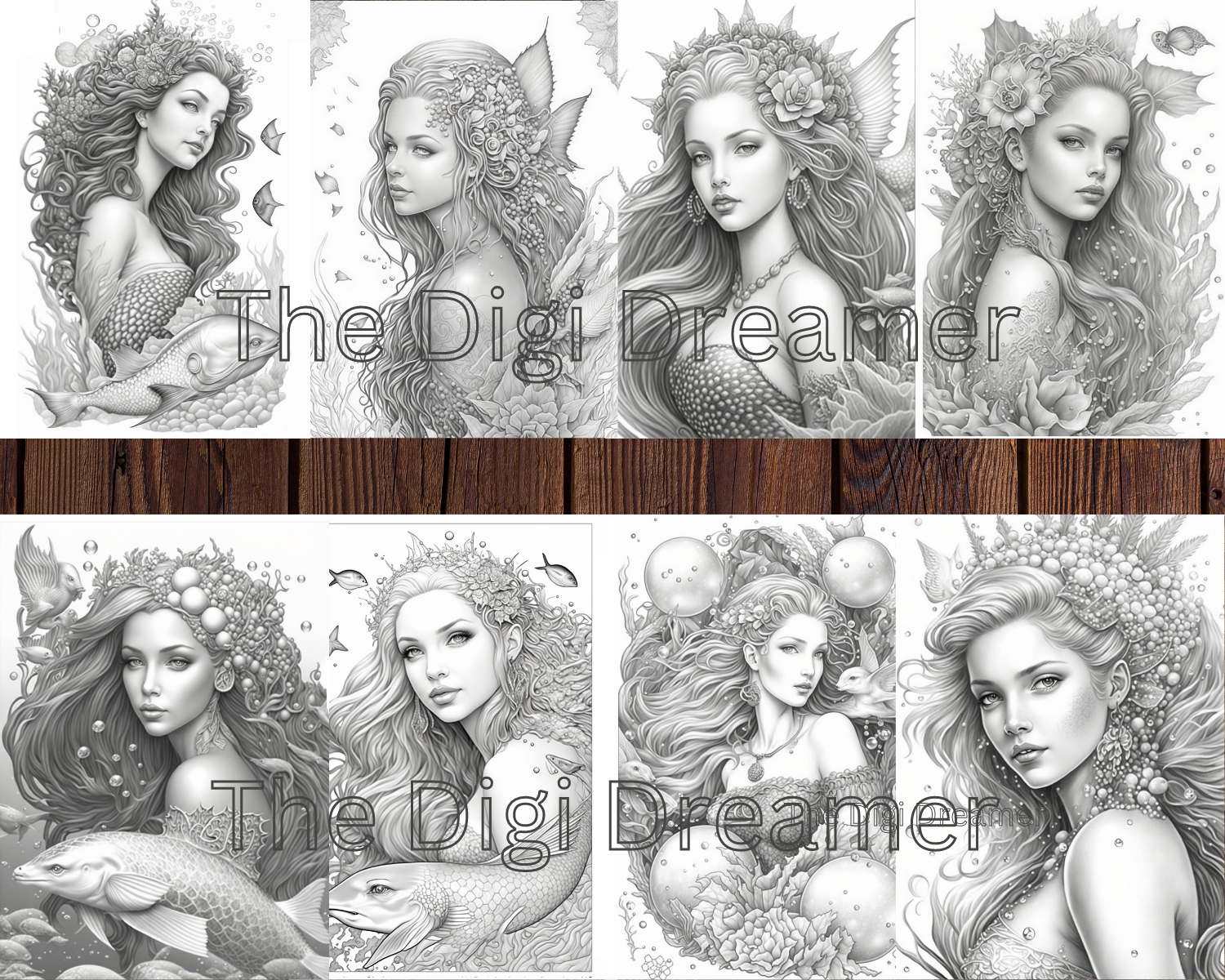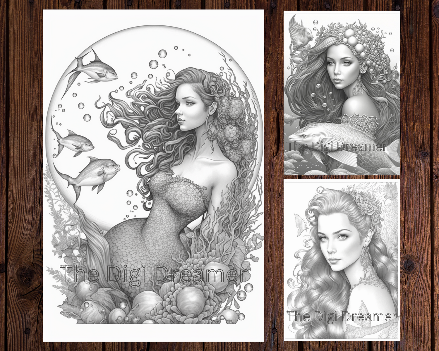 Get lost in a world of magic and wonder with our collection of grayscale colouring pages featuring enchanting fantasy mermaids. These grayscale colouring pages are perfect for anyone who loves fantasy, mermaids, fairies, and mythical creatures and for anyone looking to relieve stress, practice mindfulness, or simply enjoy a relaxing and creative activity.