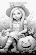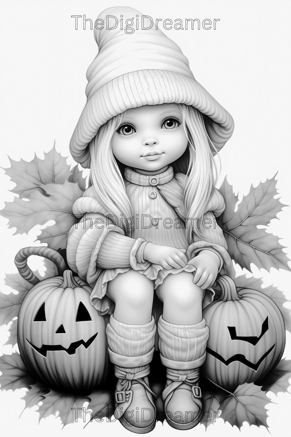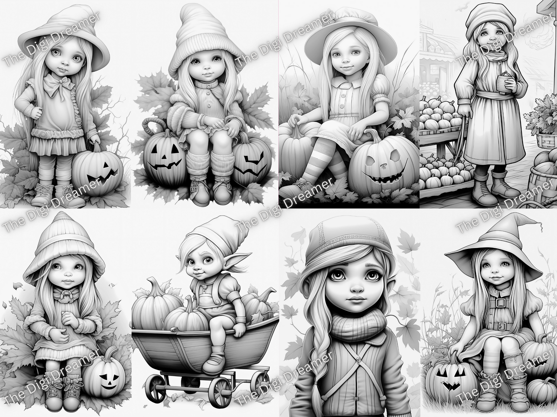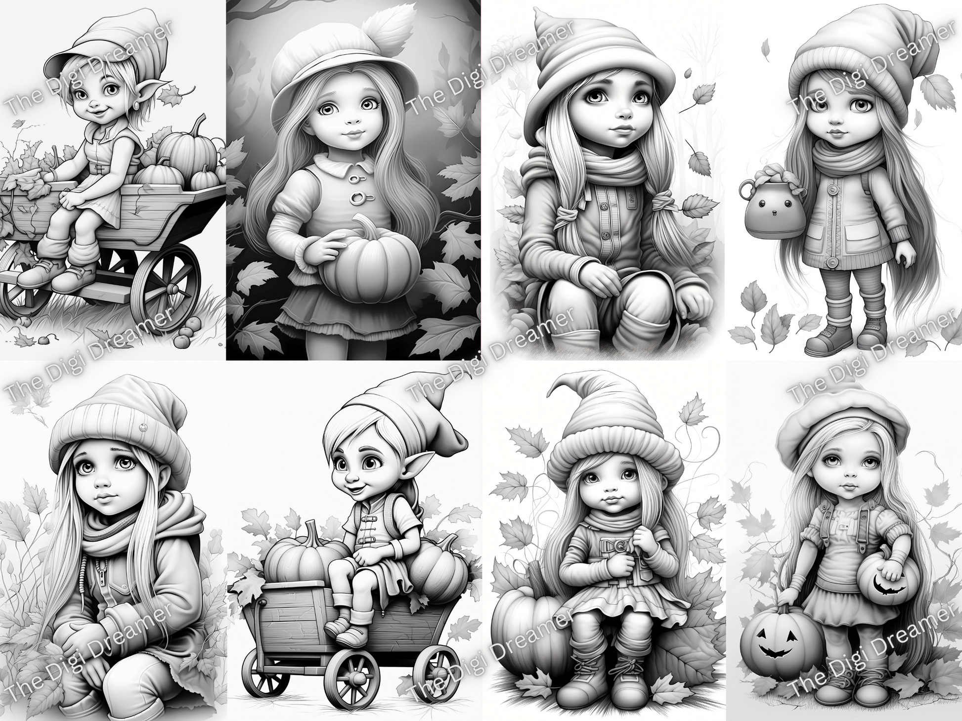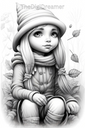 Fall Gnome Girls-Printable Grayscale Coloring Pages, Digital download