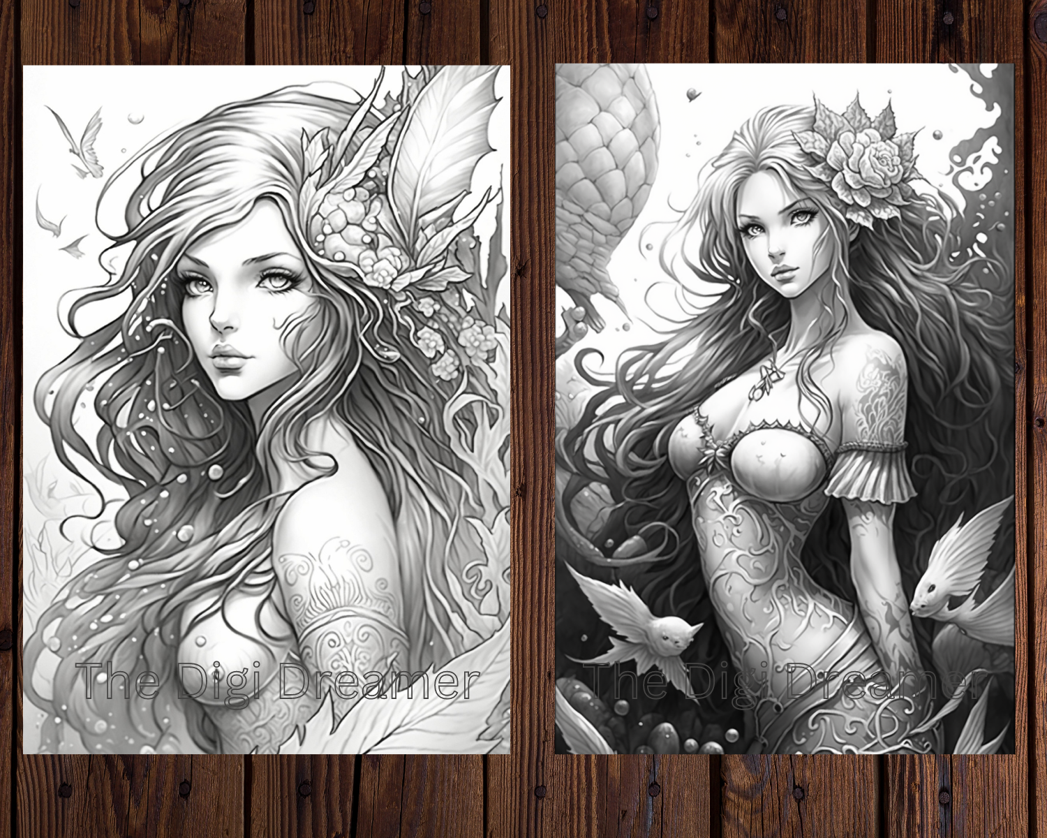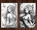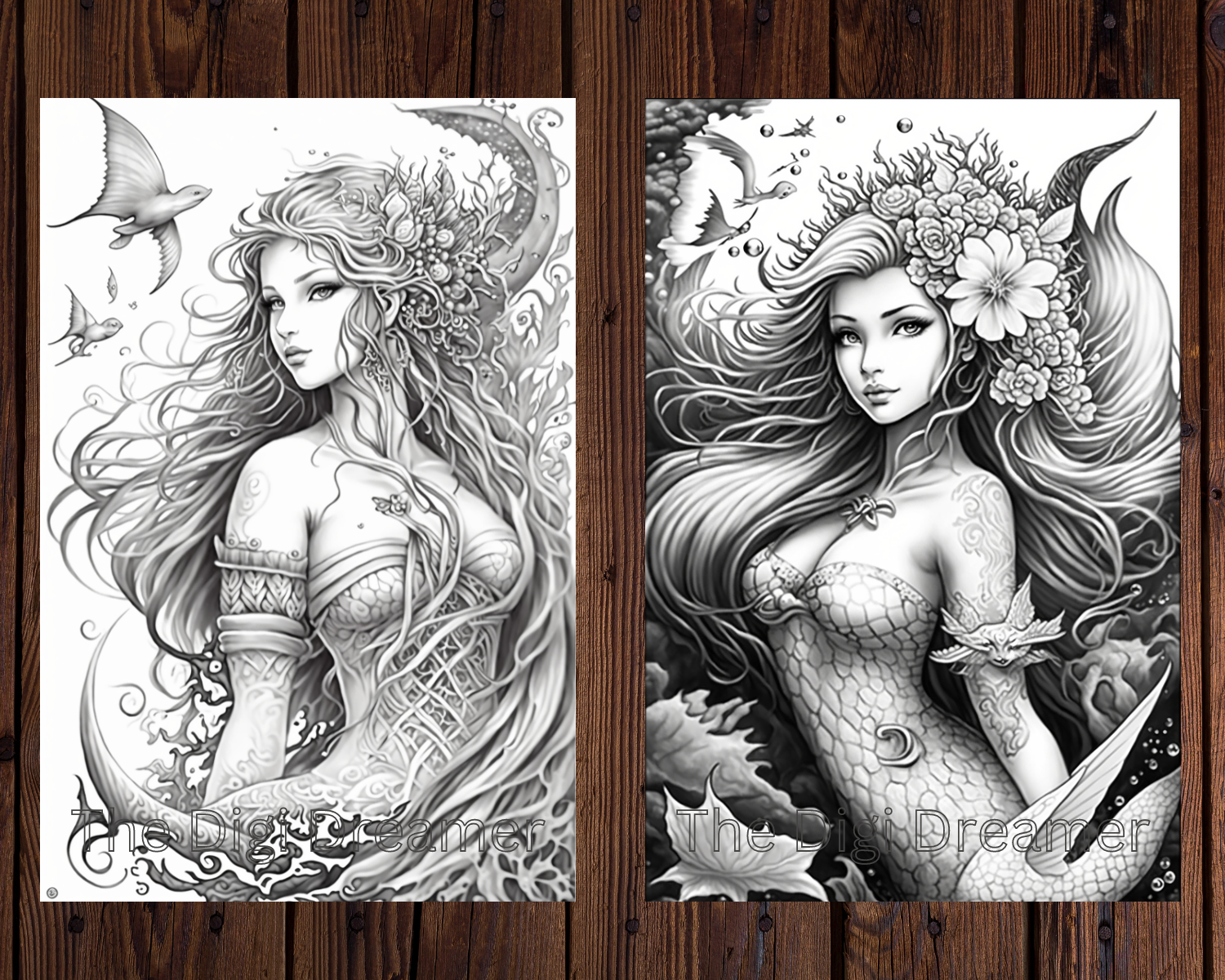 Fantasy Mermaids Grayscale Printable Coloring Pages for Adults