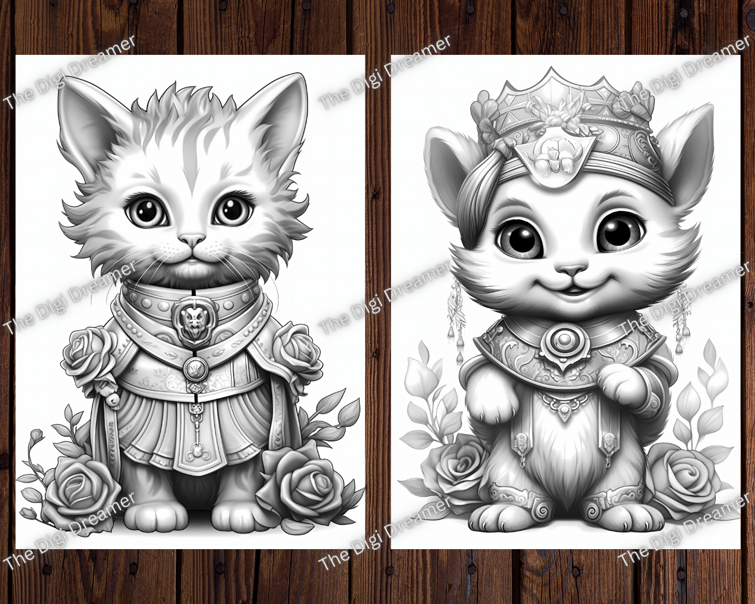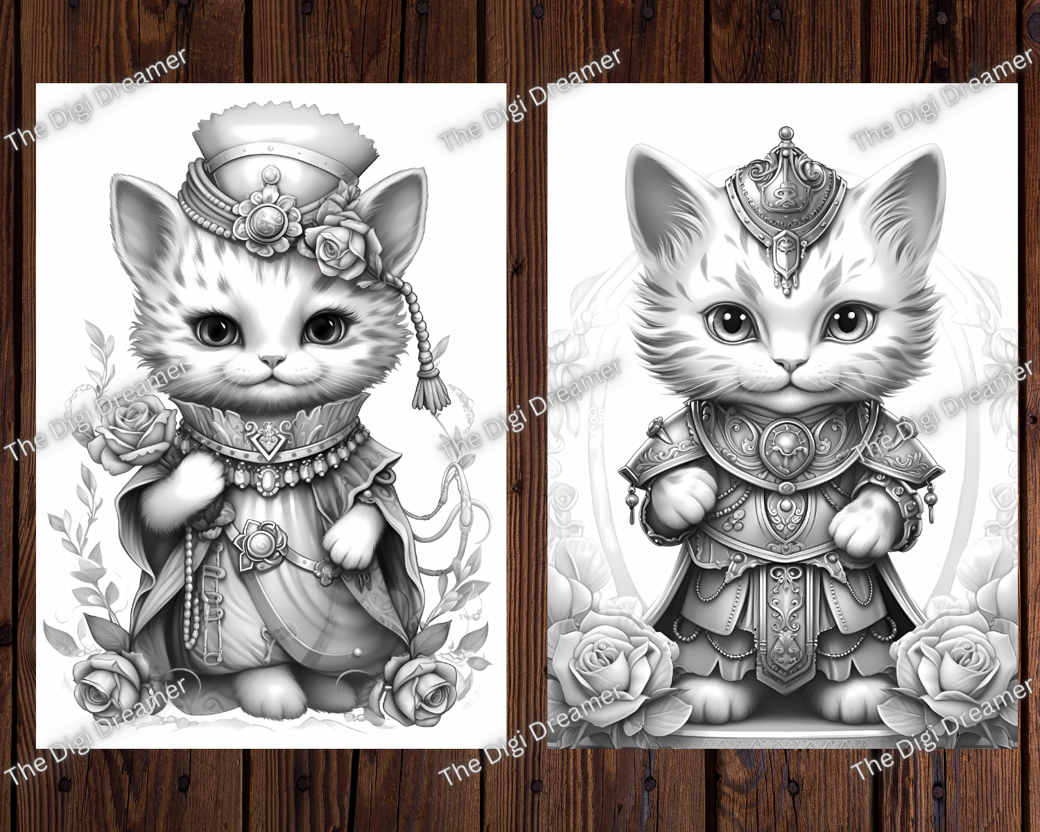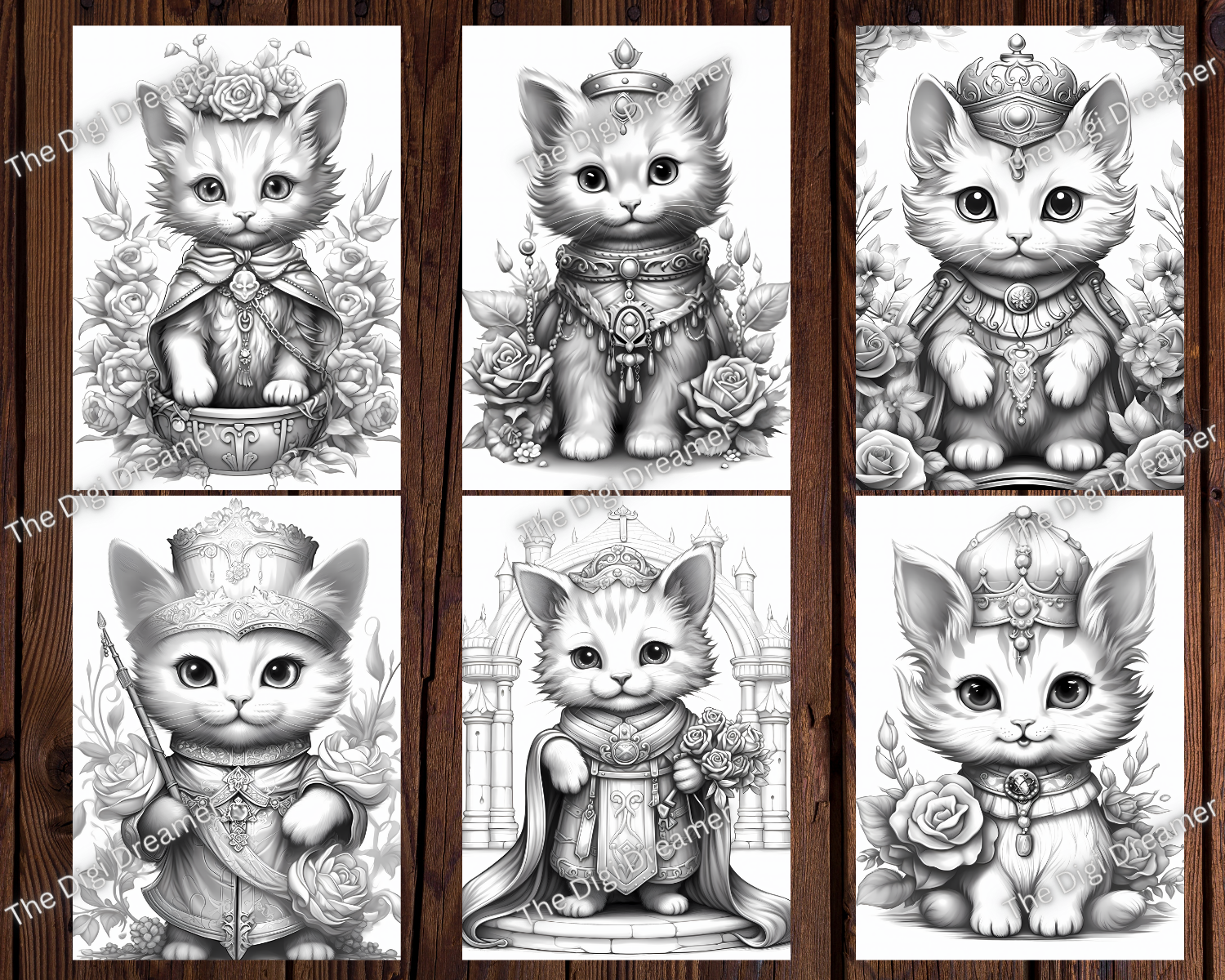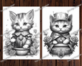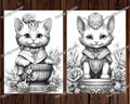 Fantasy Royal Cats Grayscale Coloring Pages