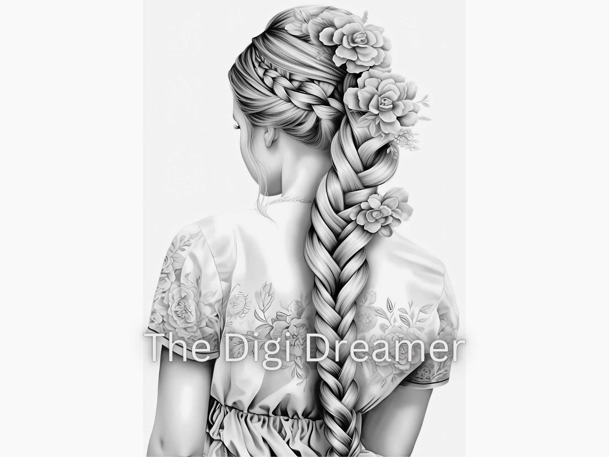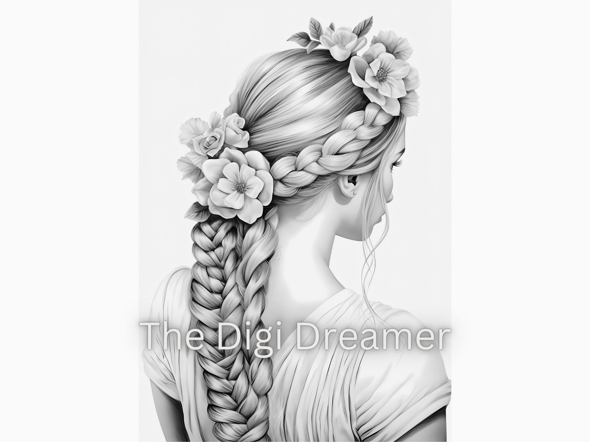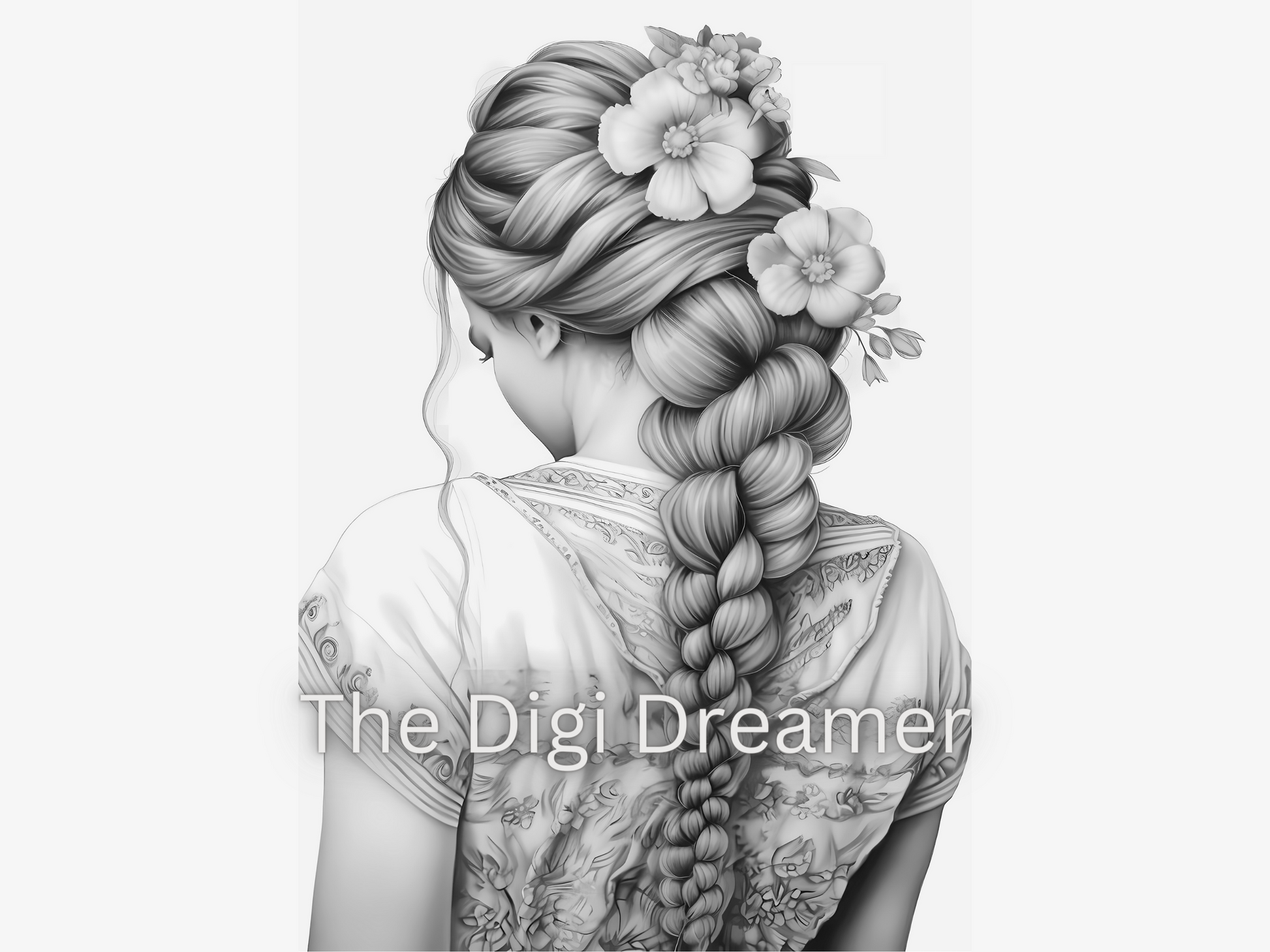 Flower Braid Hairstyles Grayscale Coloring Pages for Adults & Kids