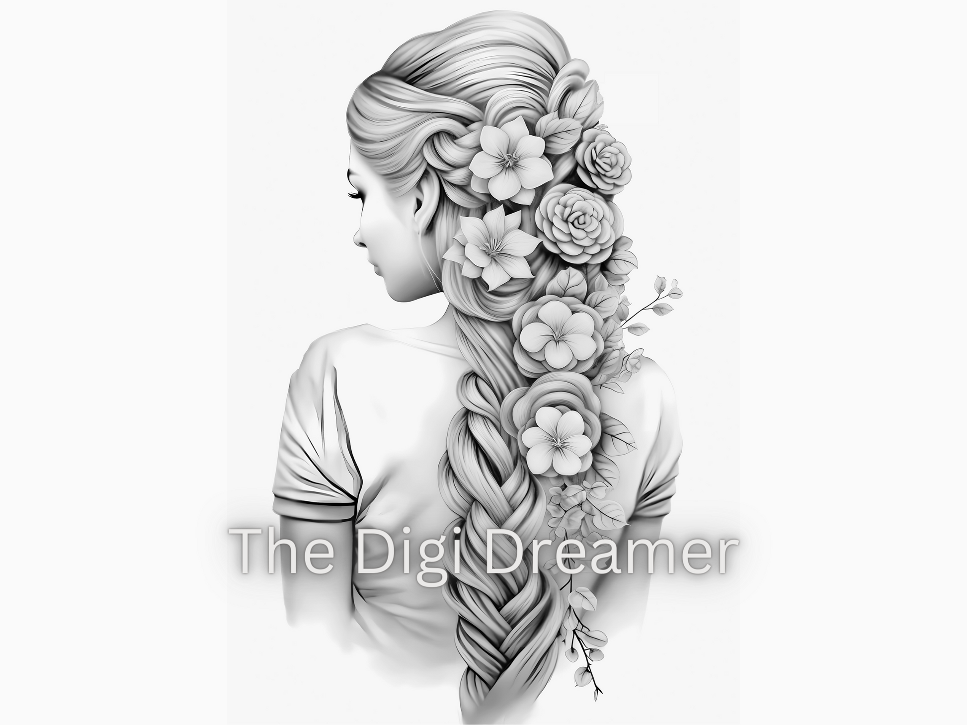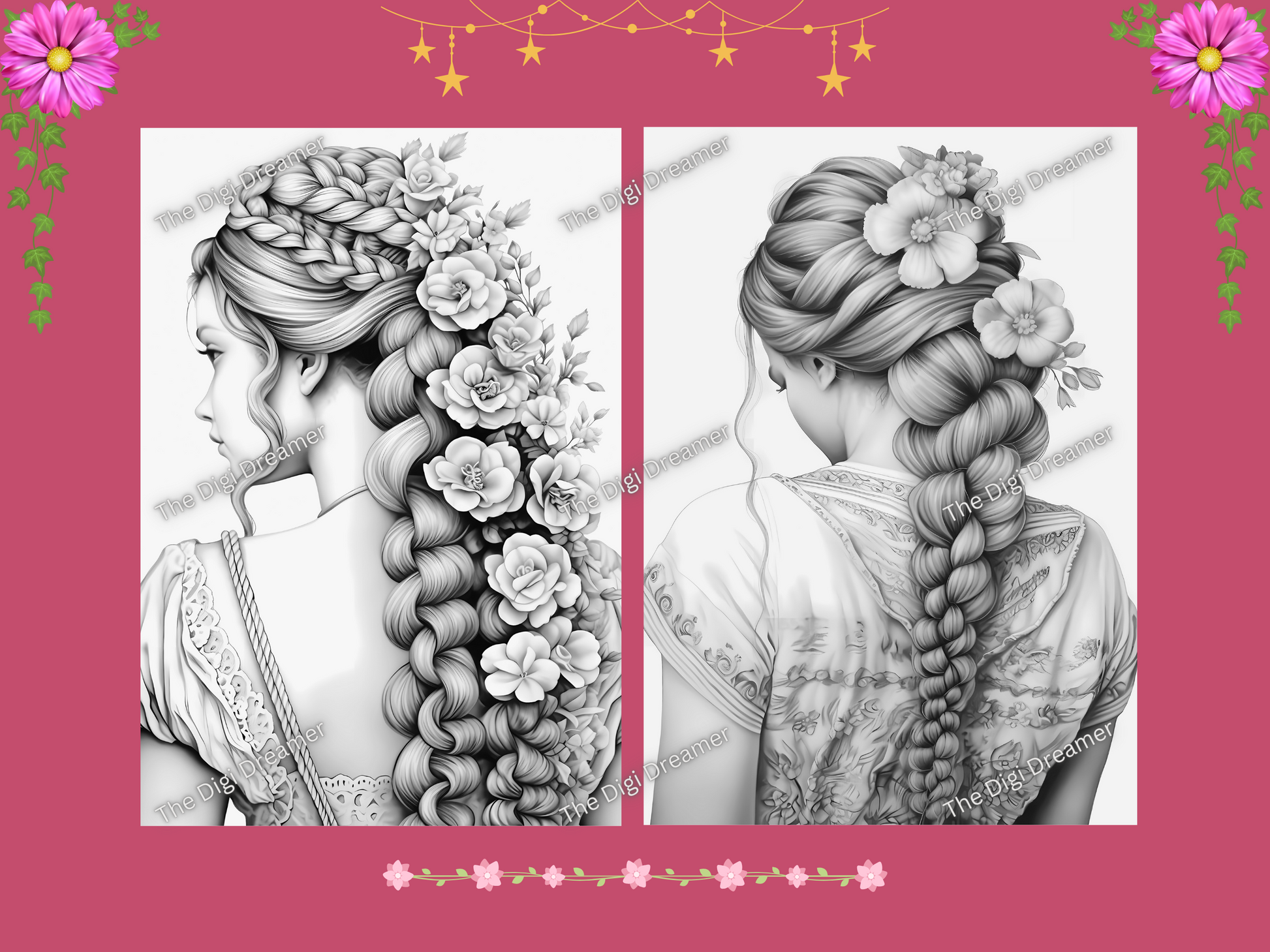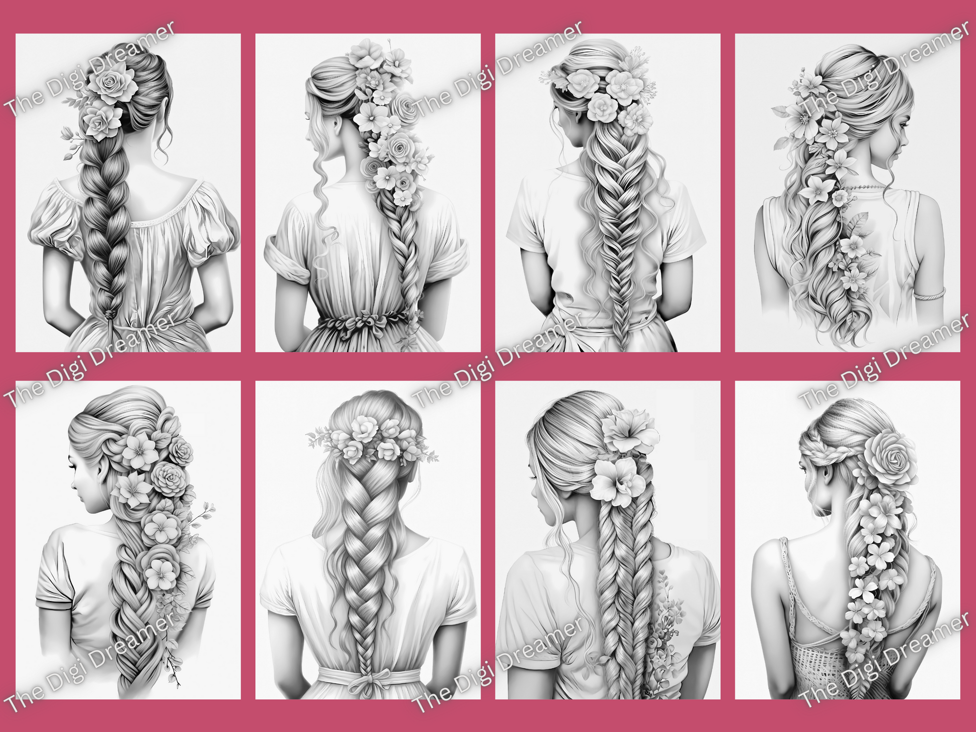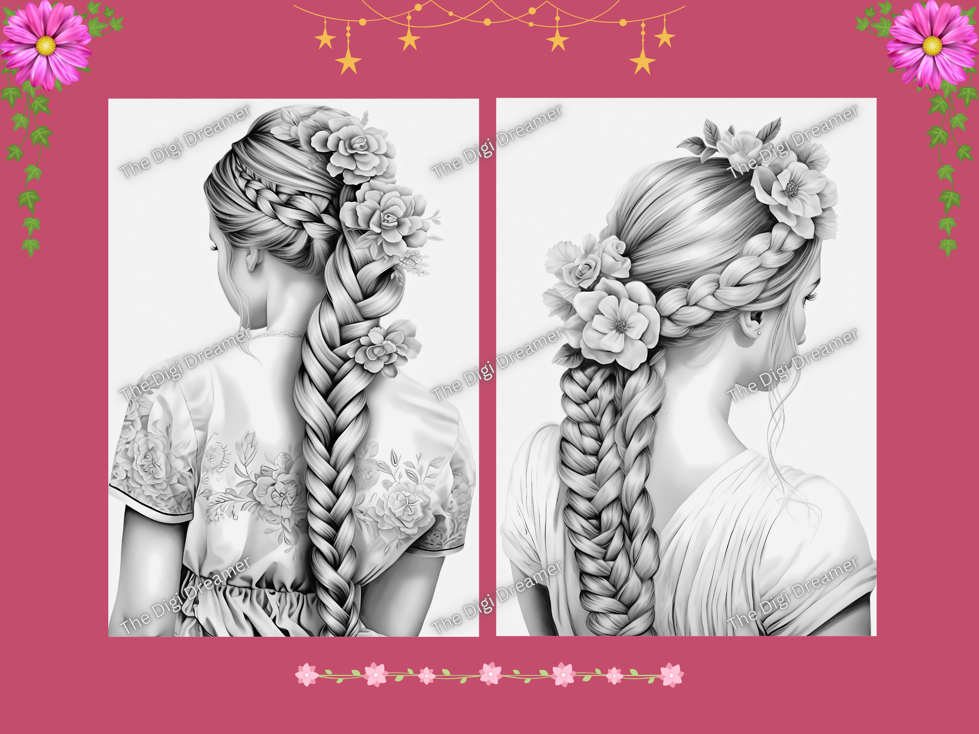 Flower Braid Hairstyles Grayscale Coloring Pages for Adults & Kids