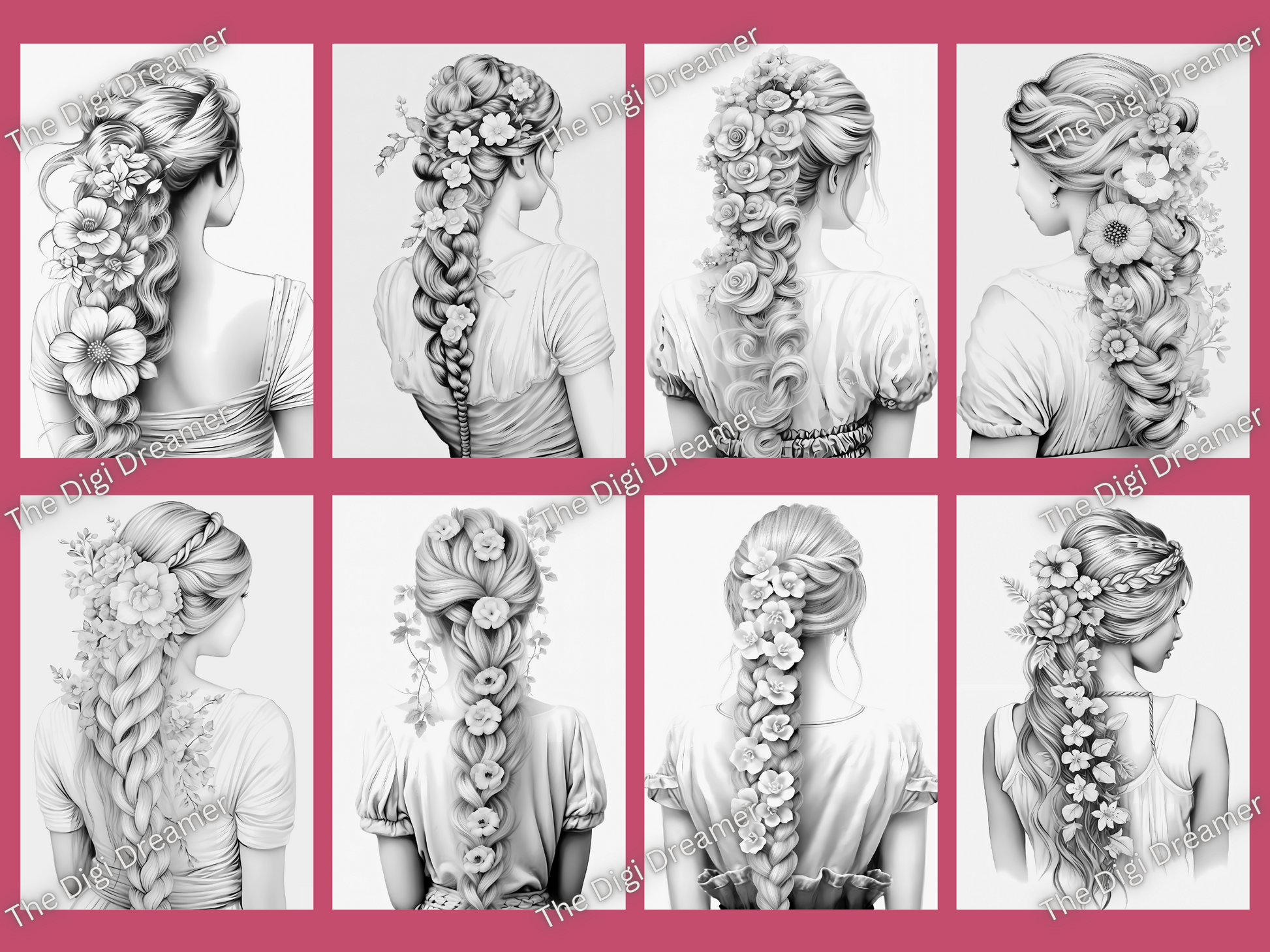 Welcome to our collection of Flower Braid Hairstyles grayscale coloring pages! Unleash your creativity and enjoy the art of coloring with these intricate and captivating designs. Designed for both adults and kids, these coloring pages feature beautiful flower-braid hairstyles that are perfect for unleashing your inner stylist.