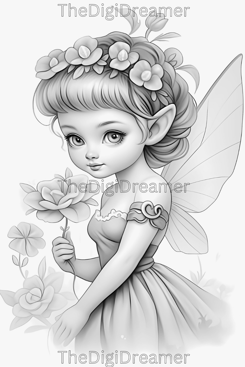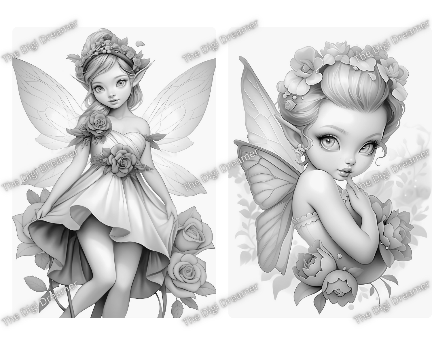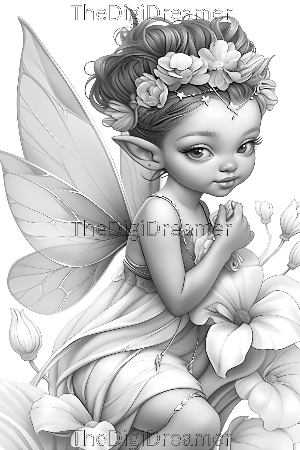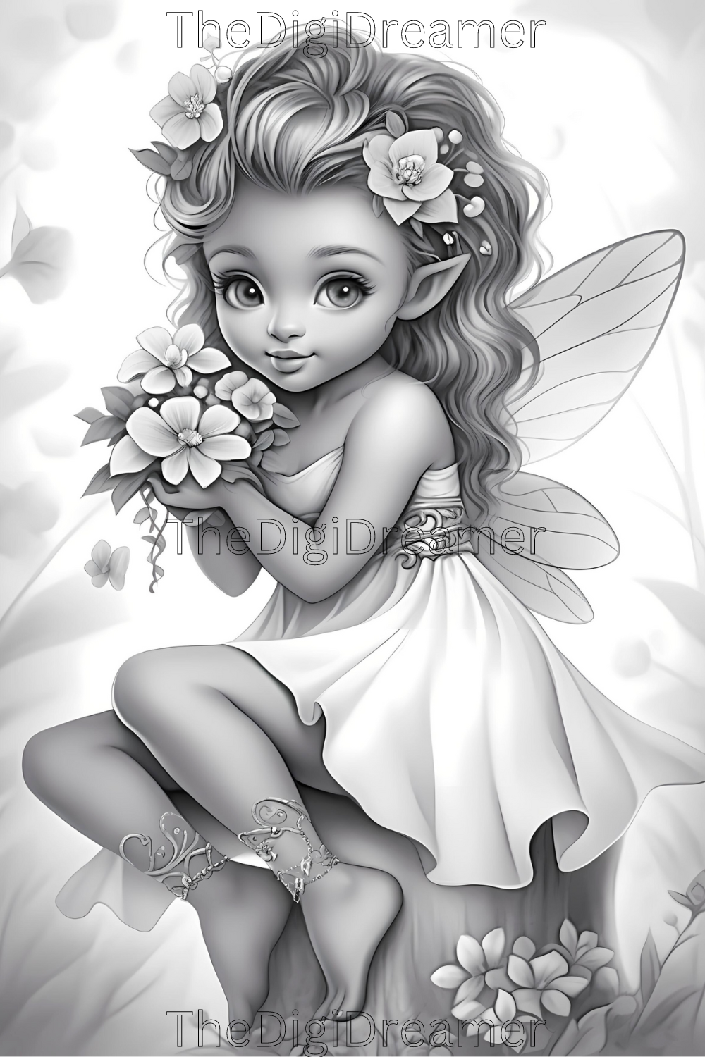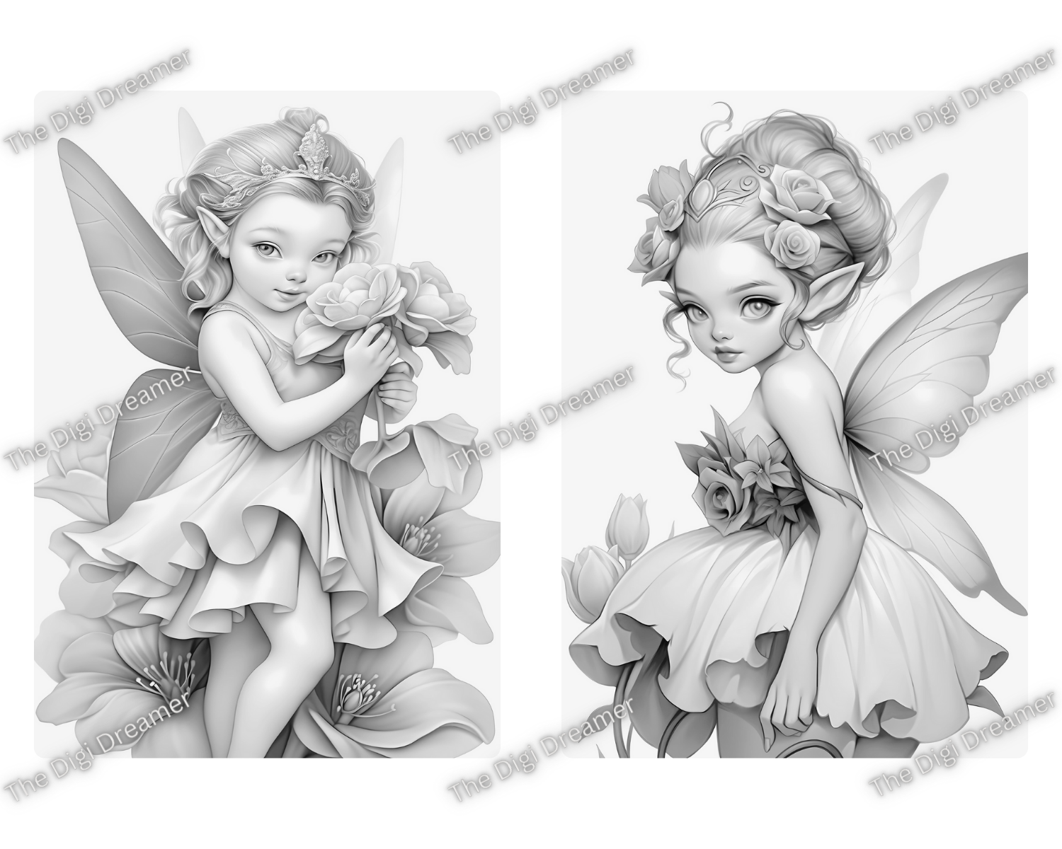 Immerse yourself in the magical world of these garden elf fairies amidst enchanting flowers. Each page is a window into a realm of fantasy and charm. Lose yourself in the calming and meditative process of grayscale coloring. Share the enchantment with friends and family by gifting them these delightful grayscale pages. Perfect for fairy enthusiasts, these pages make for a thoughtful and imaginative present.