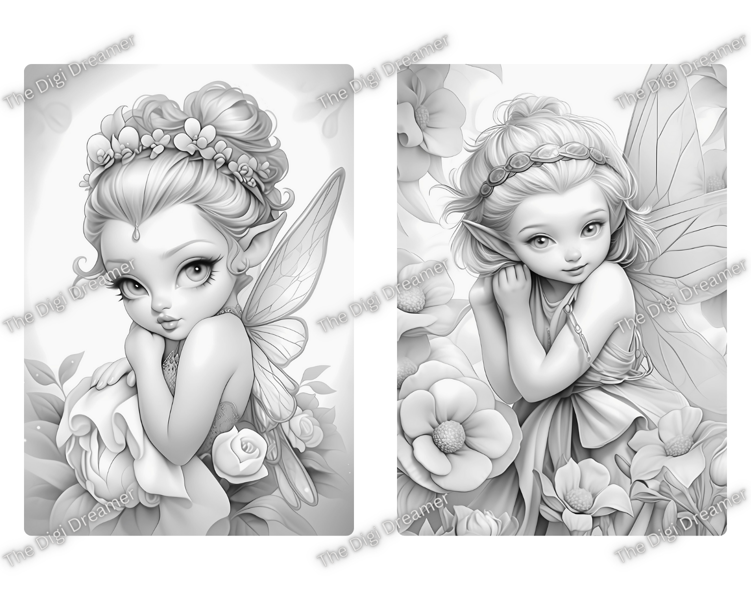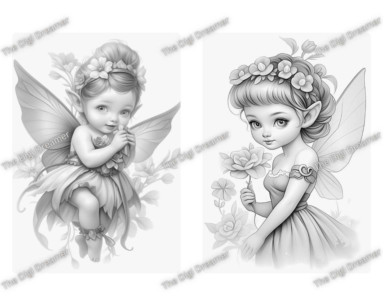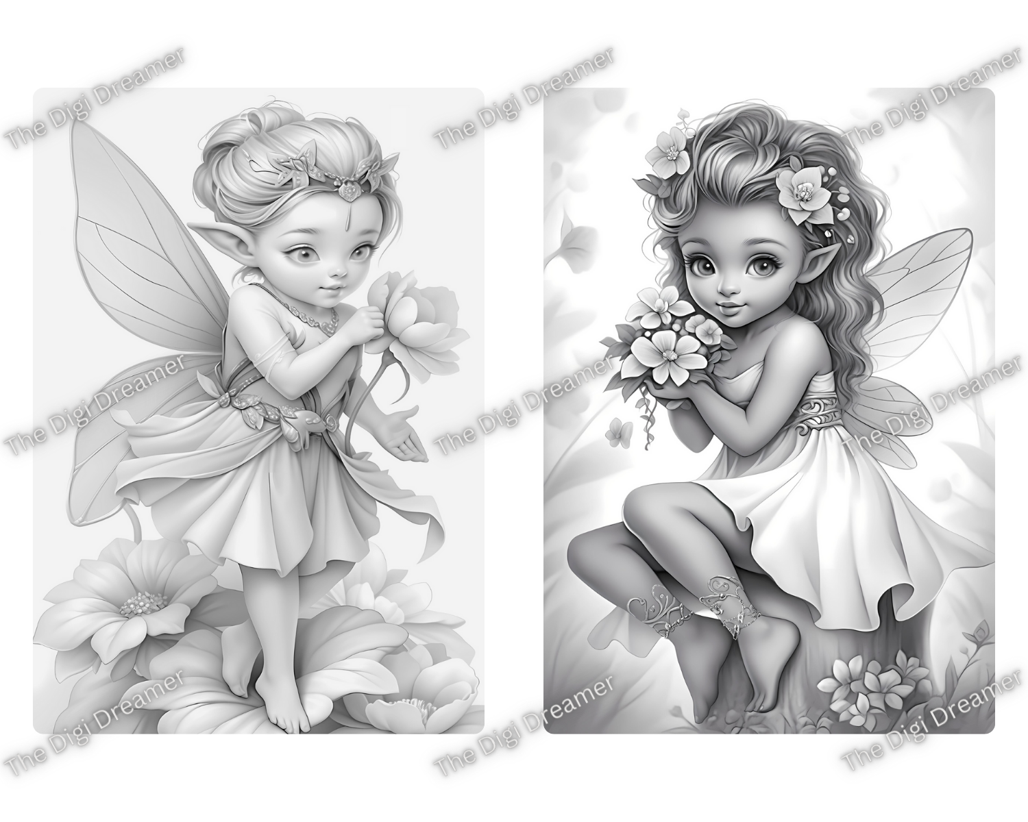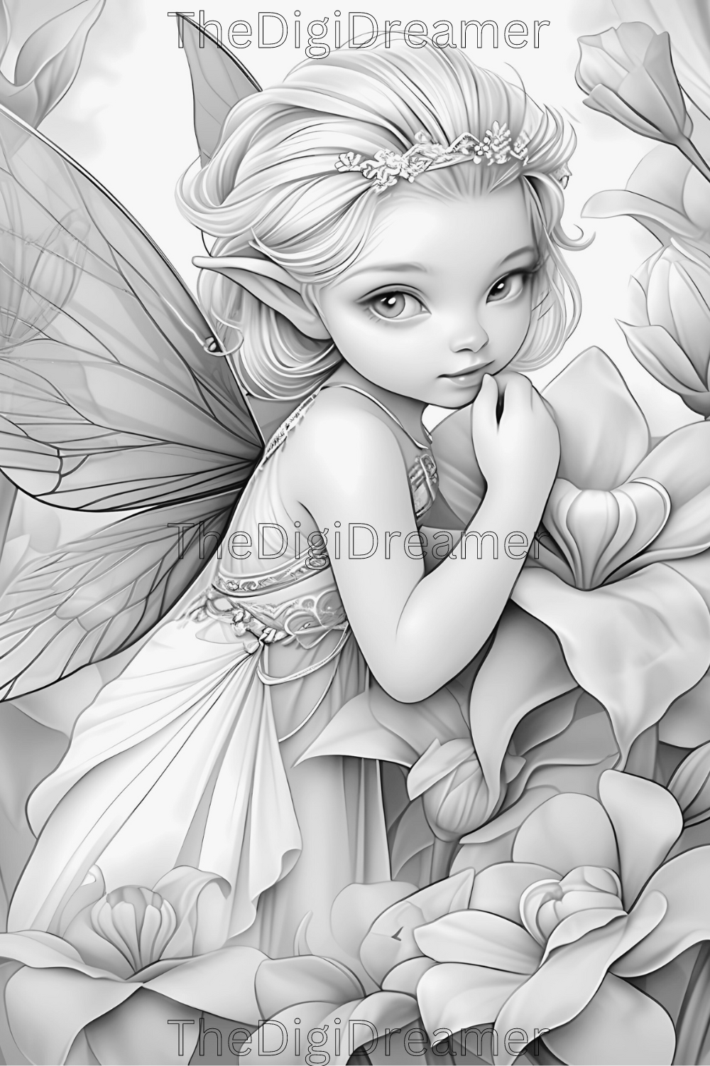 Immerse yourself in the magical world of these garden elf fairies amidst enchanting flowers. Each page is a window into a realm of fantasy and charm. Lose yourself in the calming and meditative process of grayscale coloring. Share the enchantment with friends and family by gifting them these delightful grayscale pages. Perfect for fairy enthusiasts, these pages make for a thoughtful and imaginative present.