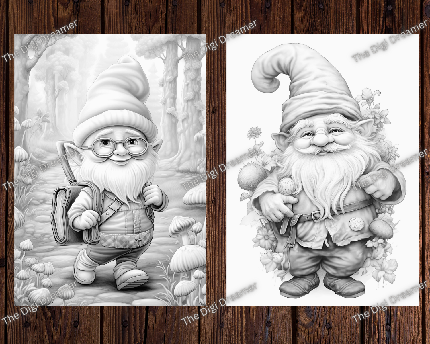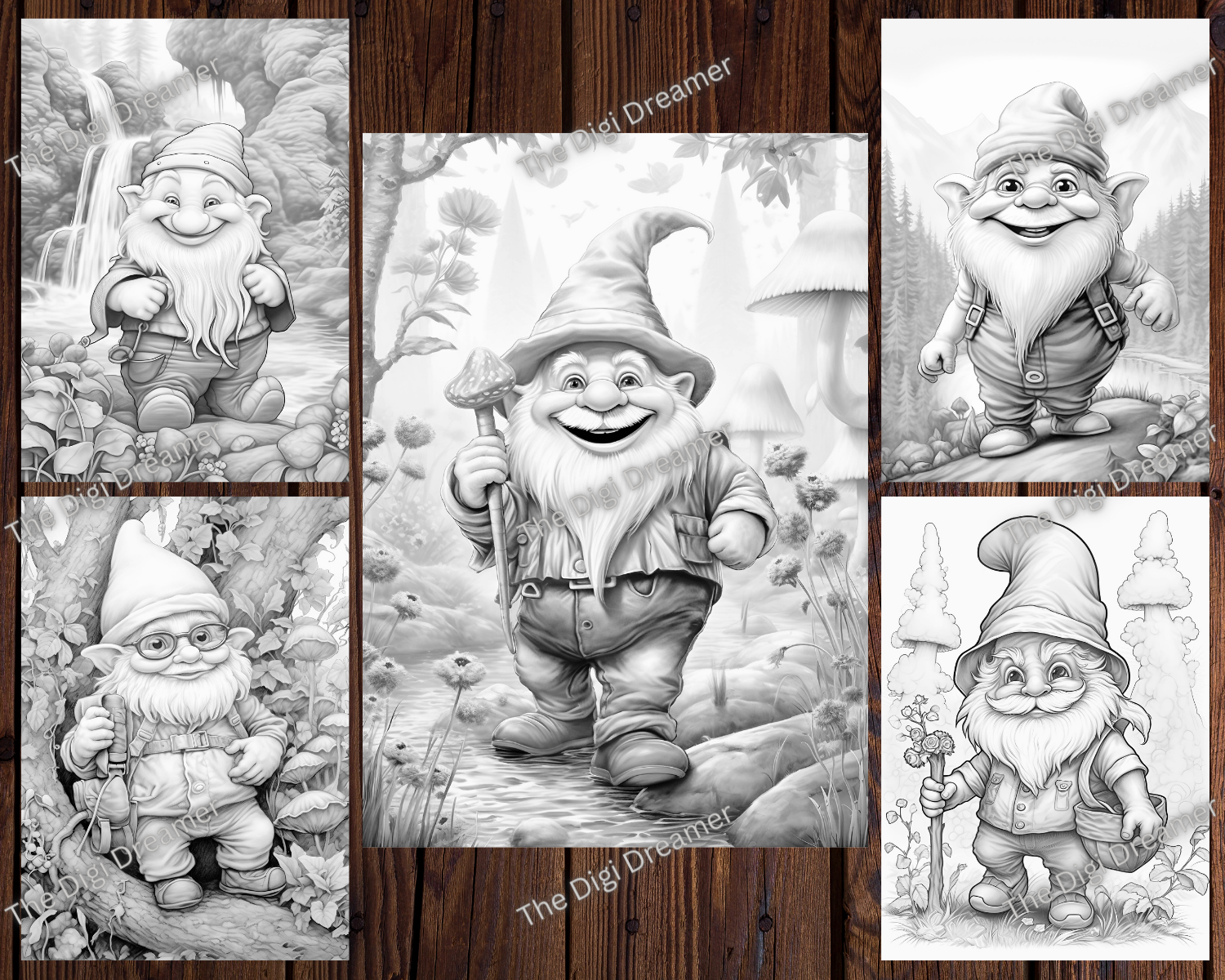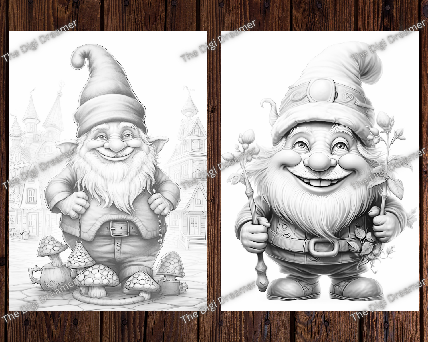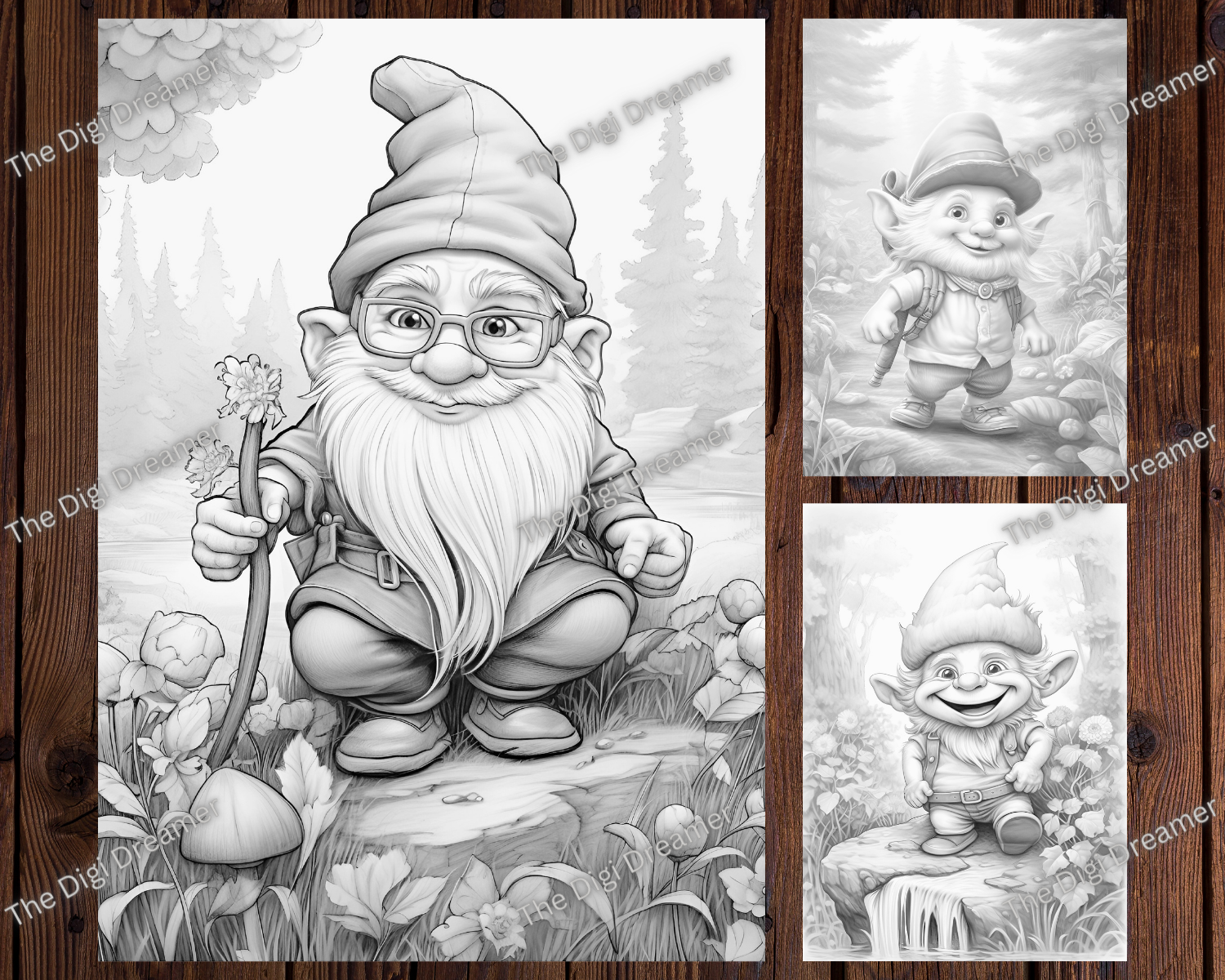 Joyful Happy Gnomes Grayscale Coloring Pages