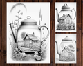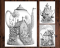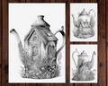 Magical Fairy Garden Kettle Houses Grayscale Printable Coloring Pages