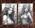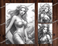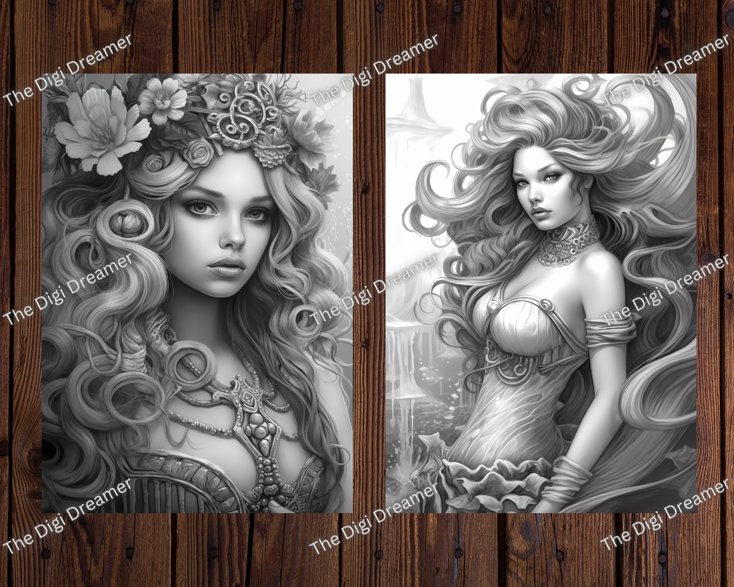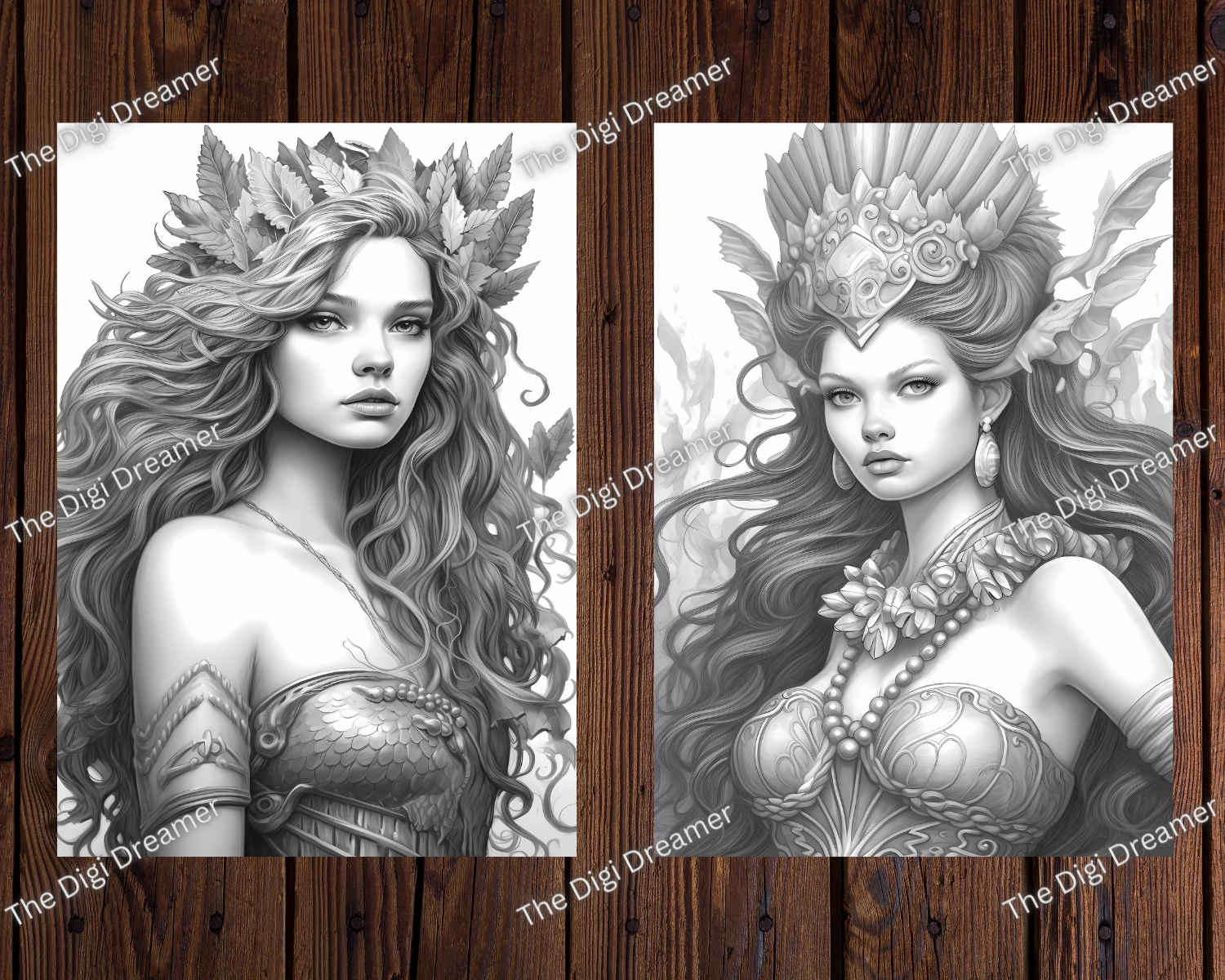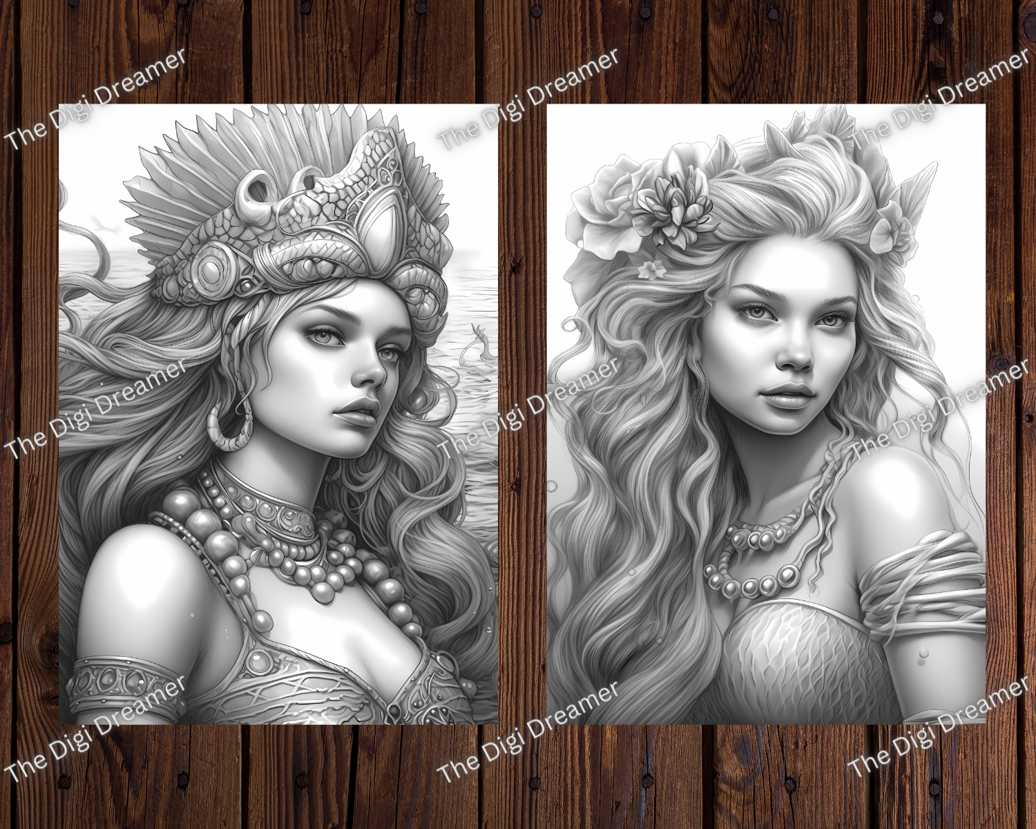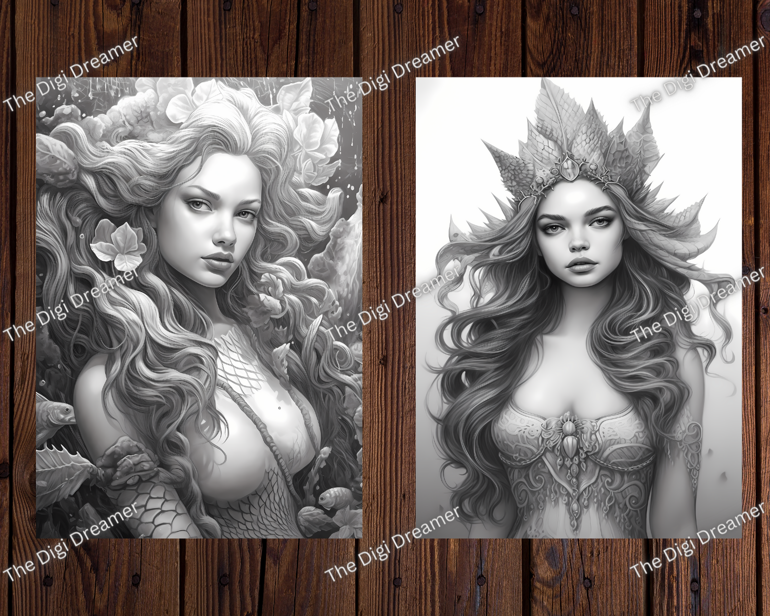 Dive into a world of enchantment with our collection of mermaid princess grayscale coloring pages designed specifically for adults. This digital download offers a captivating selection of printable coloring pages featuring elegant mermaid princesses in intricate grayscale illustrations.