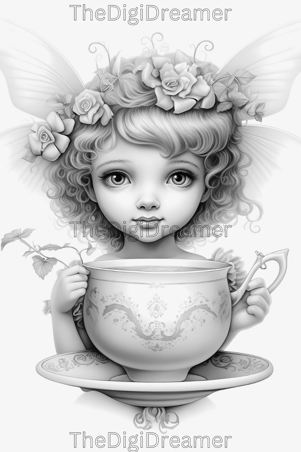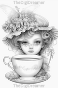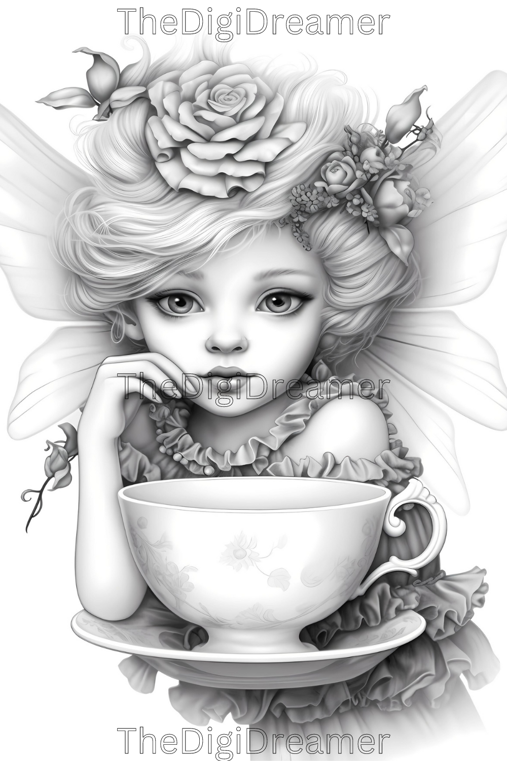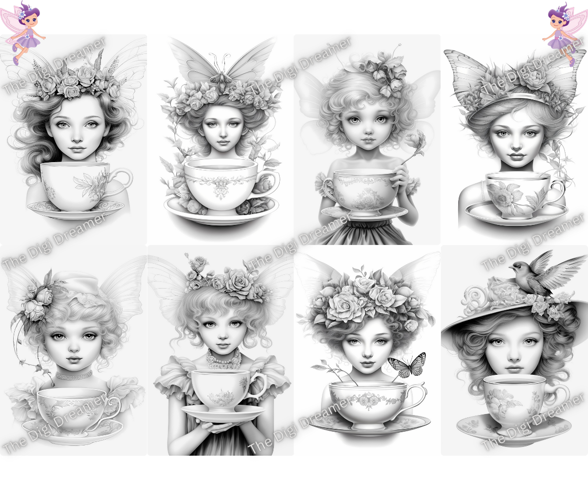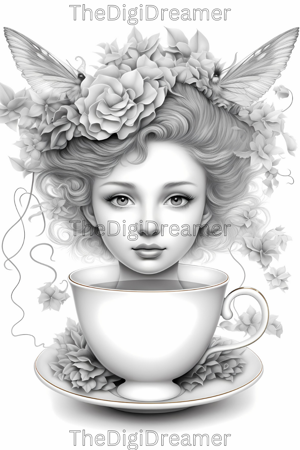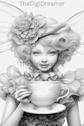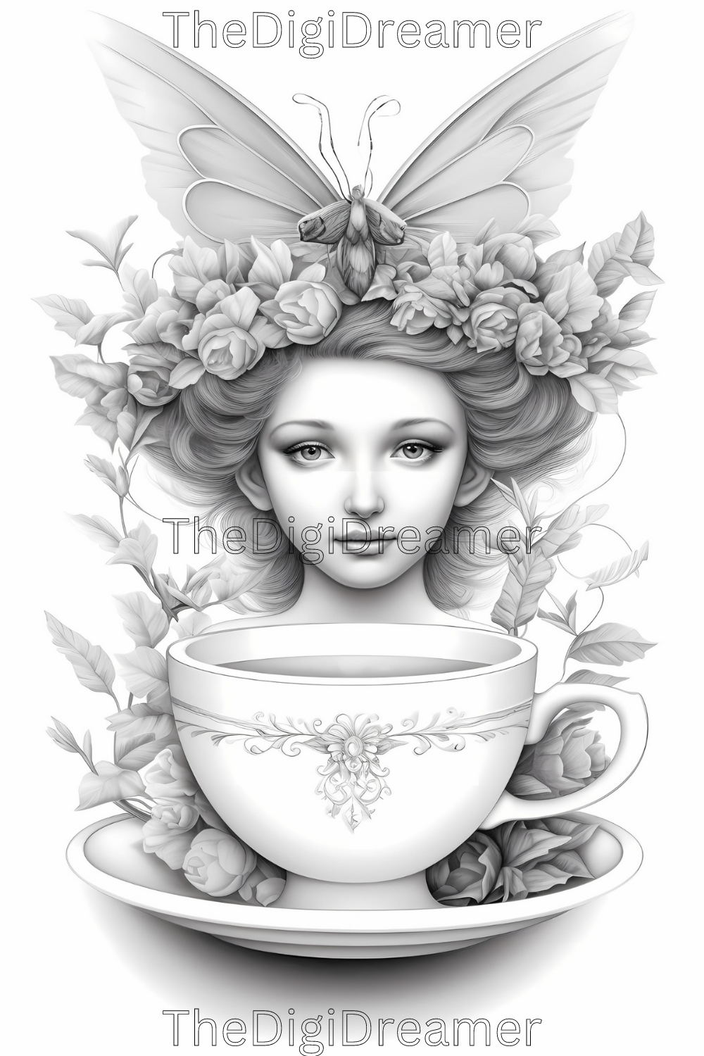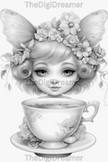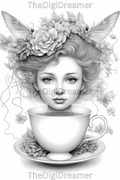 40 Tea Cup Fairies Set 2-Grayscale Printable Coloring Pages For Adults, Digital Download