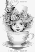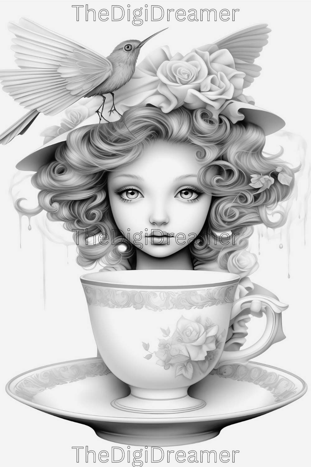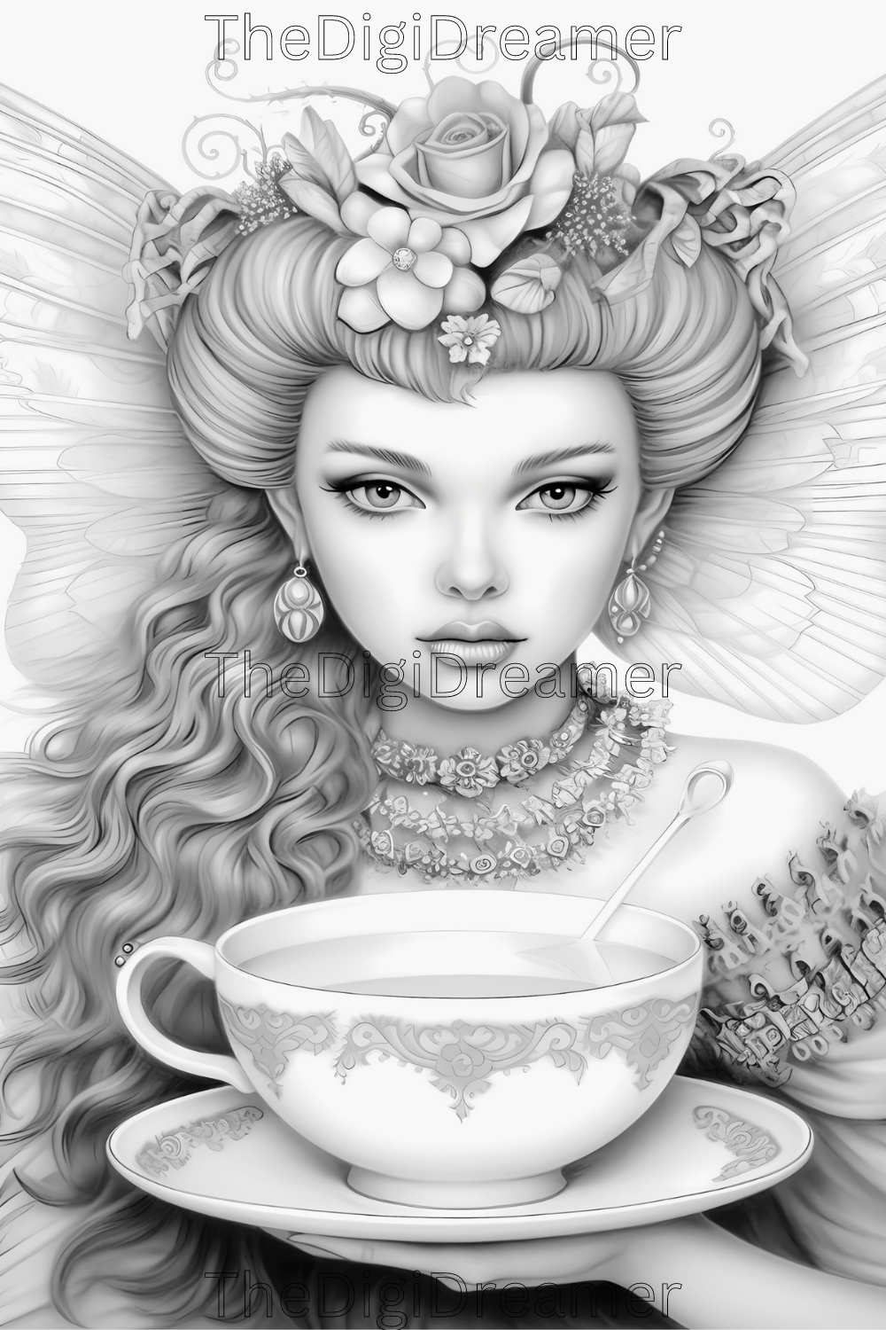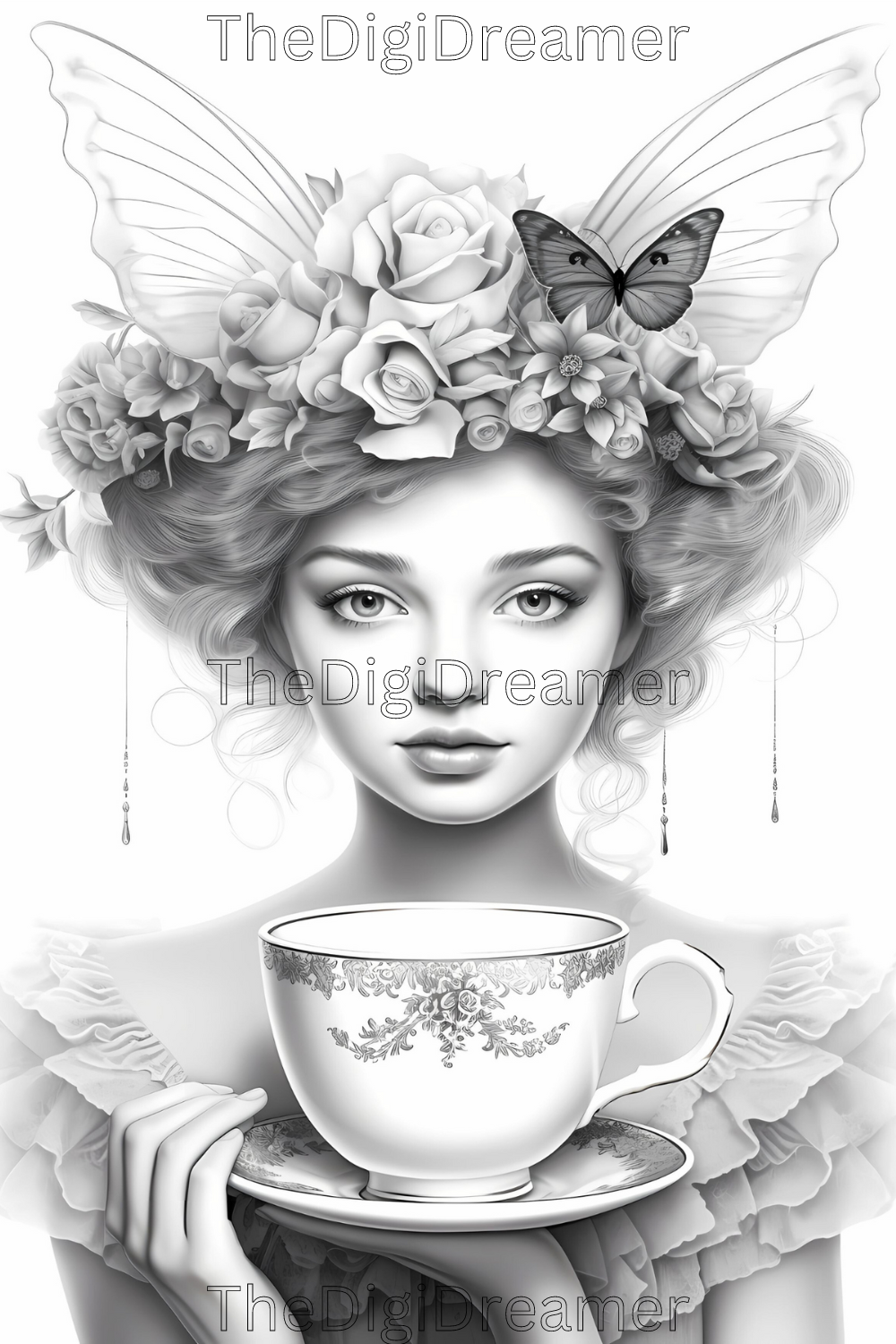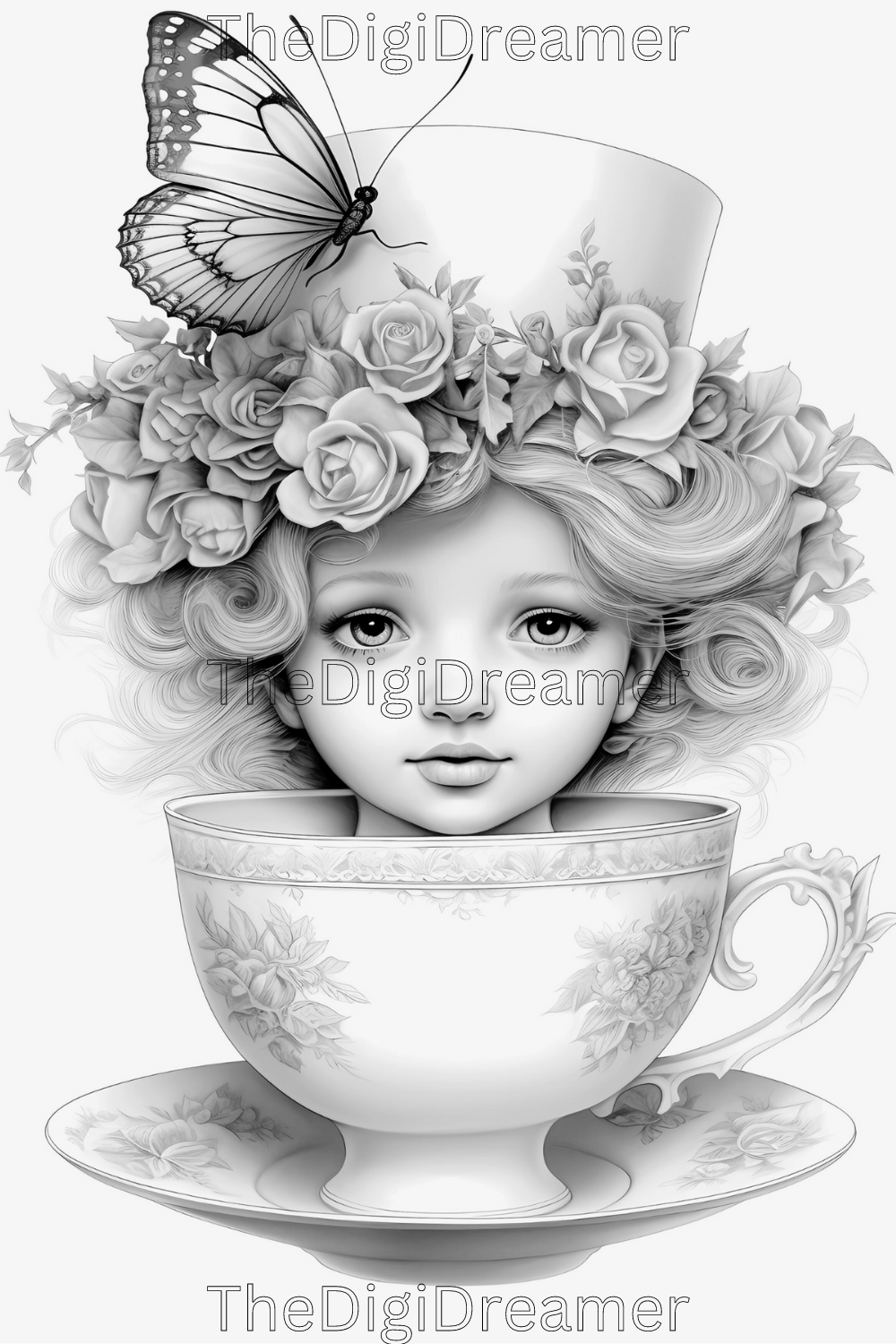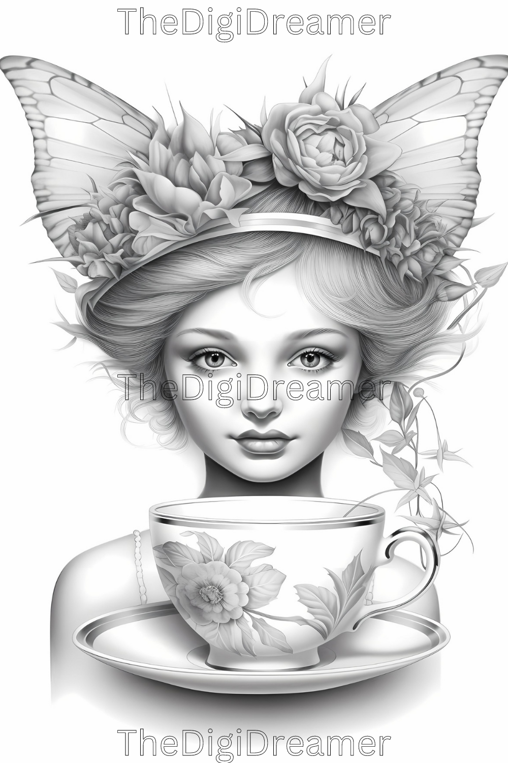 40 Tea Cup Fairies Set 2-Grayscale Printable Coloring Pages For Adults, Digital Download