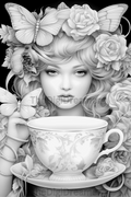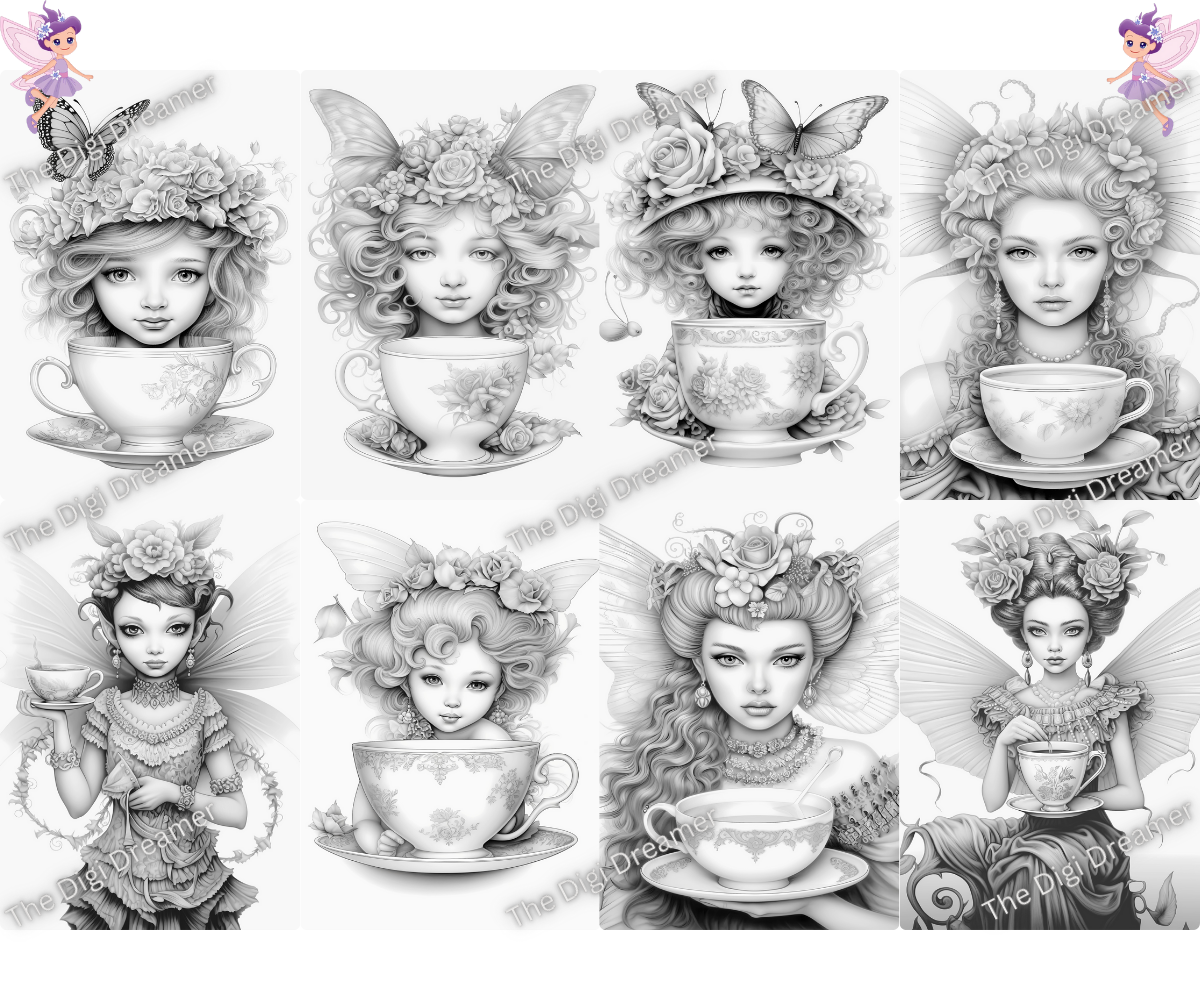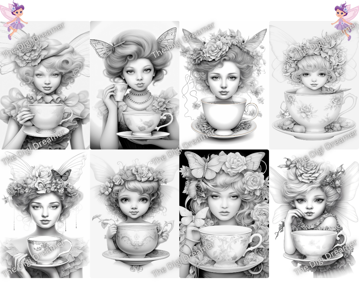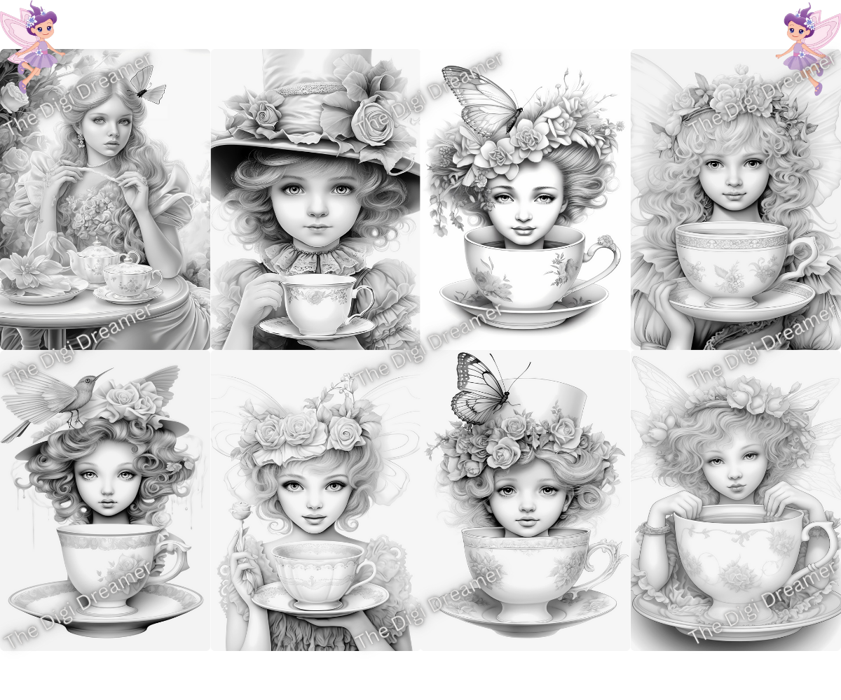 Step into a world of enchantment with our tea cup fairies grayscale coloring pages. Immerse yourself in the whimsical realm of delicate fairies nestled within charming tea cups. This coloring book includes 40 coloring pages.