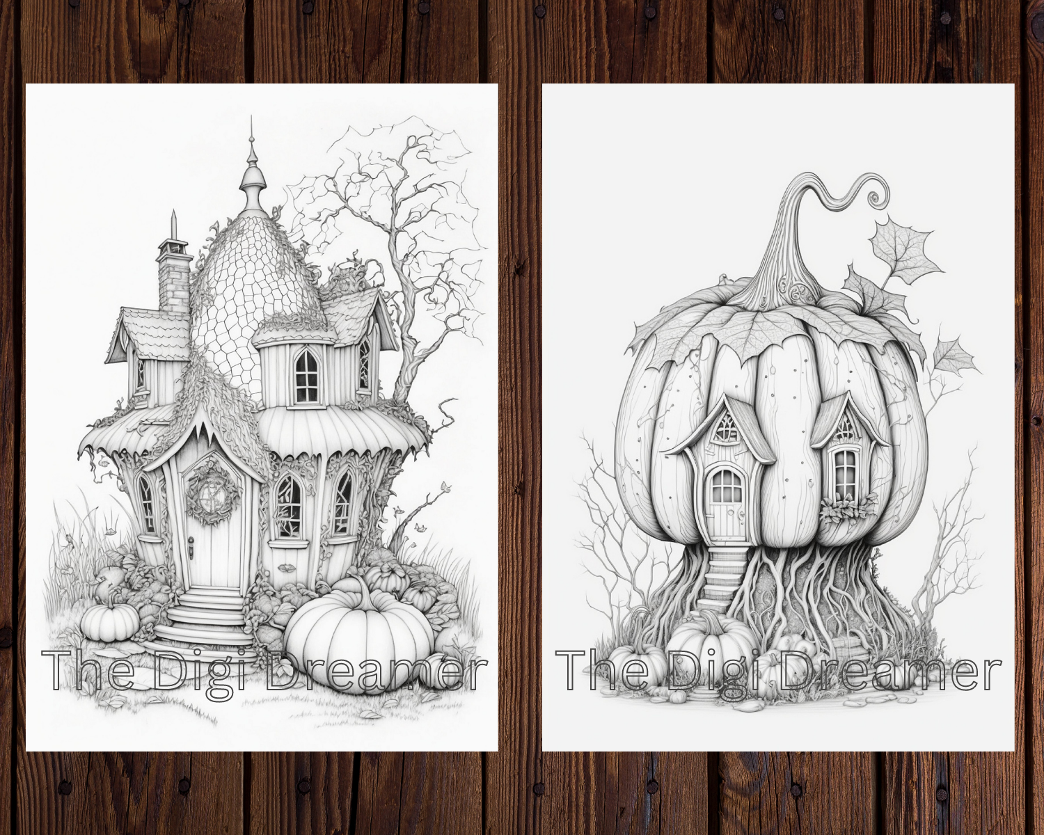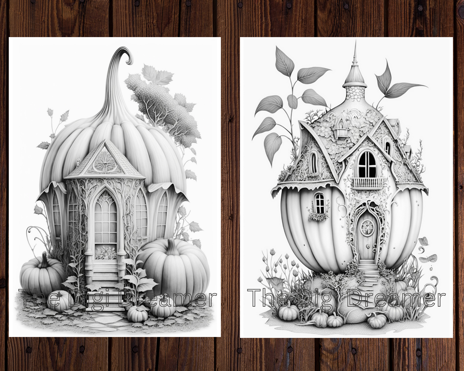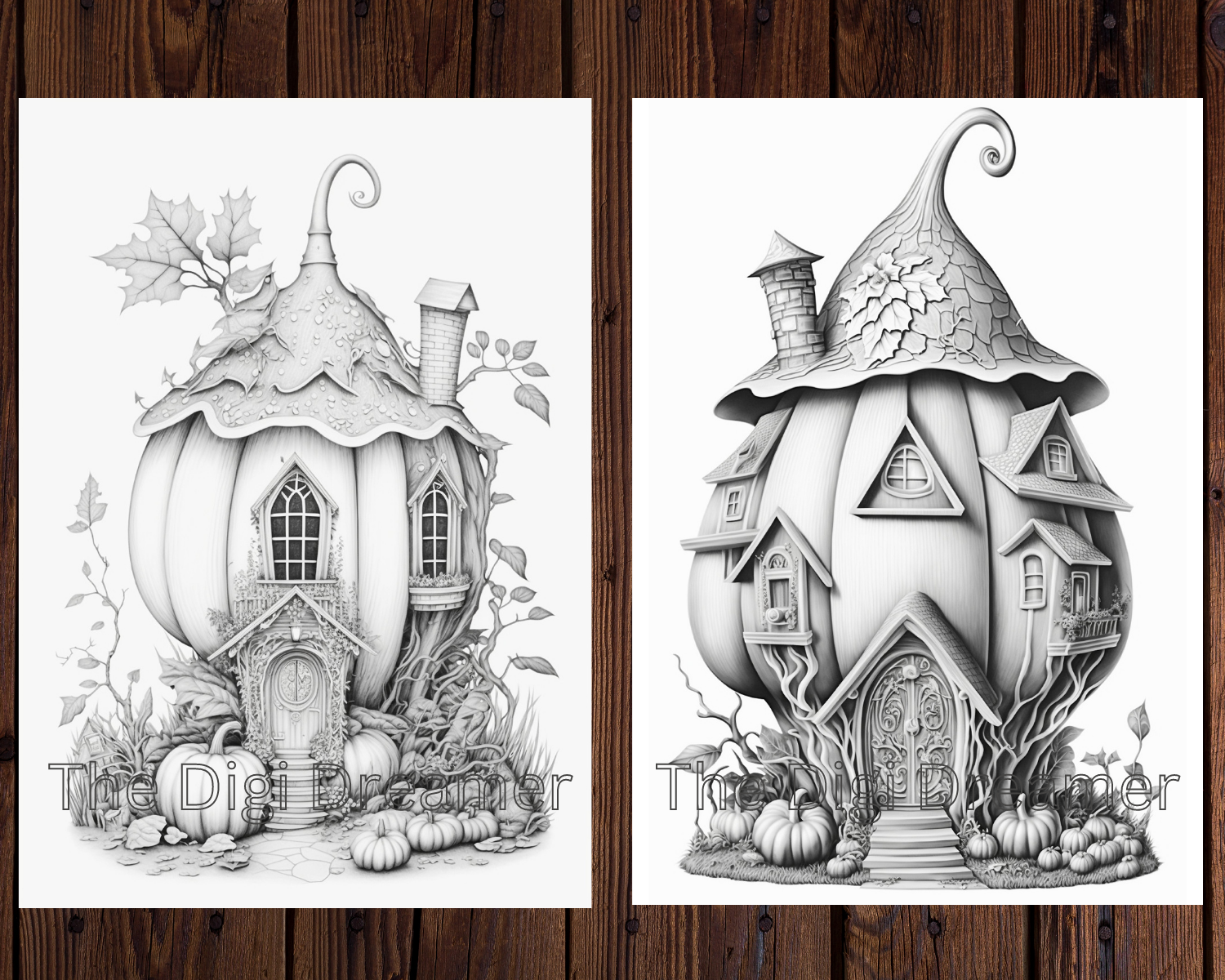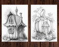 Whimsical Pumpkin Houses - Grayscale Printable Coloring Pages for Adults