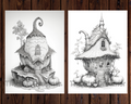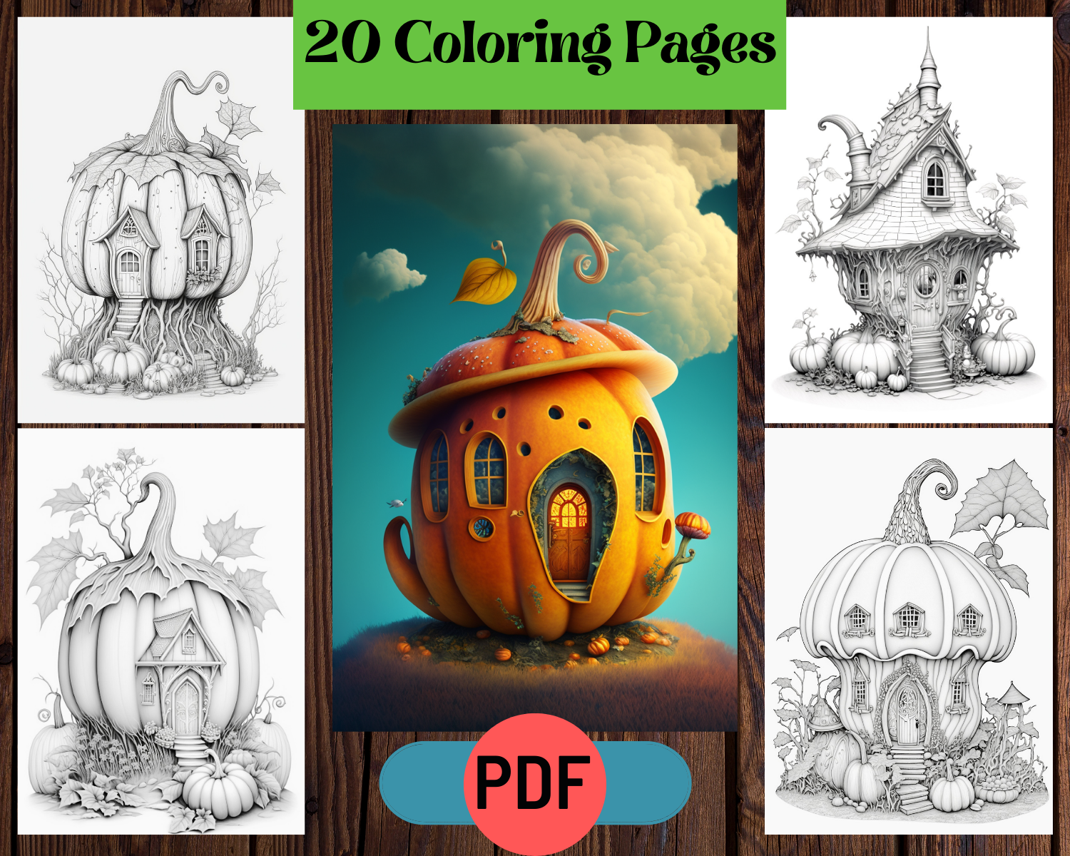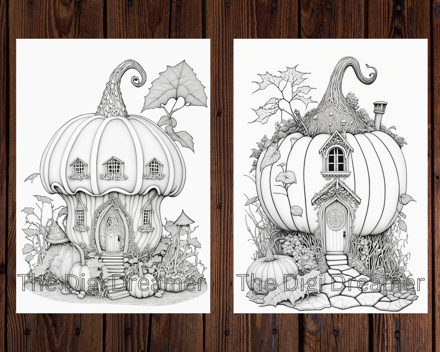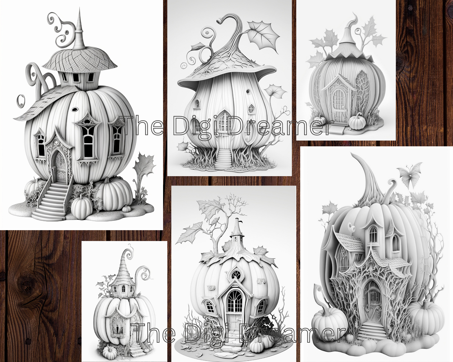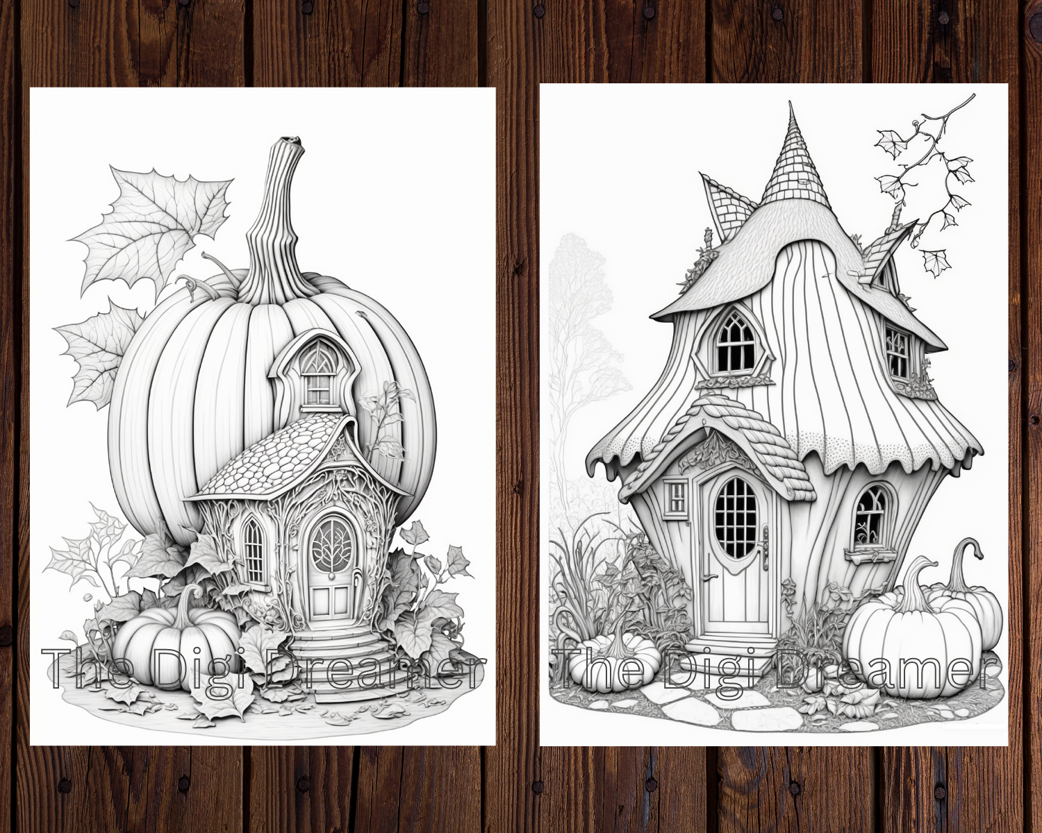 Whimsical Pumpkin Houses - Grayscale Printable Coloring Pages for Adults